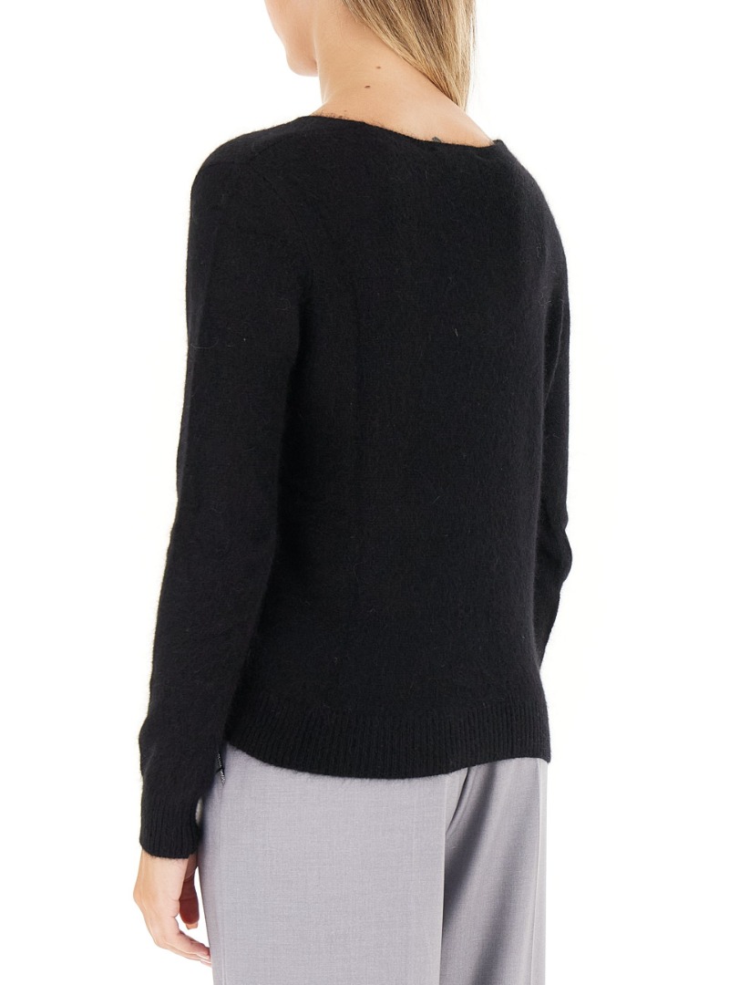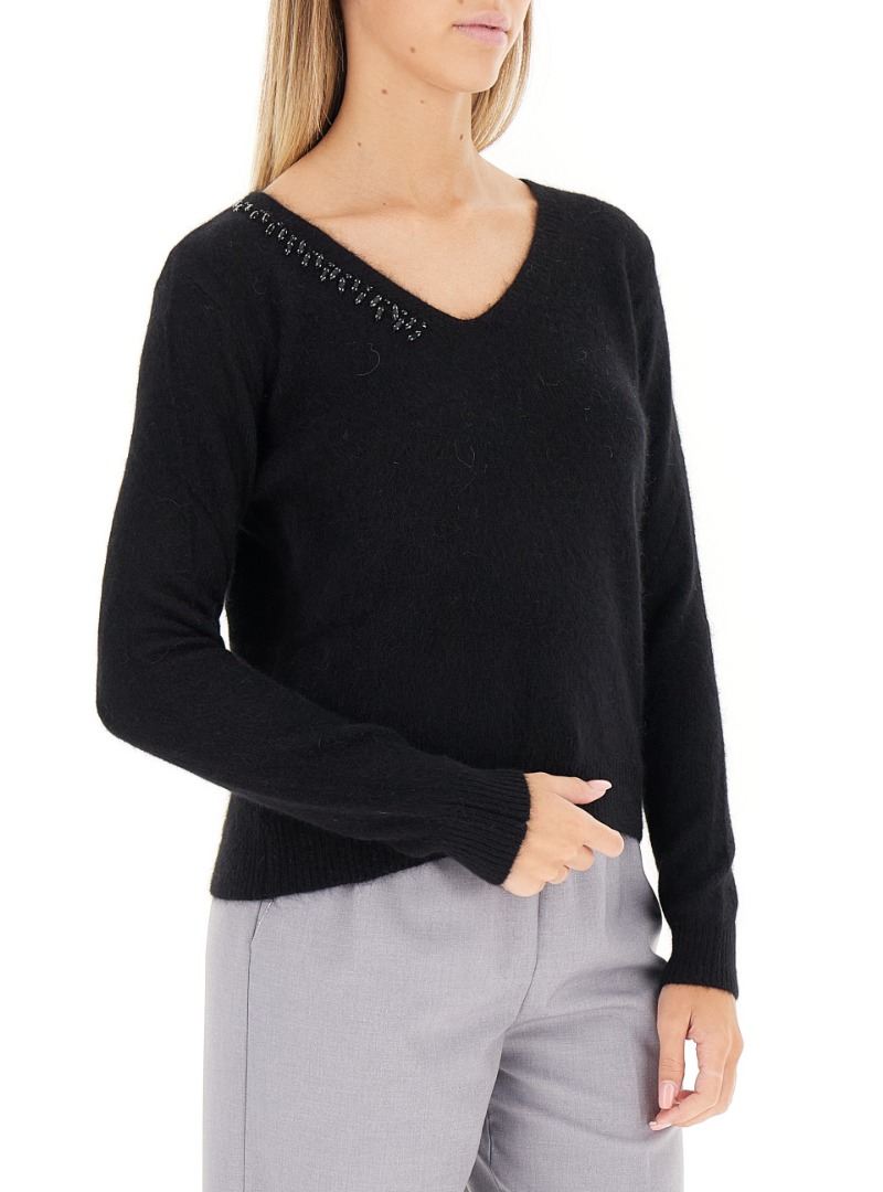 This sweater, characterized by a minimal style and an essential cut, is embellished with a delicate stone detail on the V-neck. The garment has ribbed edges and a regular fit.