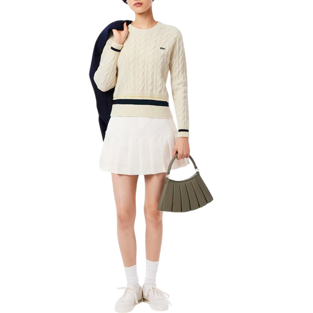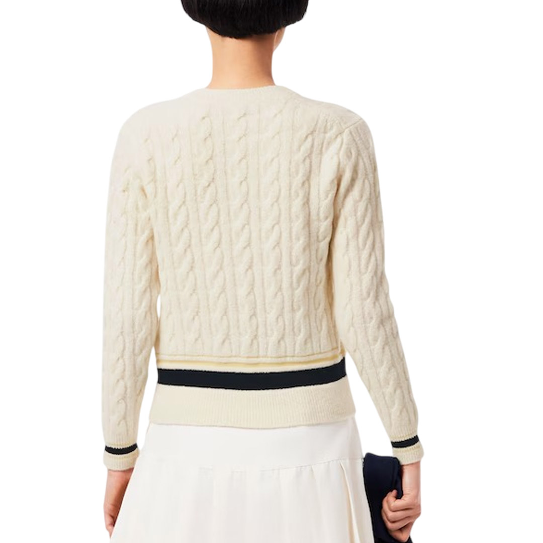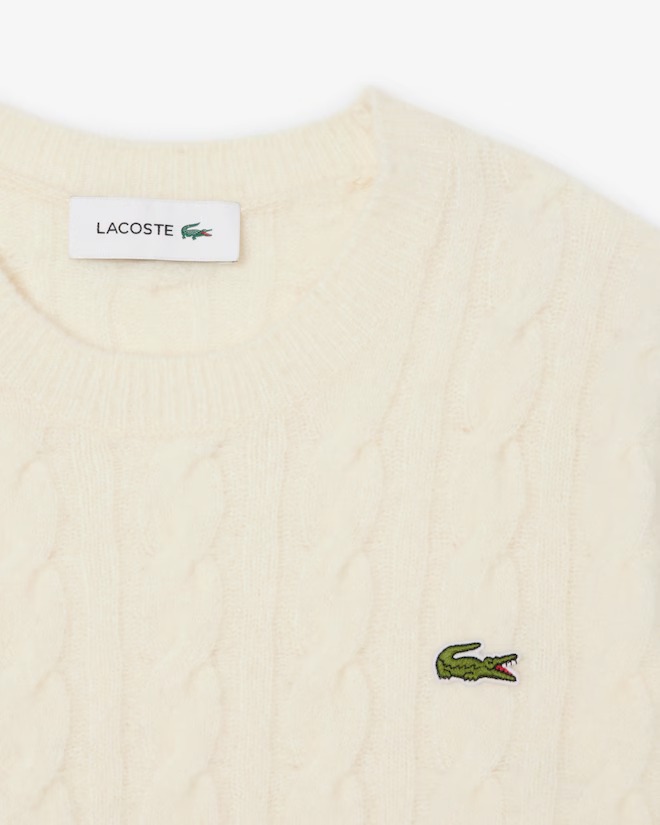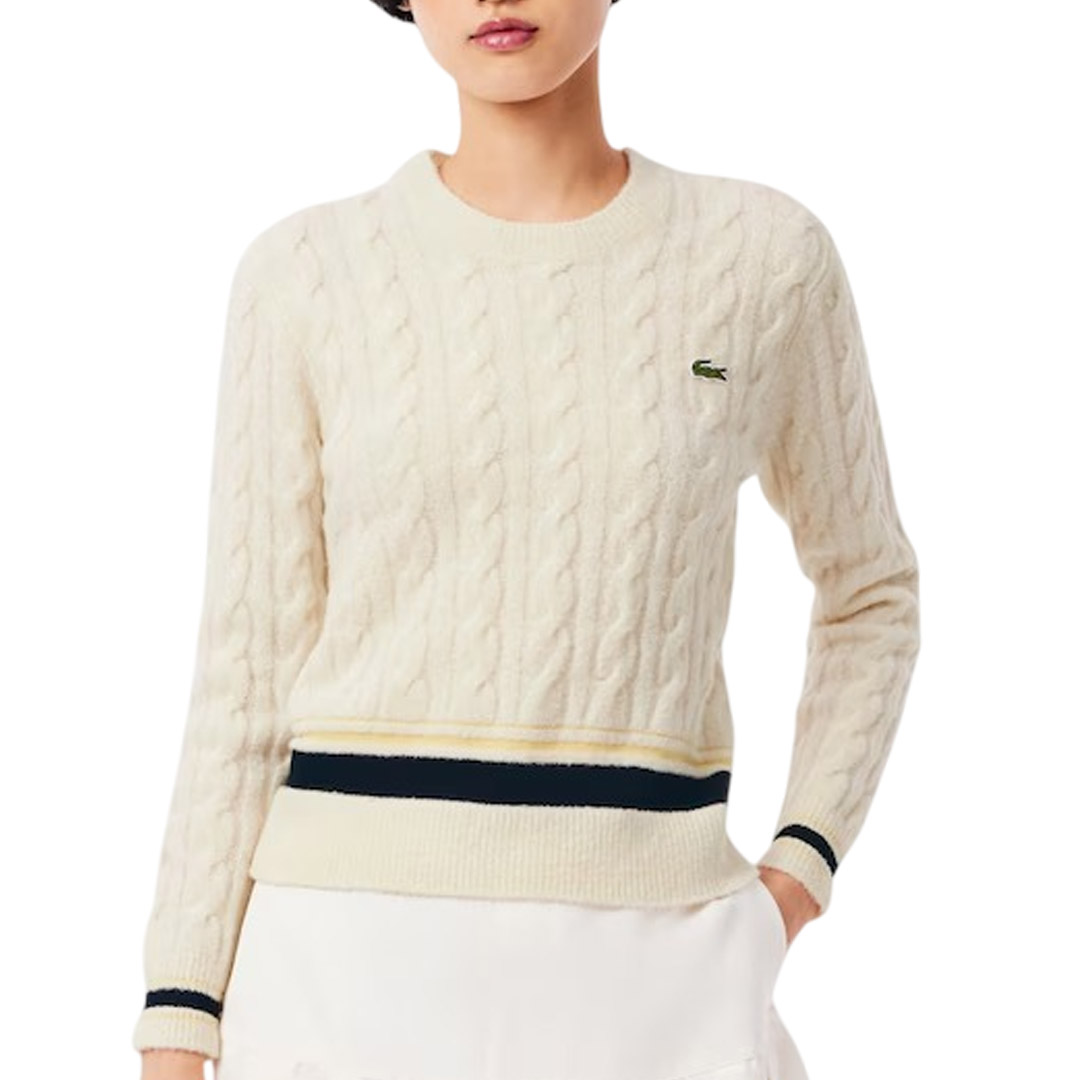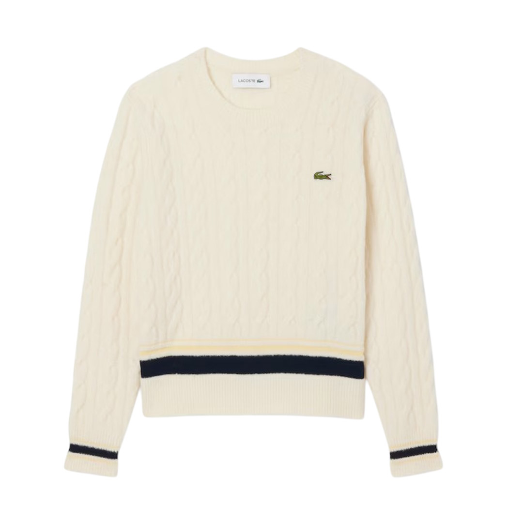 This sweater is the fruit of 90 years of Lacoste knitwear expertise. A tribute to Lacoste's tennis heritage, it features a cable knit with a narrow stripe design. A generous, contemporary fit, finished with our signature crocodile for style points. Cable knit with wool from animal-friendly sources. Natural classic fit with comfortable sleeves. Crew neck. Embroidered crocodile sewn onto the chest.
