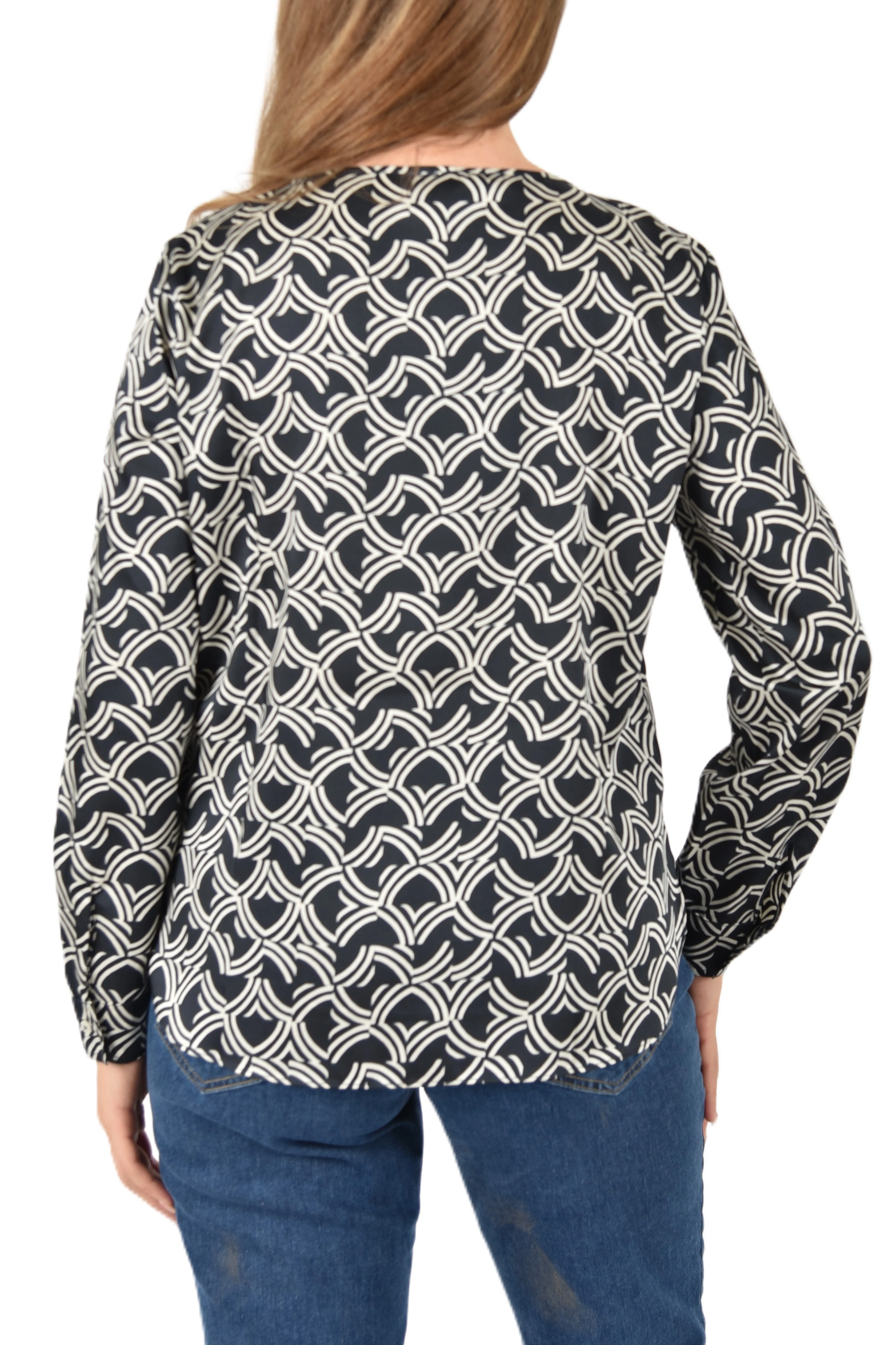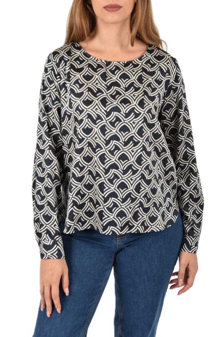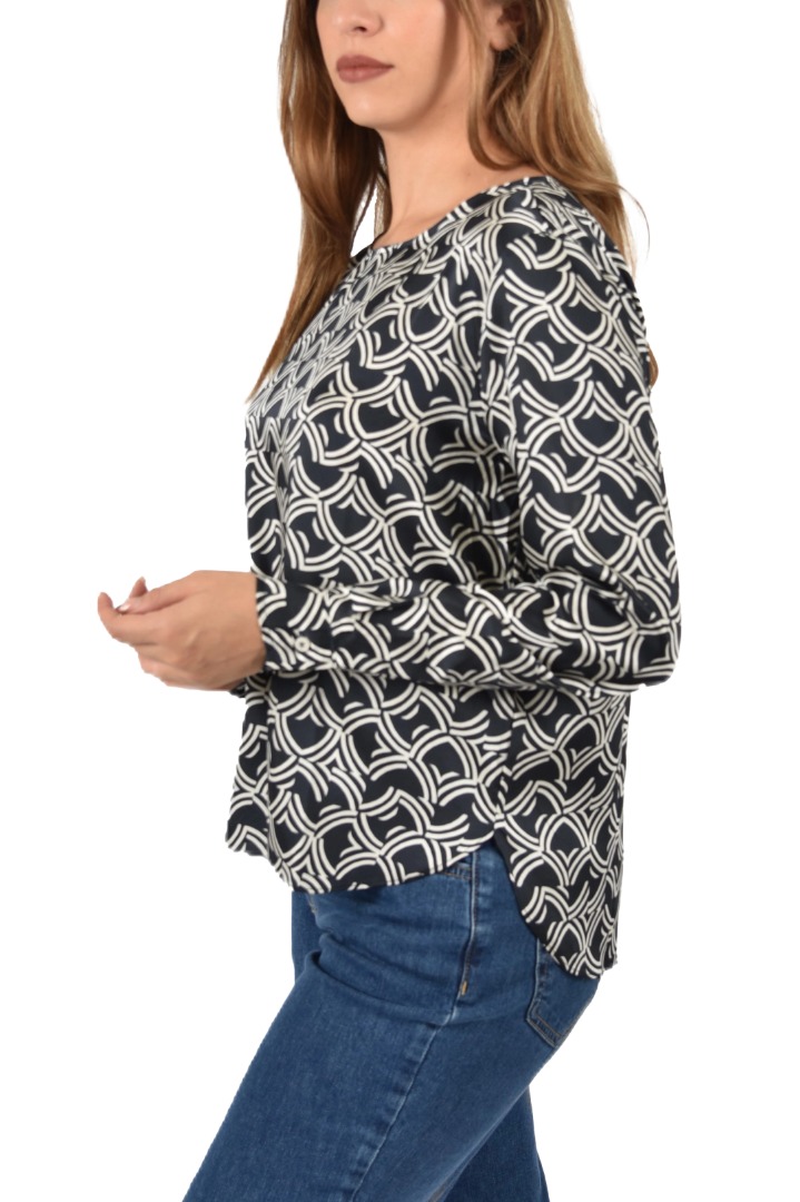 Printed technical twill blouse with a straight, luminous, and flowing fit. The boat neck and long sleeves with buttoned cuffs add a feminine touch, while the rounded, asymmetrical hem adds movement and understated elegance. Straight fit. Boat neck. Long sleeves with buttoned cuffs. Rounded, asymmetrical hem with side slits.