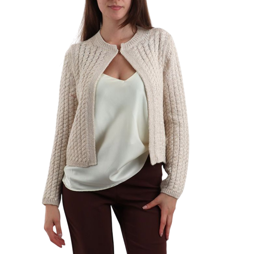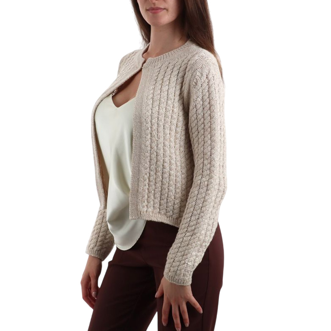 Knit cardigan in a viscose, wool, and cashmere blend with paillettes. Straight fit, rounded neckline, gold hook closure, and ribbed edges.