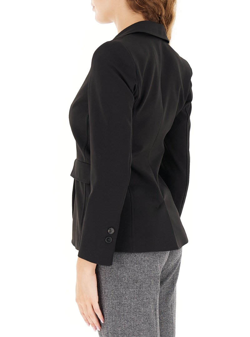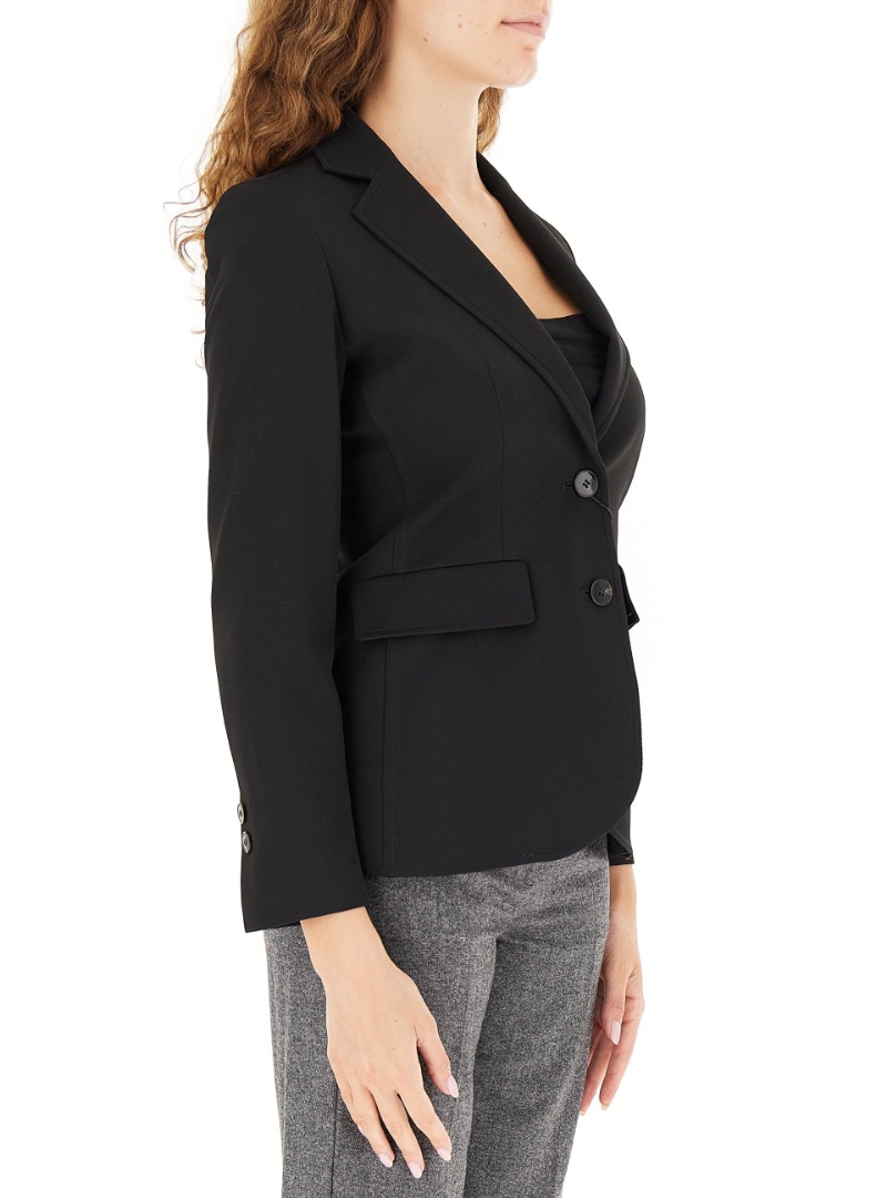 Two-button blazer in diagonal stretch fabric with a lapel collar. Side flap pockets and raised side seams. Center vent at the back hem.
