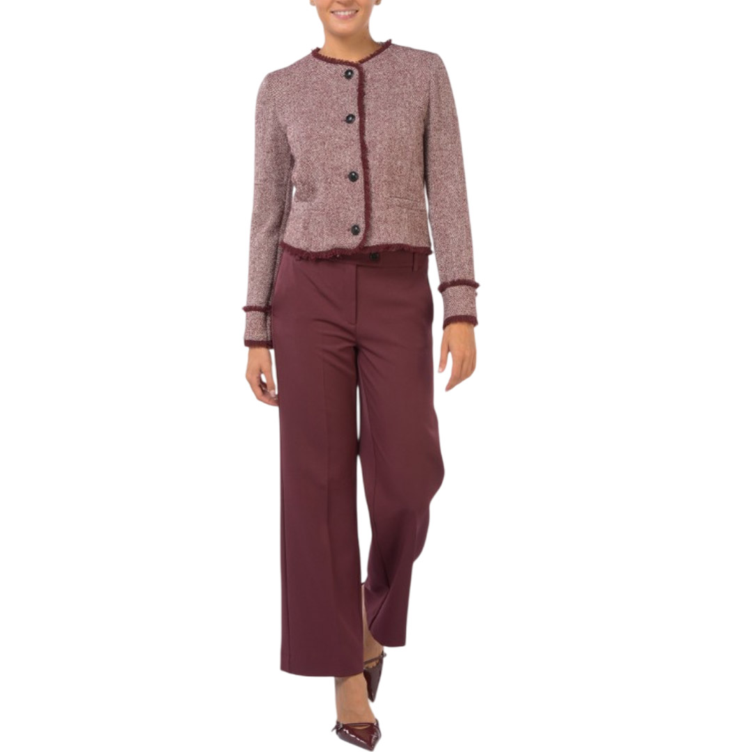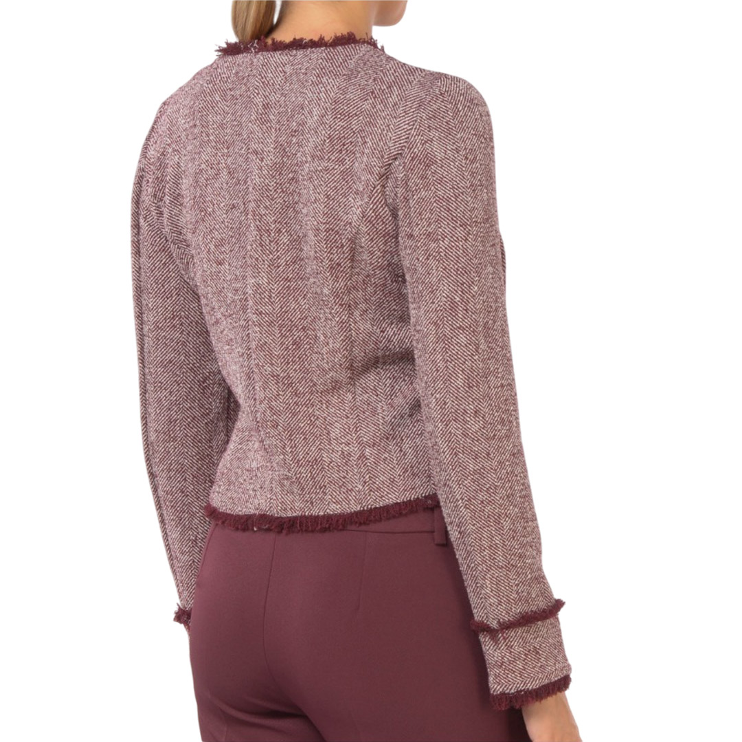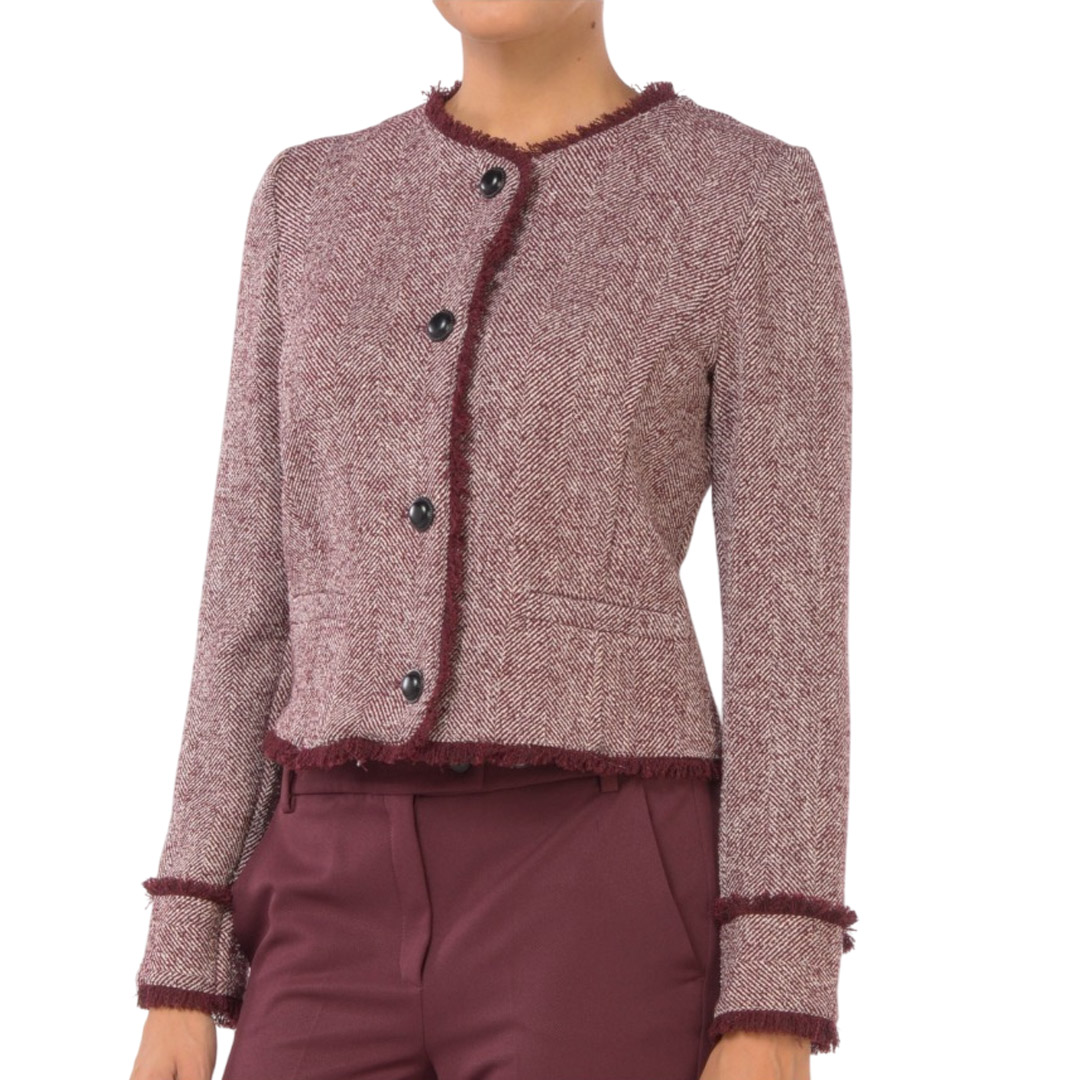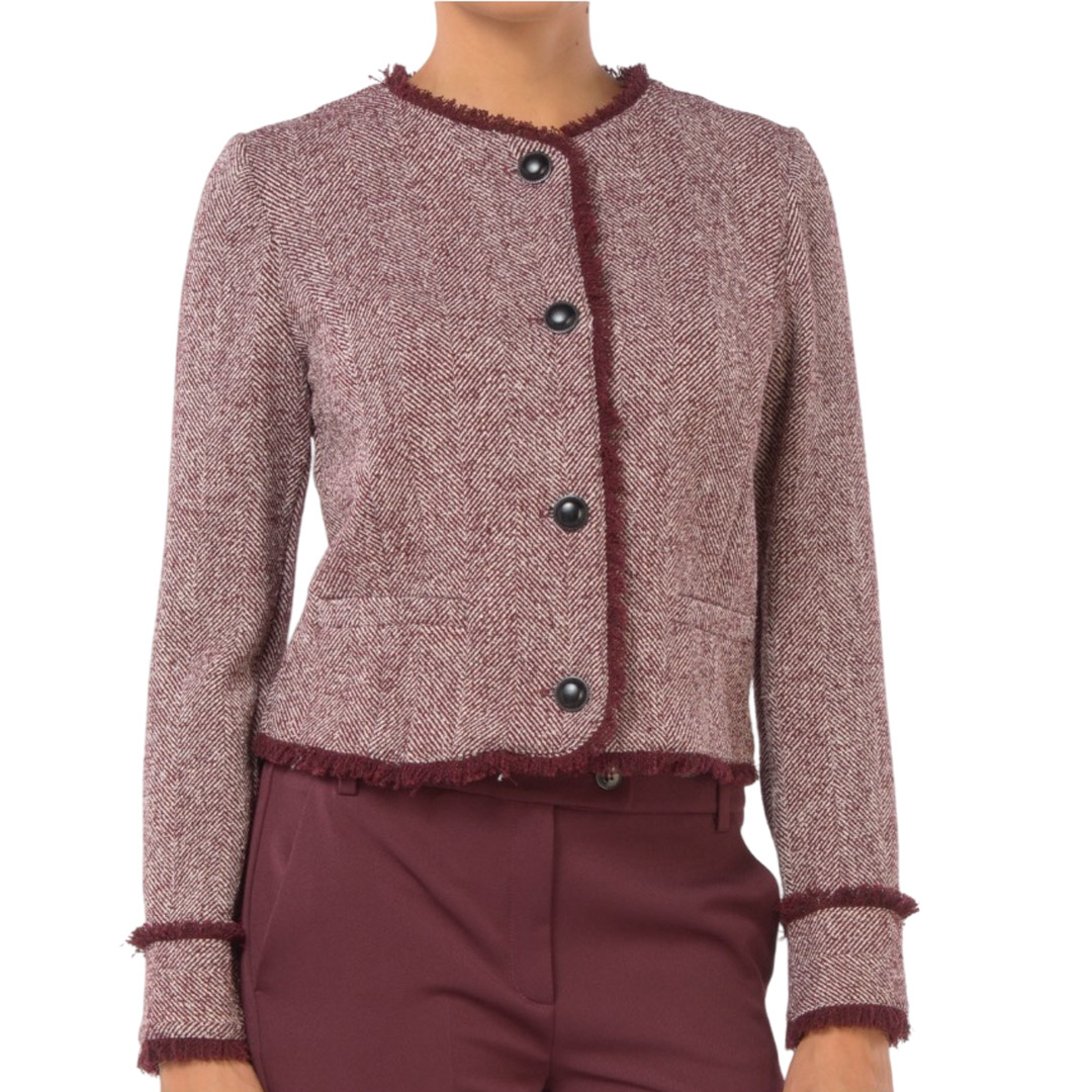 Checkered jacket with contrasting herringbone pattern and micro-fringe appliqués on the trim, front fastening with contrasting-coloured visible buttons, crew neck, long sleeves, two fake front welt pockets, unlined.