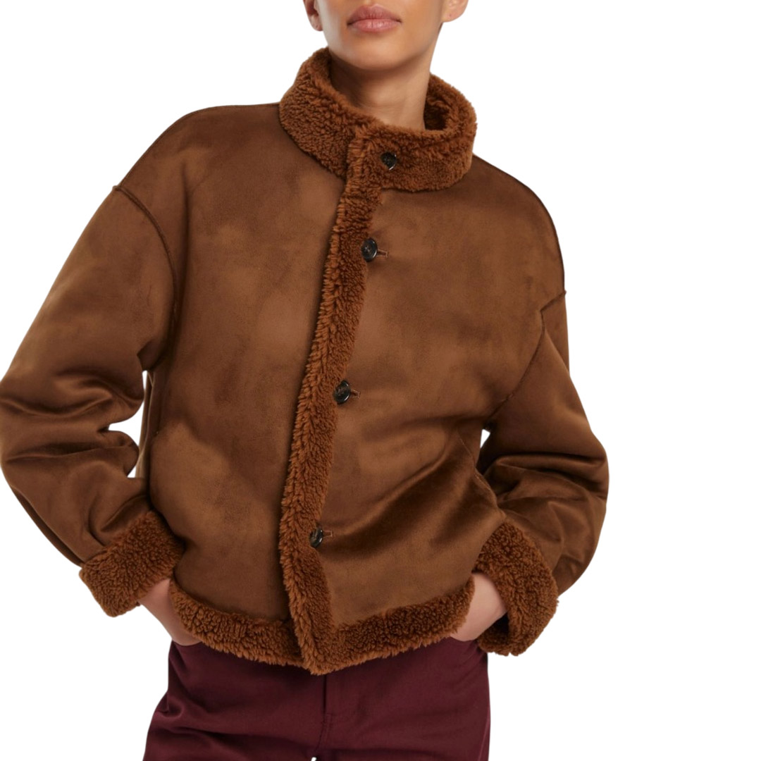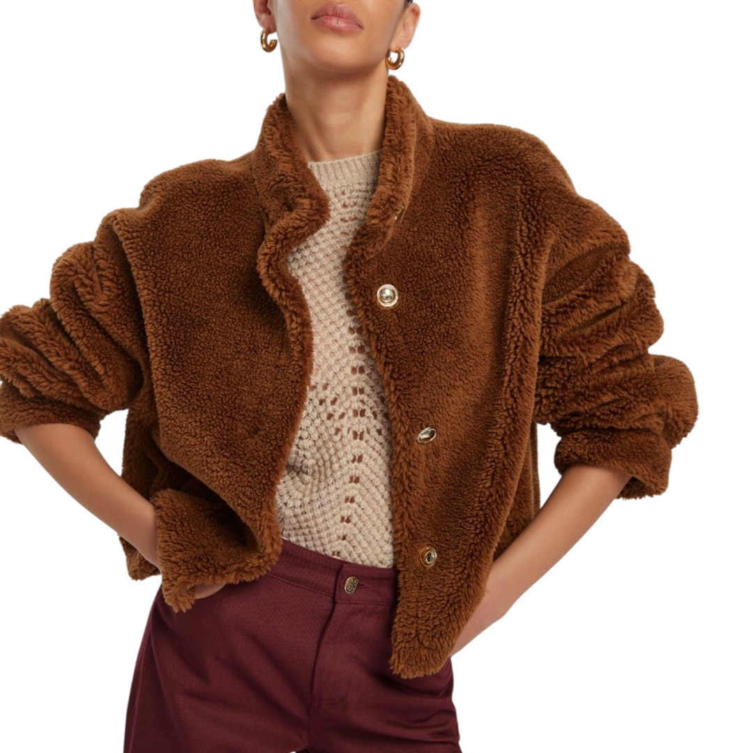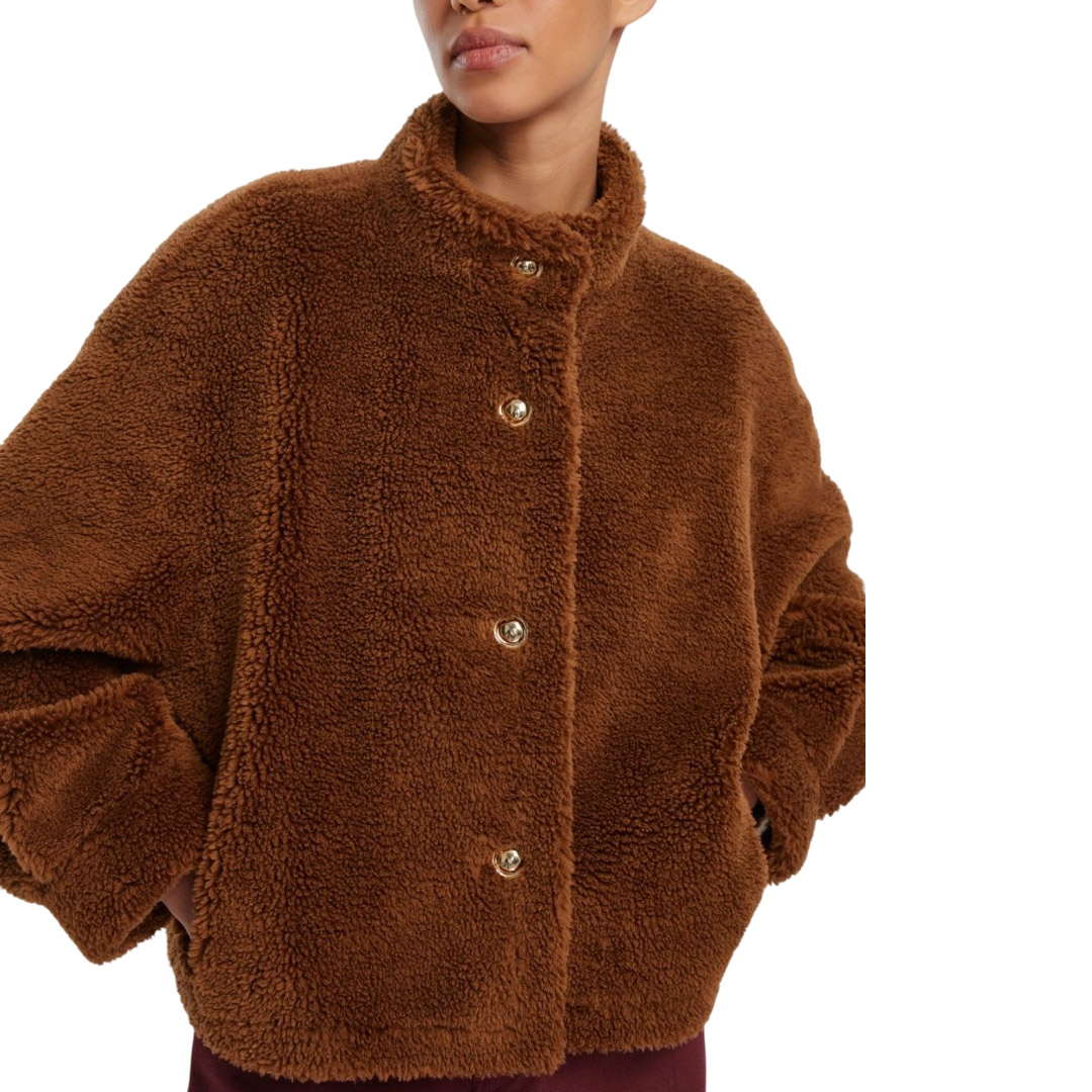 A glamorous choice to wear over and over again, this reversible bomber jacket features one side in furry knit and the other in smooth, soft fabric. Play with style and choose what you will be today. Reversible bomber jacket with one side in fluffy knit and the other in smooth, soft fabric. Relaxed fit. Stand-up collar. Horn-effect button closure on the outside. Inset side pockets. Elasticated insert at the bottom.