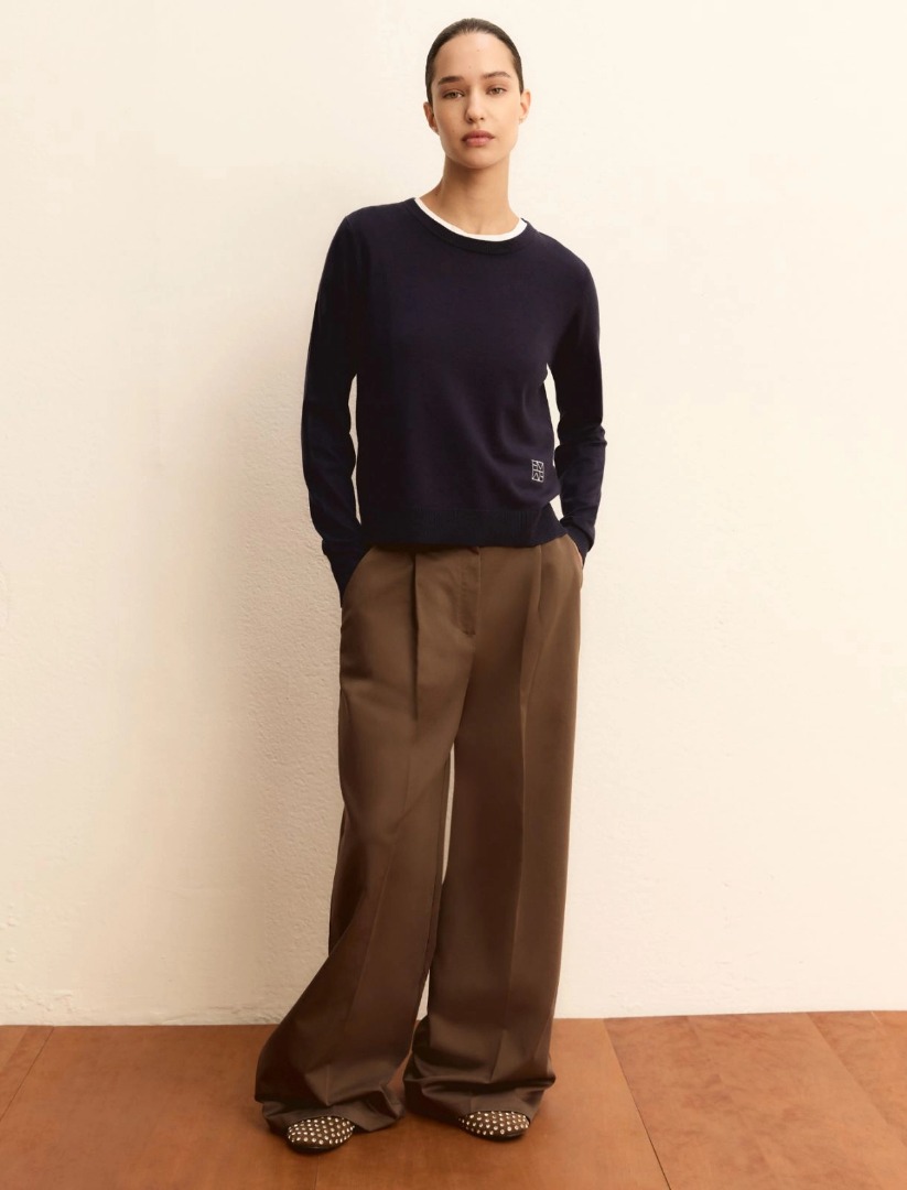The most special basic in the collection? This crew neck sweater in stretch viscose, with clean lines and the personalized touch of embroidery at the bottom. Stretch viscose blend sweater Regular fit Crew neck Contrasting monogram embroidery motif Ribbed bottom and cuffs