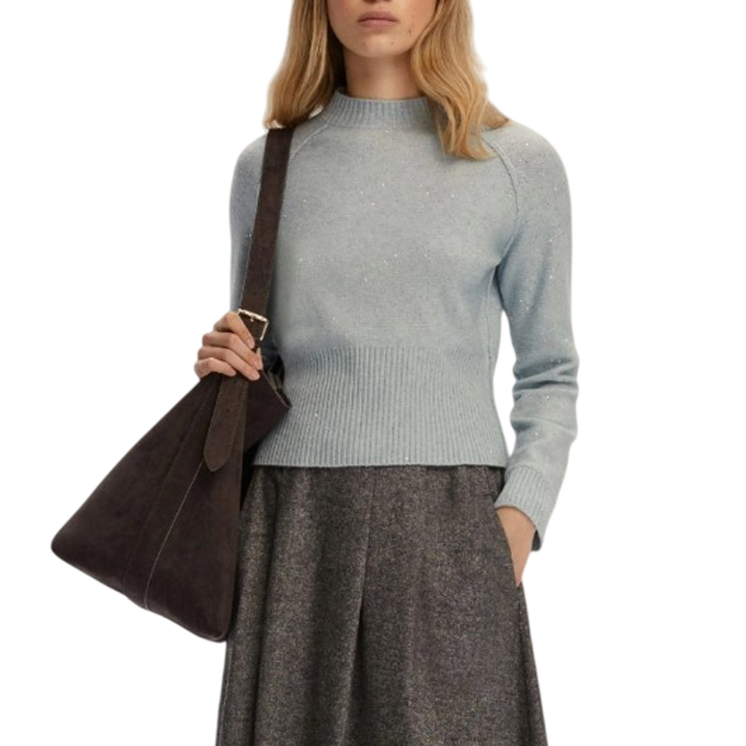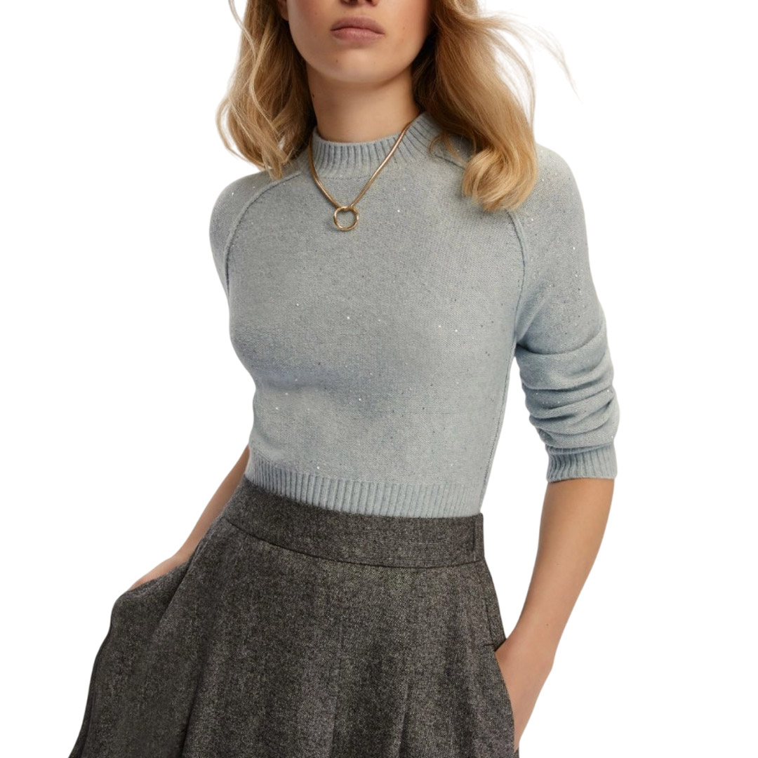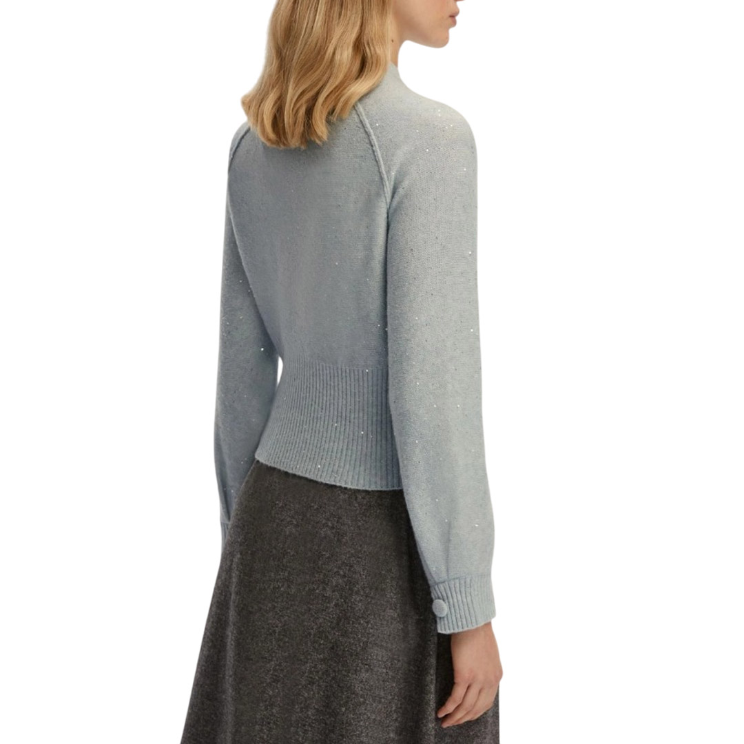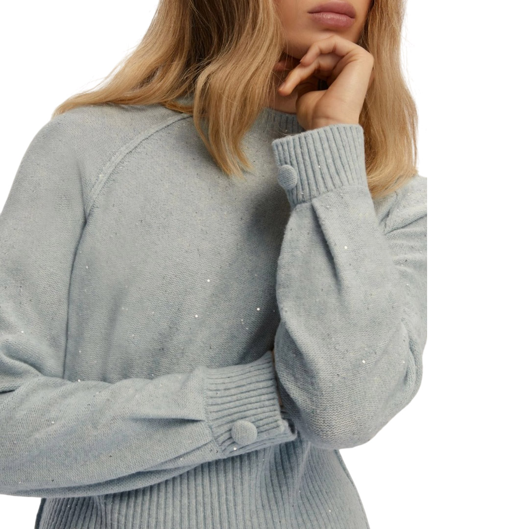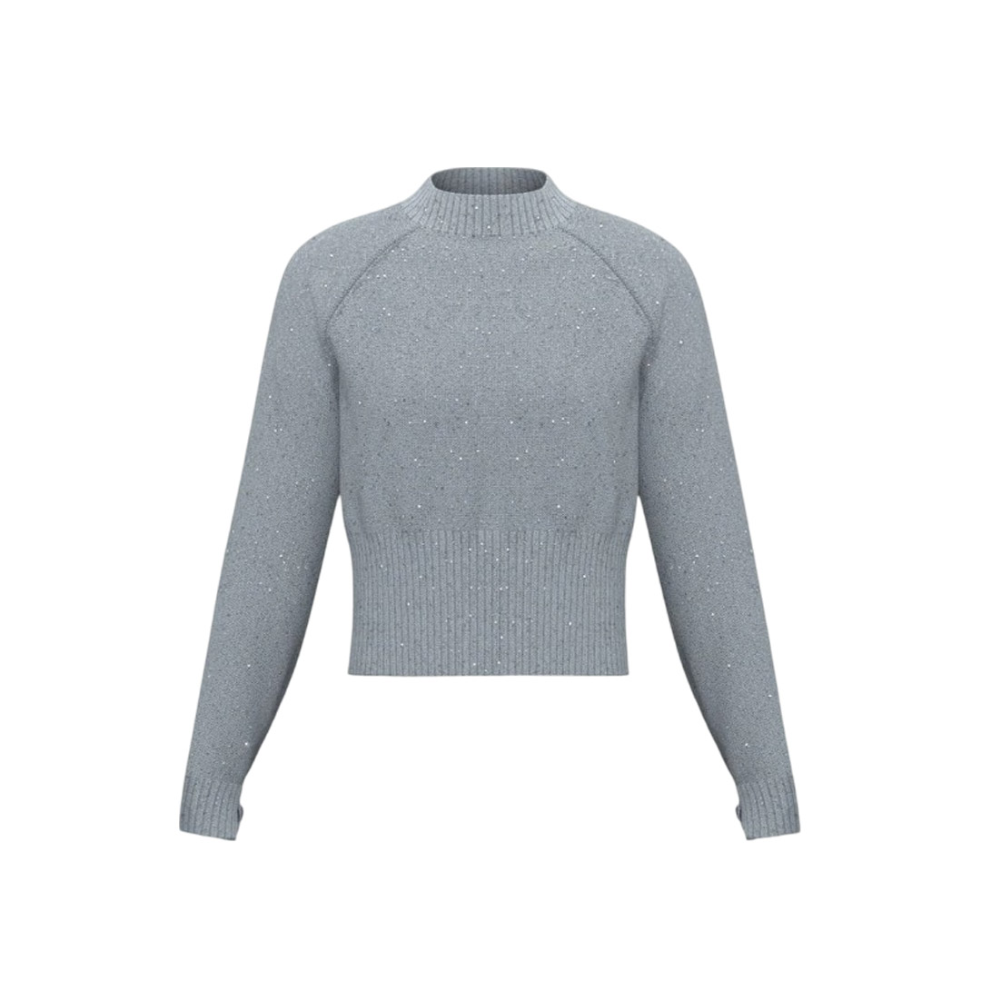 This cropped sweater in comfy yarn is adorned with sequins for a luminous yet subtle effect. The funnel neck and external seams define its character, while the button at the cuff adds a sophisticated detail. Wear with high-waisted denim or flowing skirts for an unexpected balance. Comfy yarn sweater with sequins. Cropped fit. Funnel neck with raglan sleeves. External seams on the shoulder and sides. Wide ribbed hem with button at the cuff.