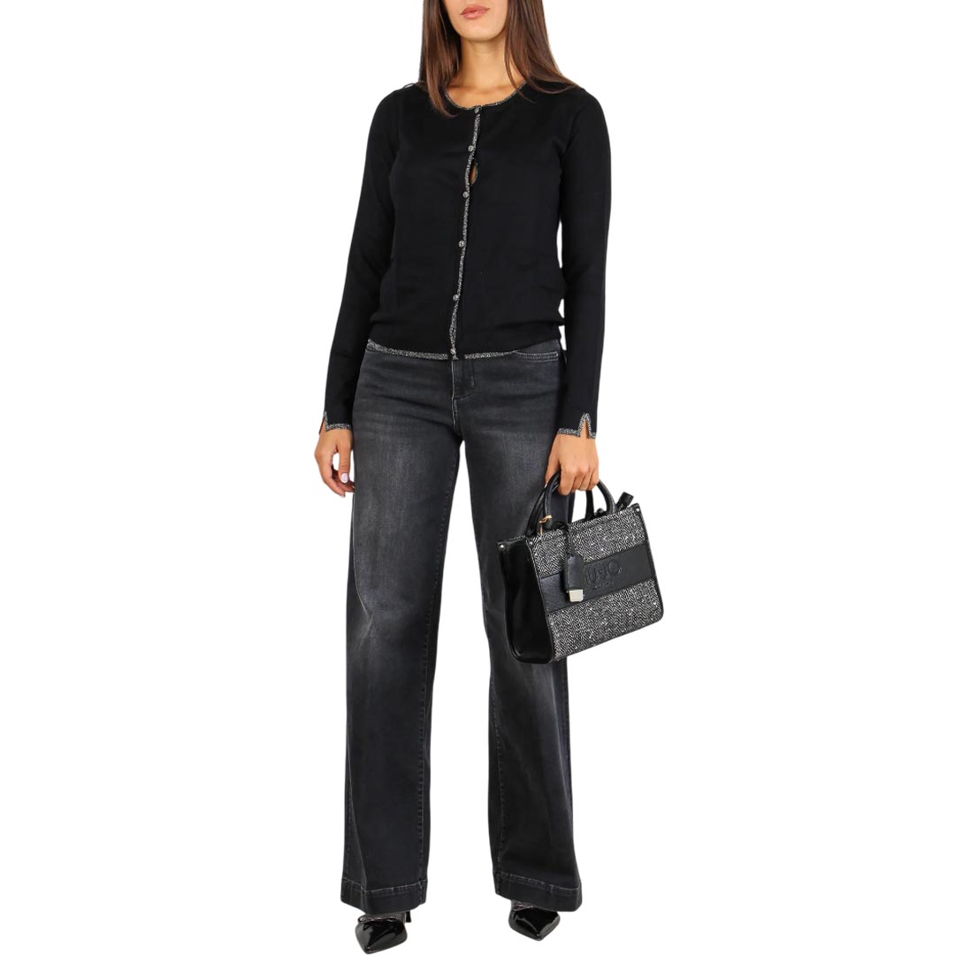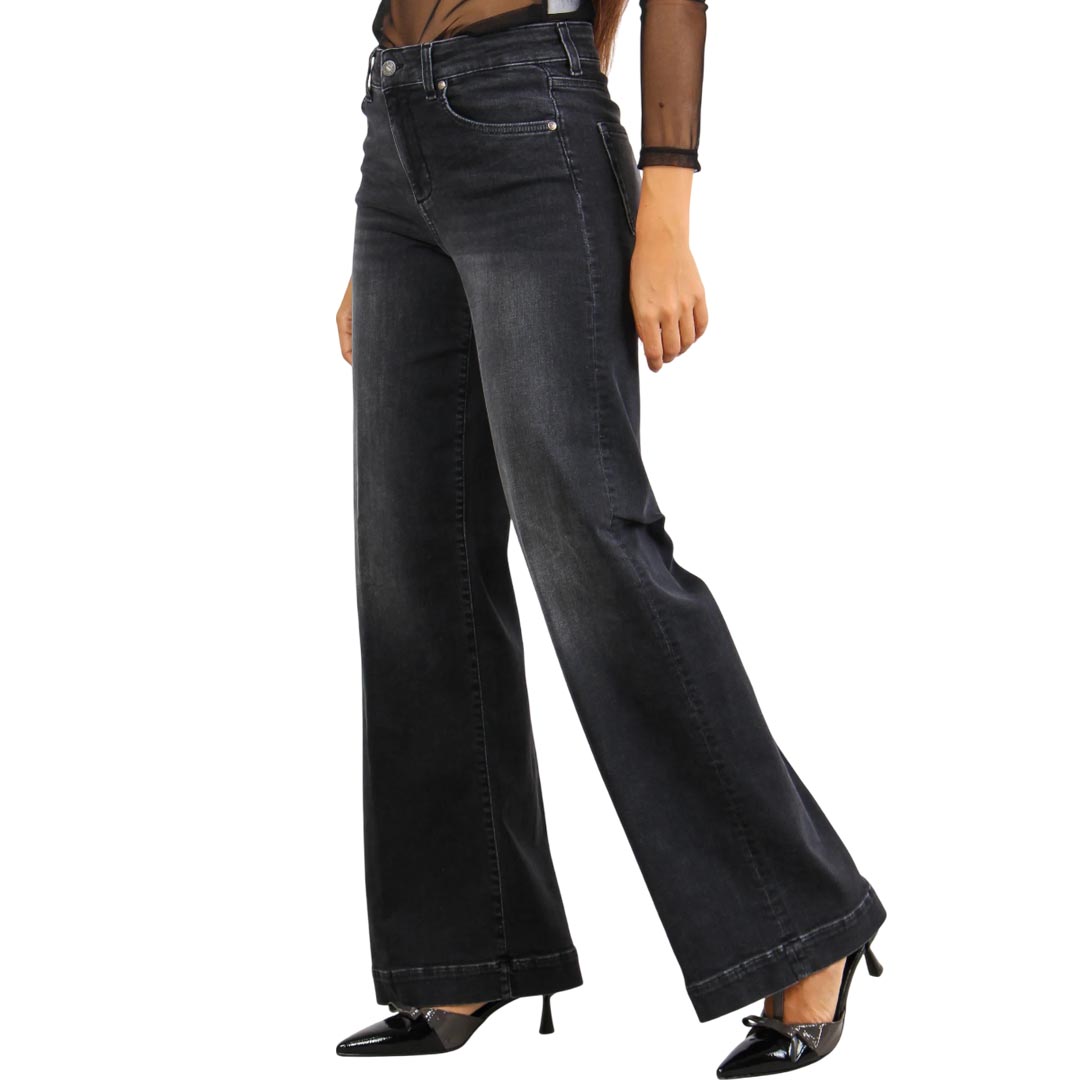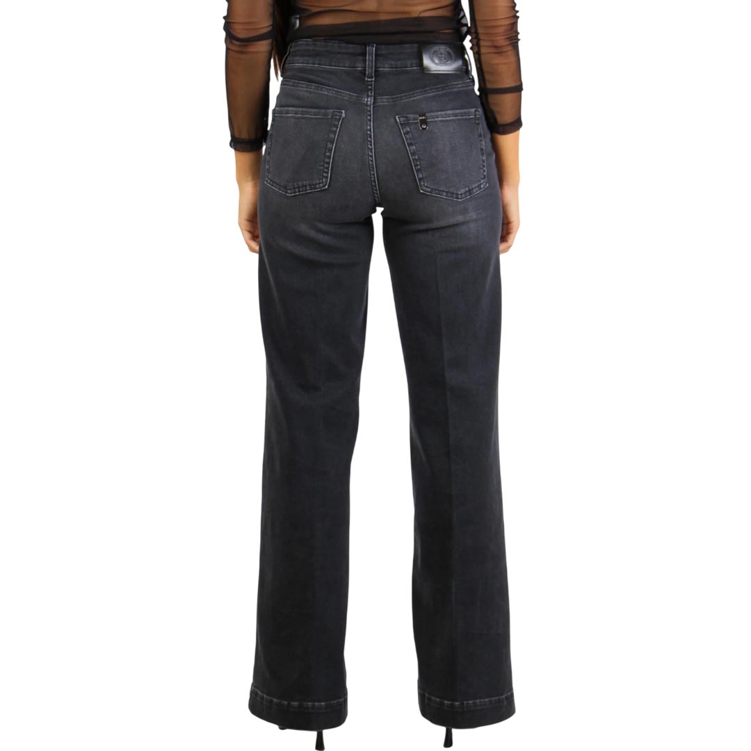 Stretch cotton denim jeans Used wash Regular waist Flared leg Five-pocket style Logo tag Metal logo on the back Button and covered zip fastening