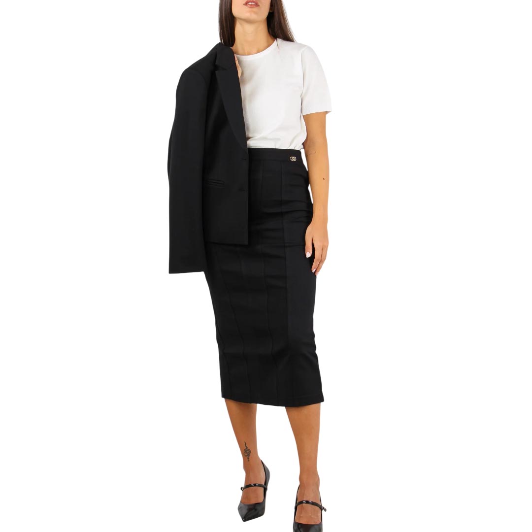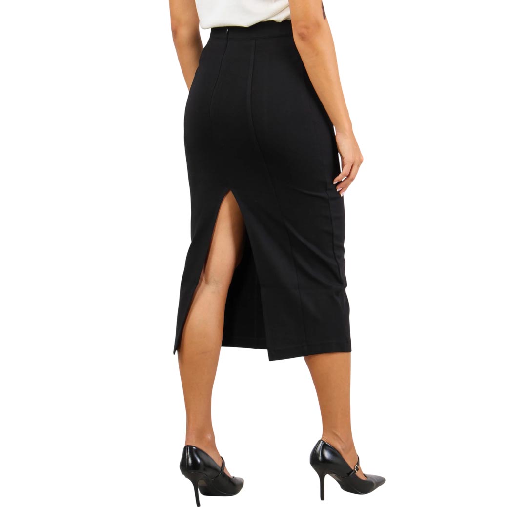 A simple and feminine skirt, with a clean cut that enhances the silhouette with timeless class and elegance. Crafted from comfortable technical fabric, this pencil skirt features a fitted silhouette that gently hugs the figure without constricting. The regular waist makes it practical for everyday wear, while the back slit adds a sensual and functional detail, ensuring freedom of movement. The vertical seams slim the figure and create a refined optical illusion. A small metal logo stands out at the waist, discreet yet distinctive.