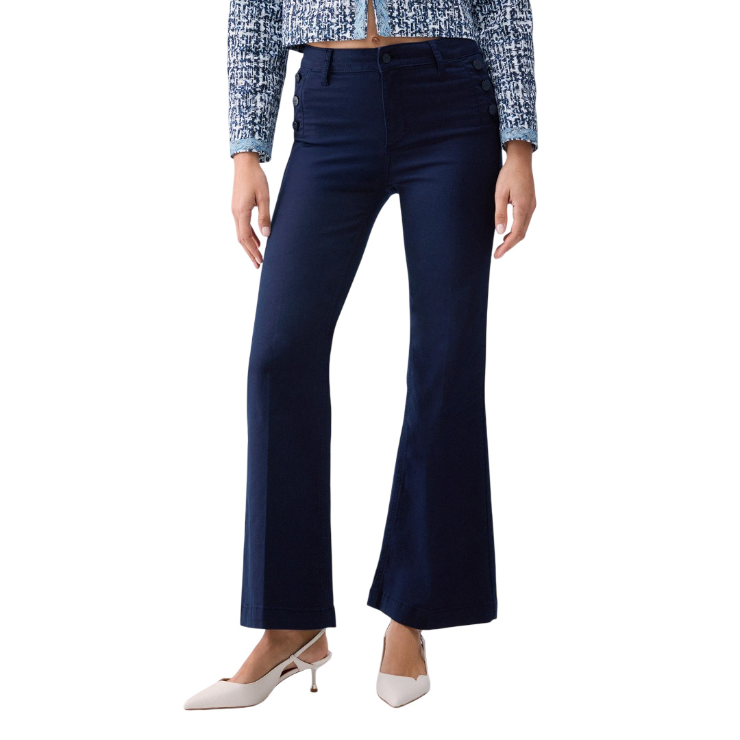 Cotton gabardine gives a compact feel to these flared trousers, embellished with logo buttons on the sides. Perfect with shirts or lightweight sweaters, they will accompany your looks from morning to night. Cotton gabardine trousers. Bottom-up cuts that elegantly redefine the shape, providing harmony and support without sacrificing comfort. High waist. Logo buttons on the front. Convenient pockets. Zip and button closure.