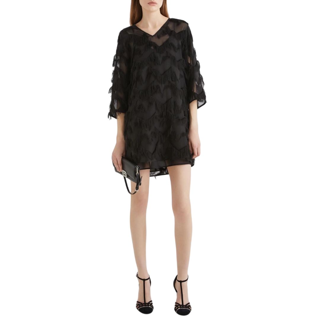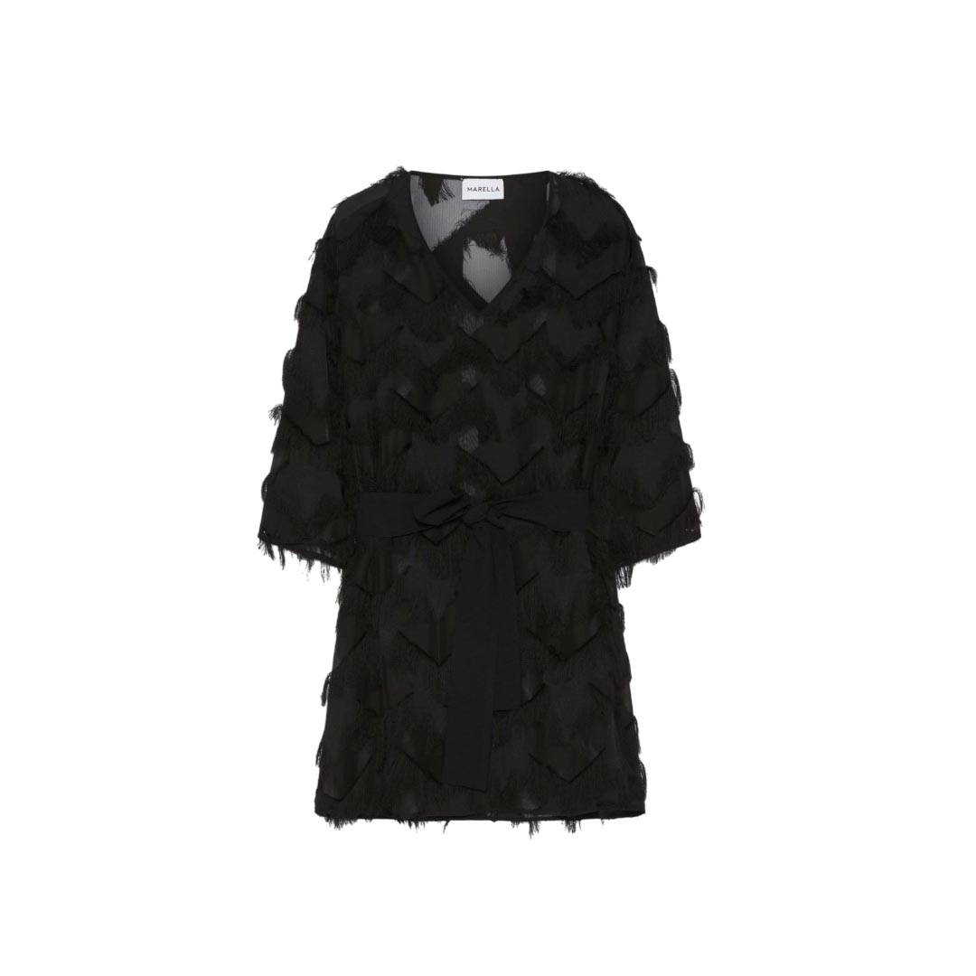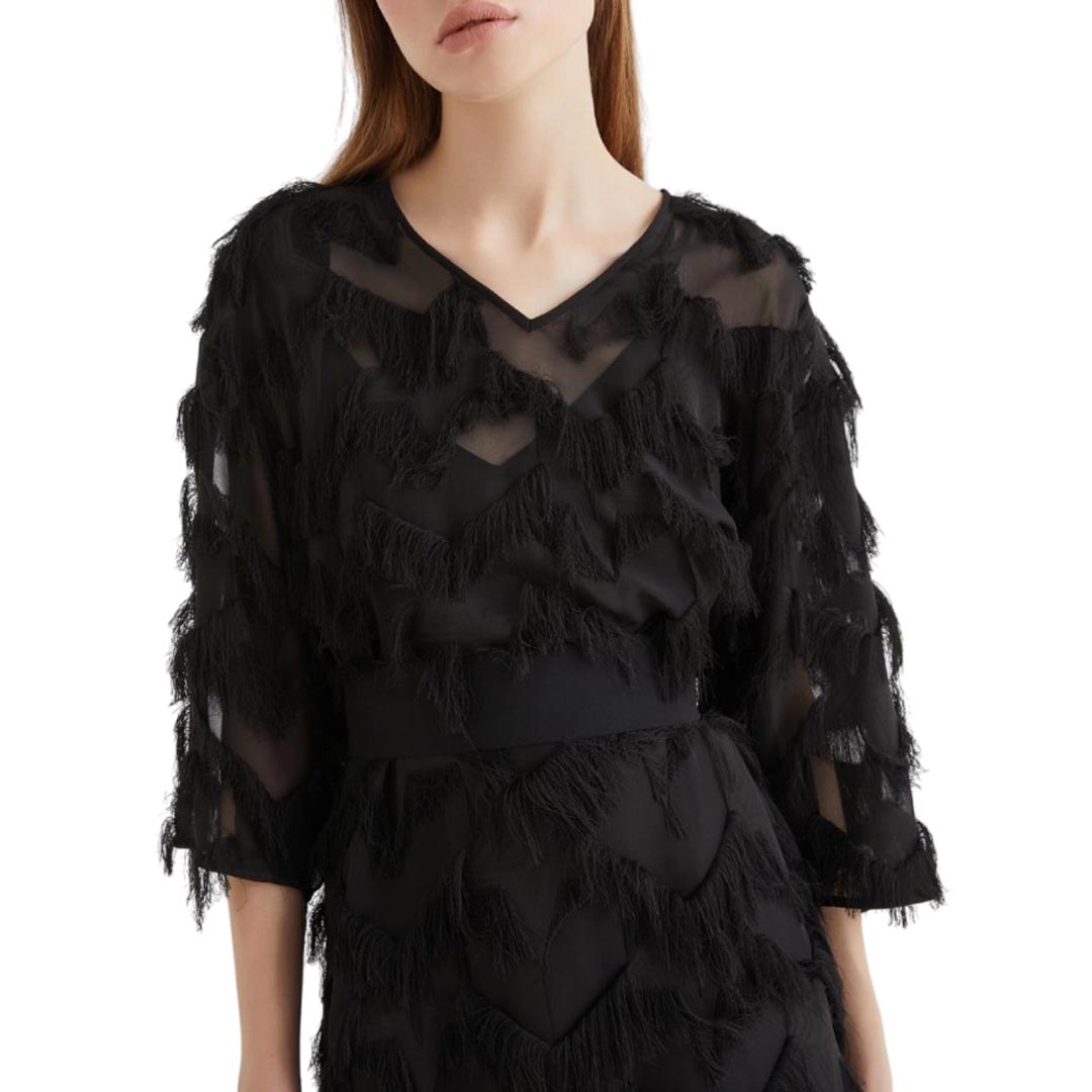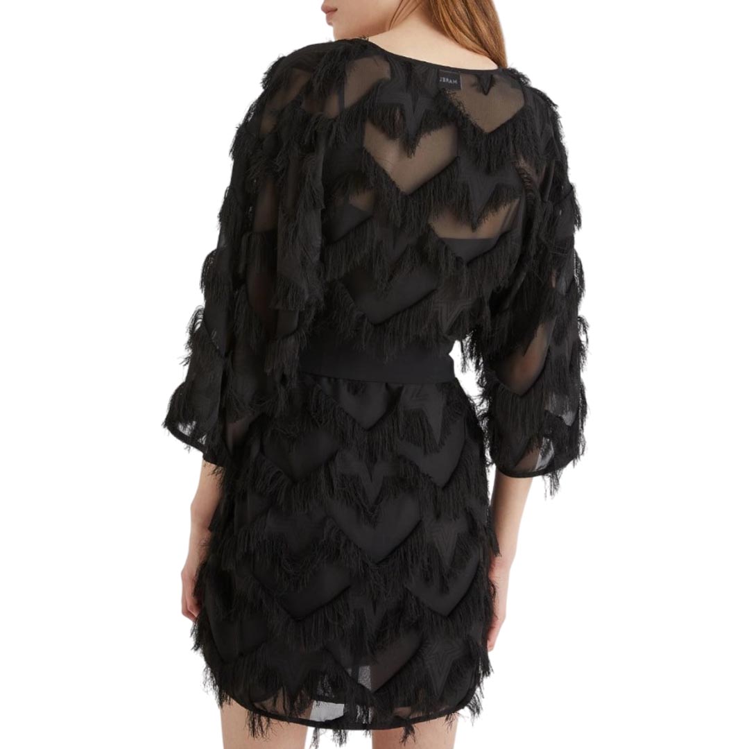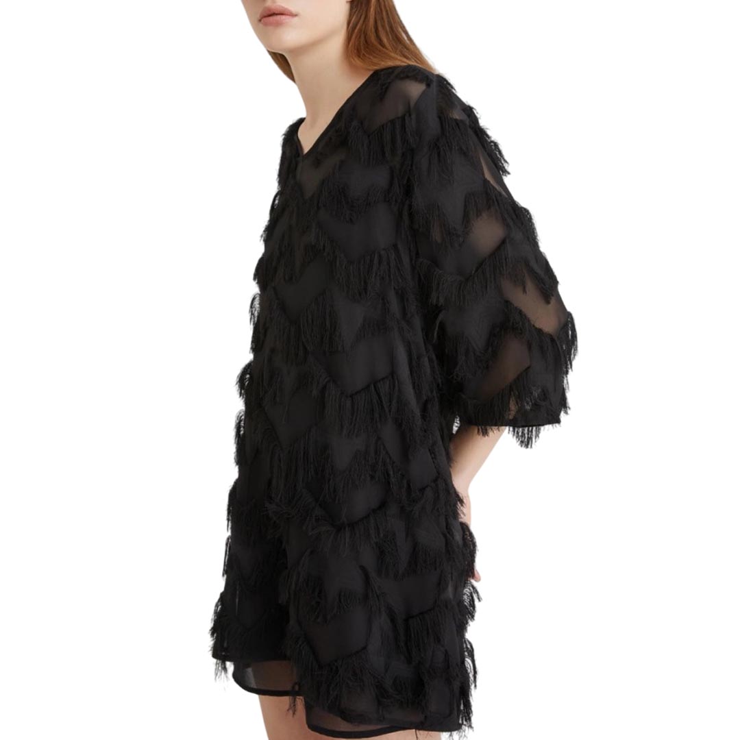 Short, semi-sheer, flowing: the fil coupé mini dress is the key piece for your evenings, to be completed with sandals and a sparkling clutch. Fil coupé mini dress with a star design. Regular fit. V-neck. Dropped shoulders. Georgette sash to tie at the waist. Removable slip in matching georgette.