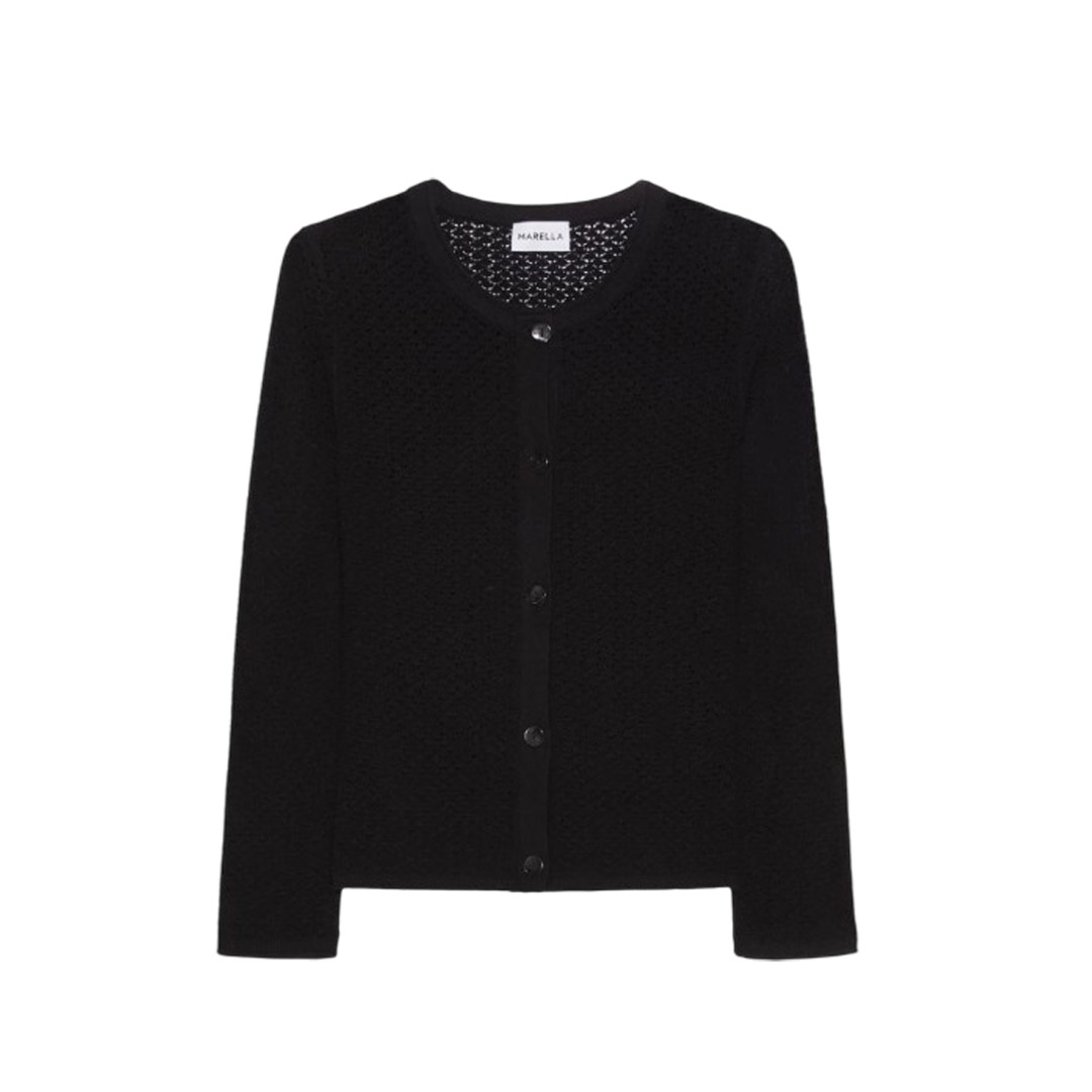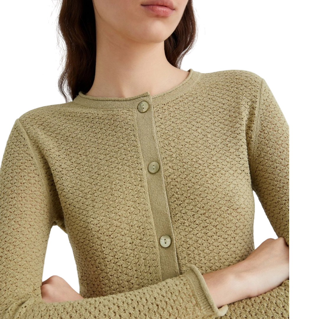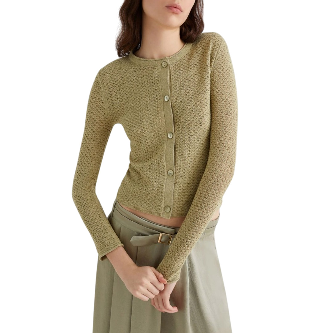 Mini cardigan in lace stitch, sophisticated and comfortable, to wear repeatedly in the cold season. With a fitted fit for a sculpted silhouette. Mini cardigan in cotton blend yarn with lace stitch. Fitted fit. Round neck. Long sleeve. Exposed button placket.