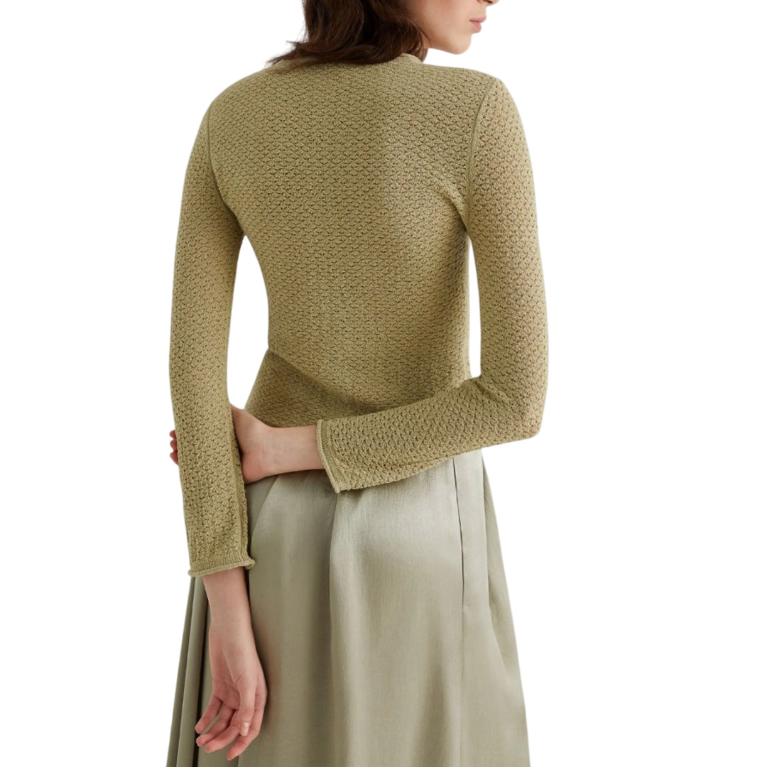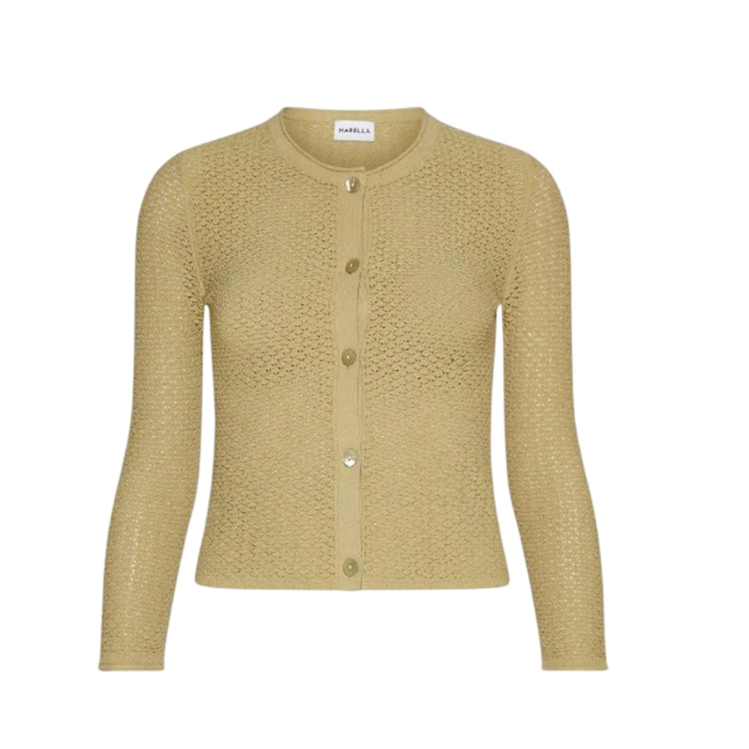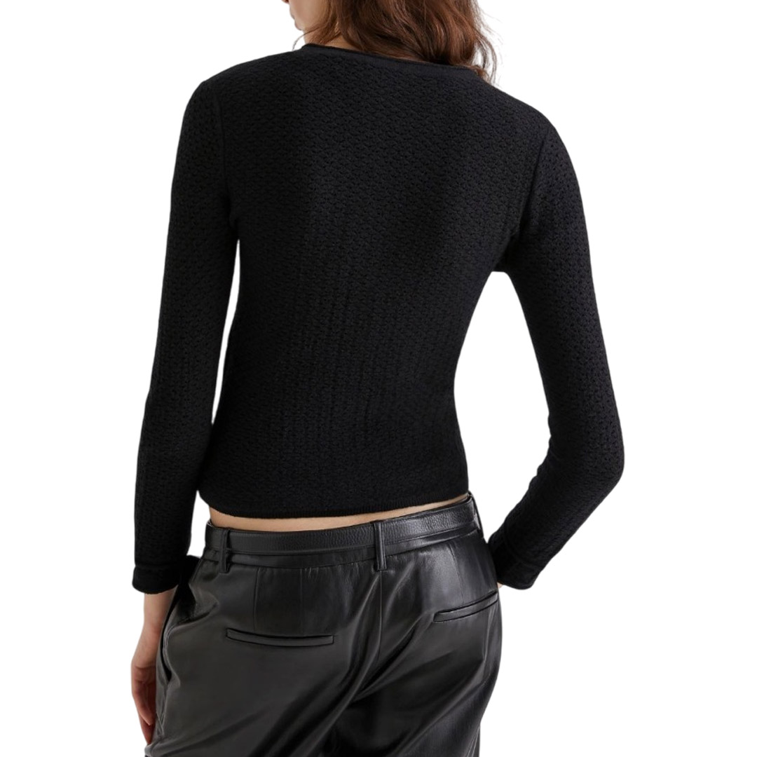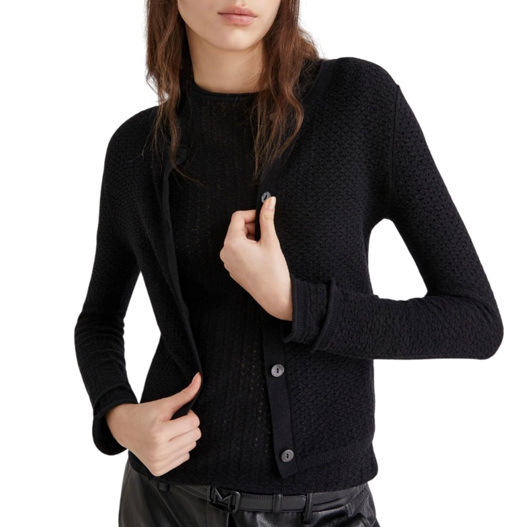 Mini cardigan in lace stitch, sophisticated and comfortable, to wear repeatedly in the cold season. With a fitted fit for a sculpted silhouette. Mini cardigan in cotton blend yarn with lace stitch. Fitted fit. Round neck. Long sleeve. Exposed button placket.