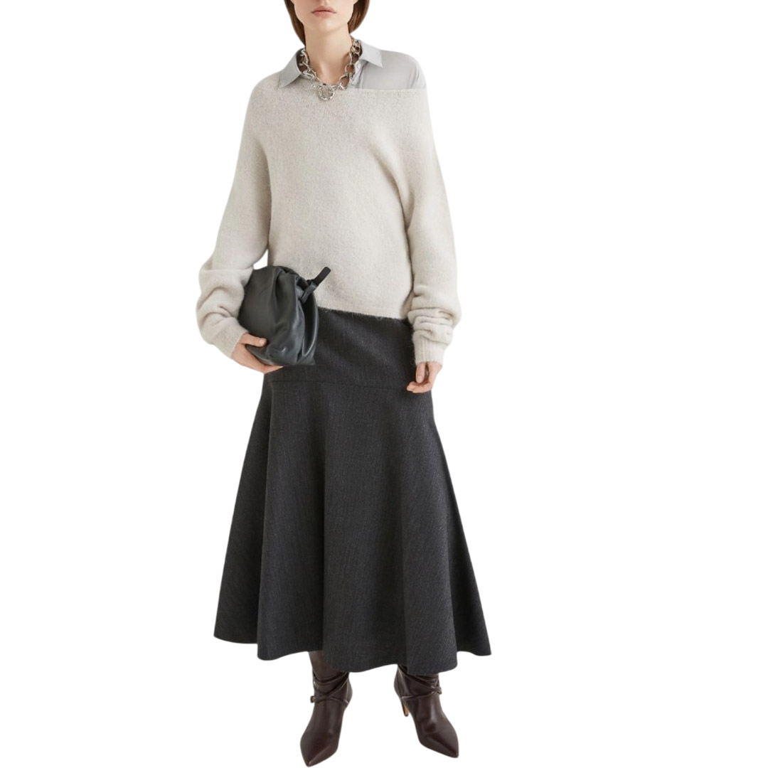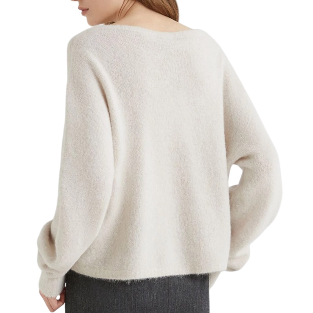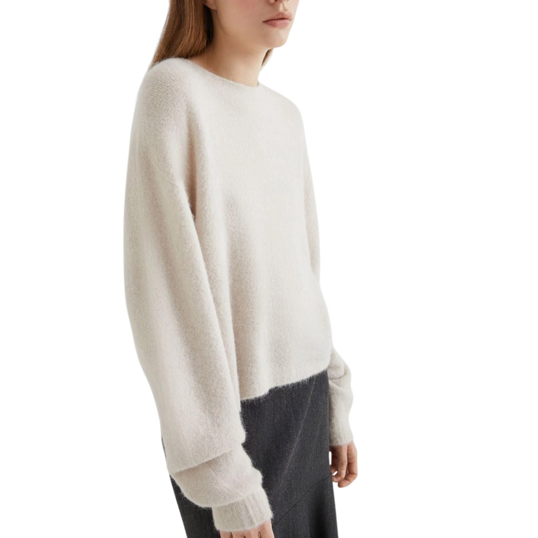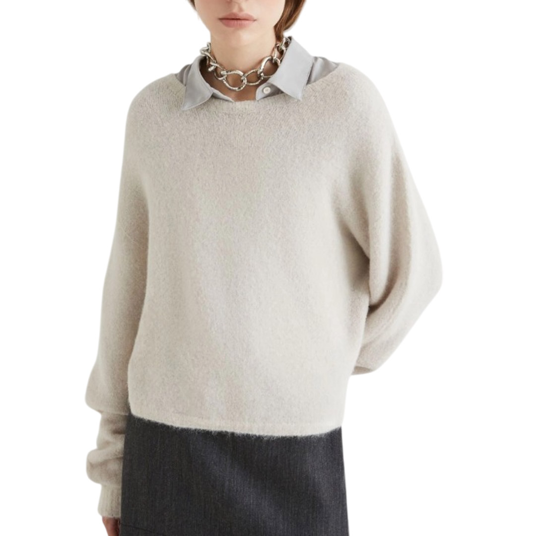 Vibrant shades and a boxy fit, the new sweater offers warmth and the vaporous note of alpaca yarn. Contemporary in shape, it pairs perfectly with the velvet skirt or denim from the collection for a refined casual look. Stretch alpaca blend sweater. Boxy fit. Crew neck. Dropped shoulders. Ribbed cuffs and hem.