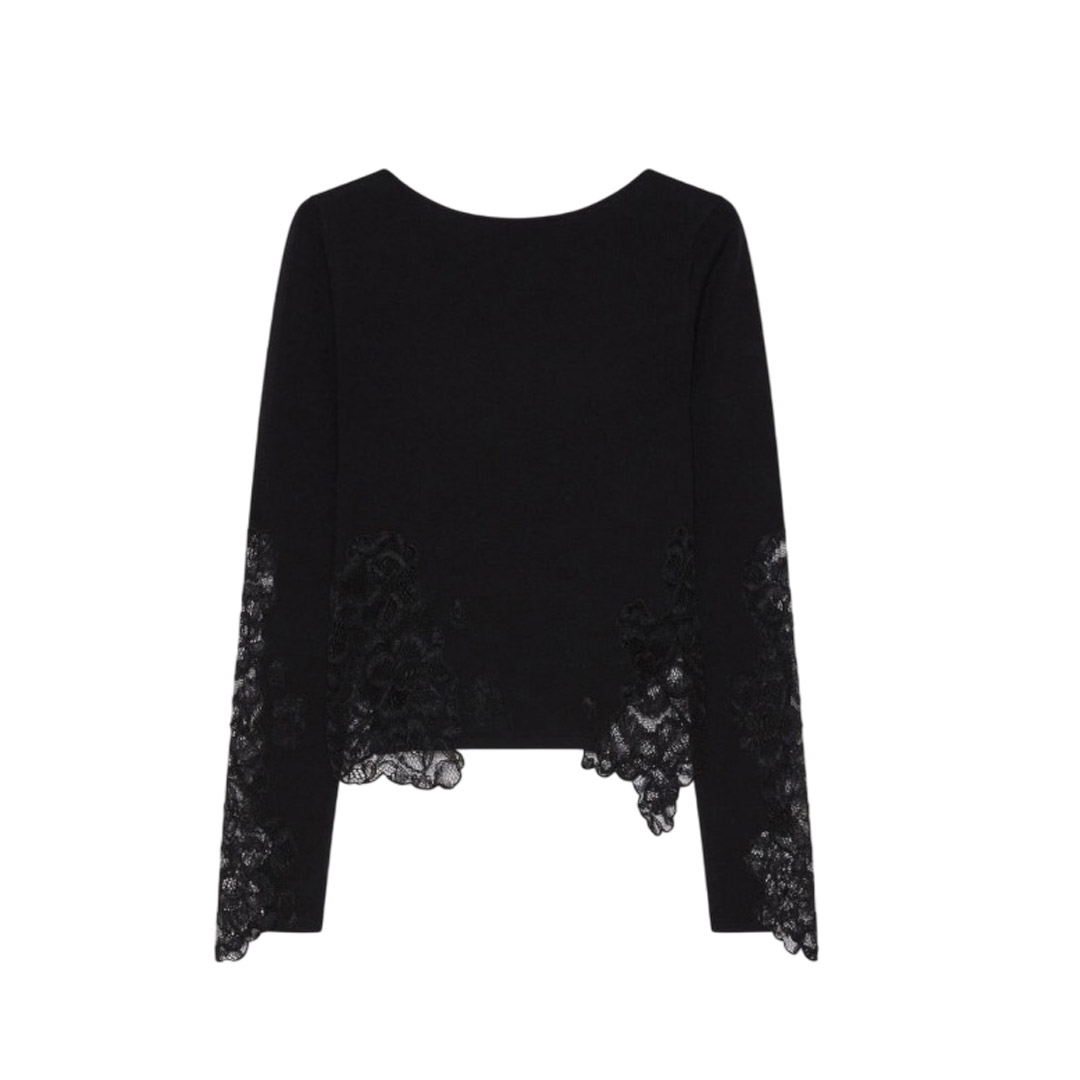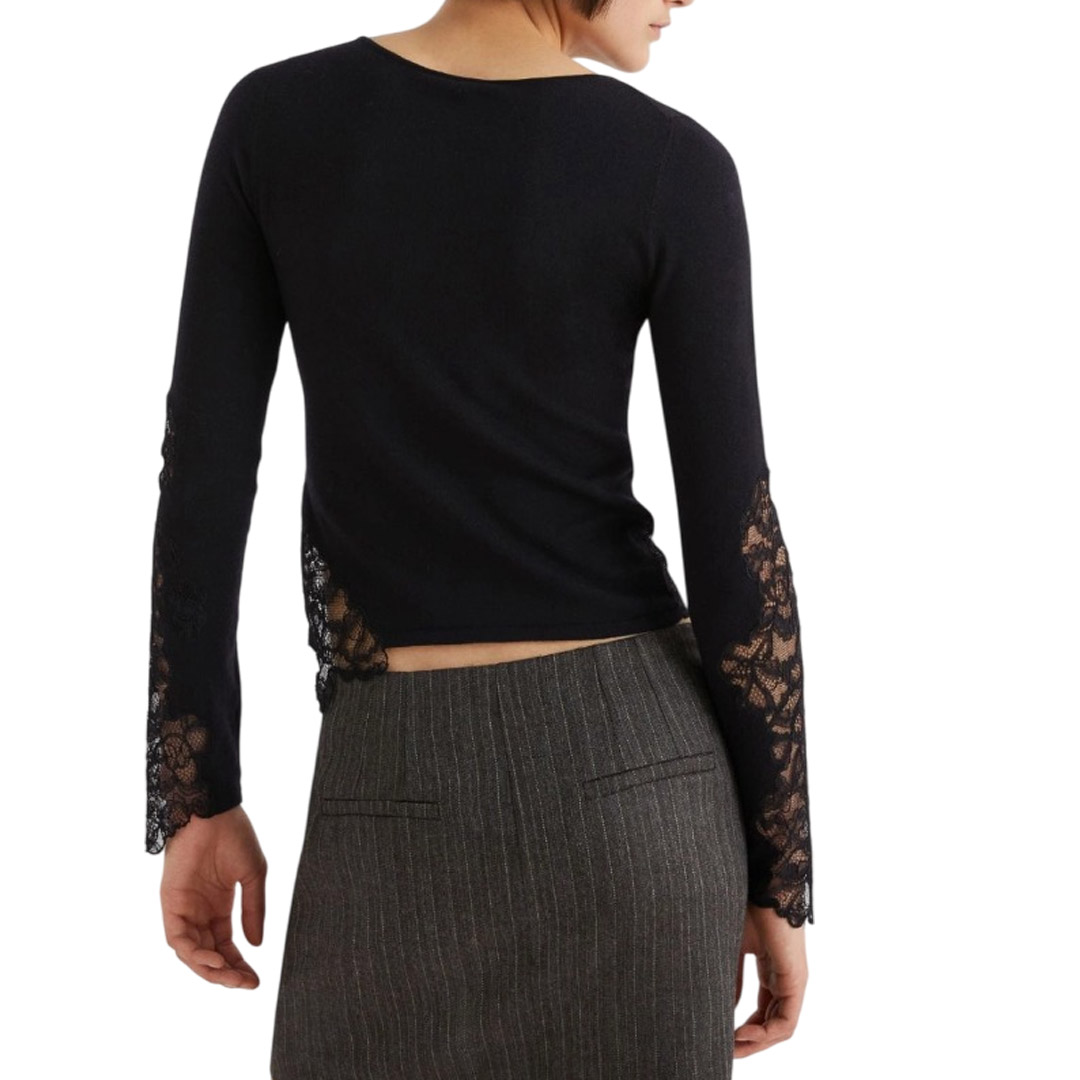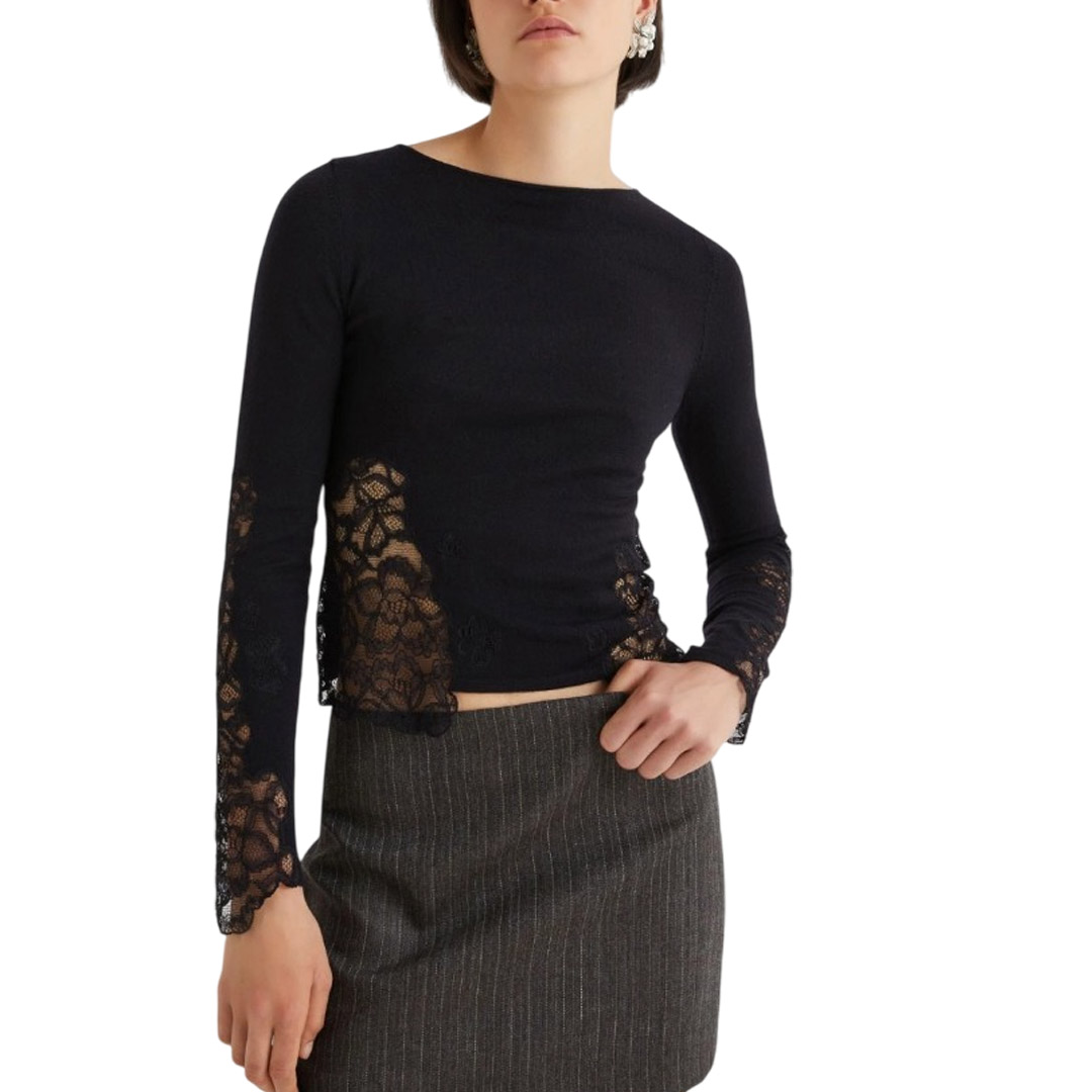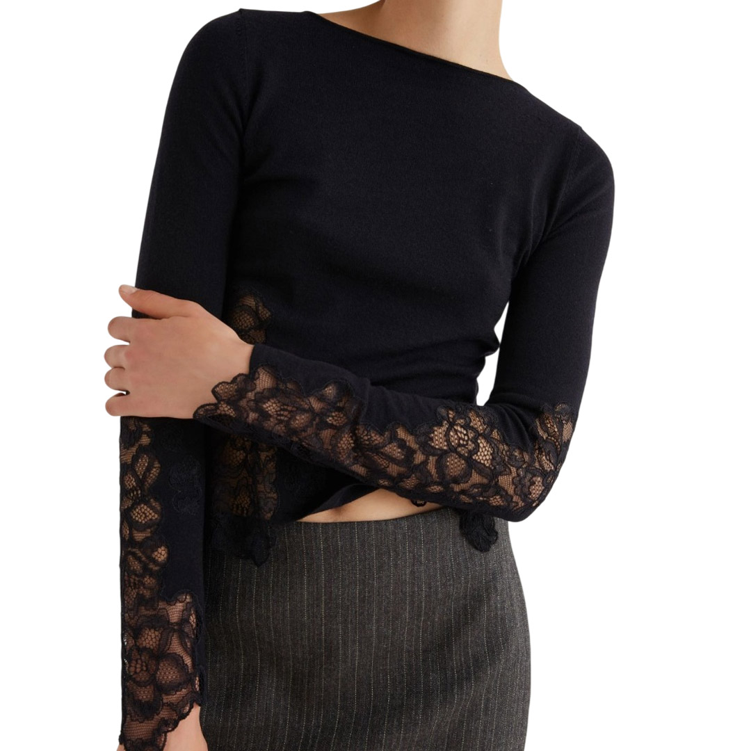 The versatility of the stretch wool sweater finds new energy in this fitted version, with the sensual touch of lace inserted on the cuffs and hem. Try it with the mini skirt for a jaunty city look. Stretch wool blend sweater. Fitted fit. Boat neck. Lace appliqués on the sleeves and hem.