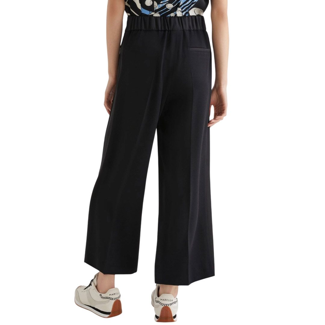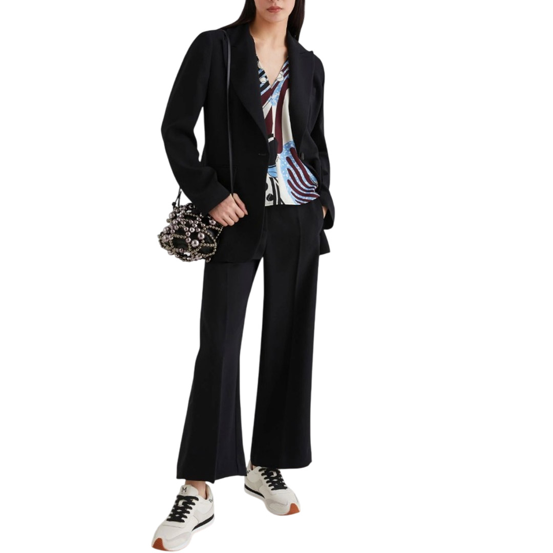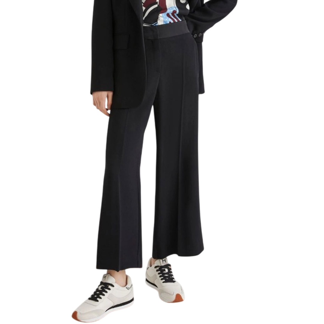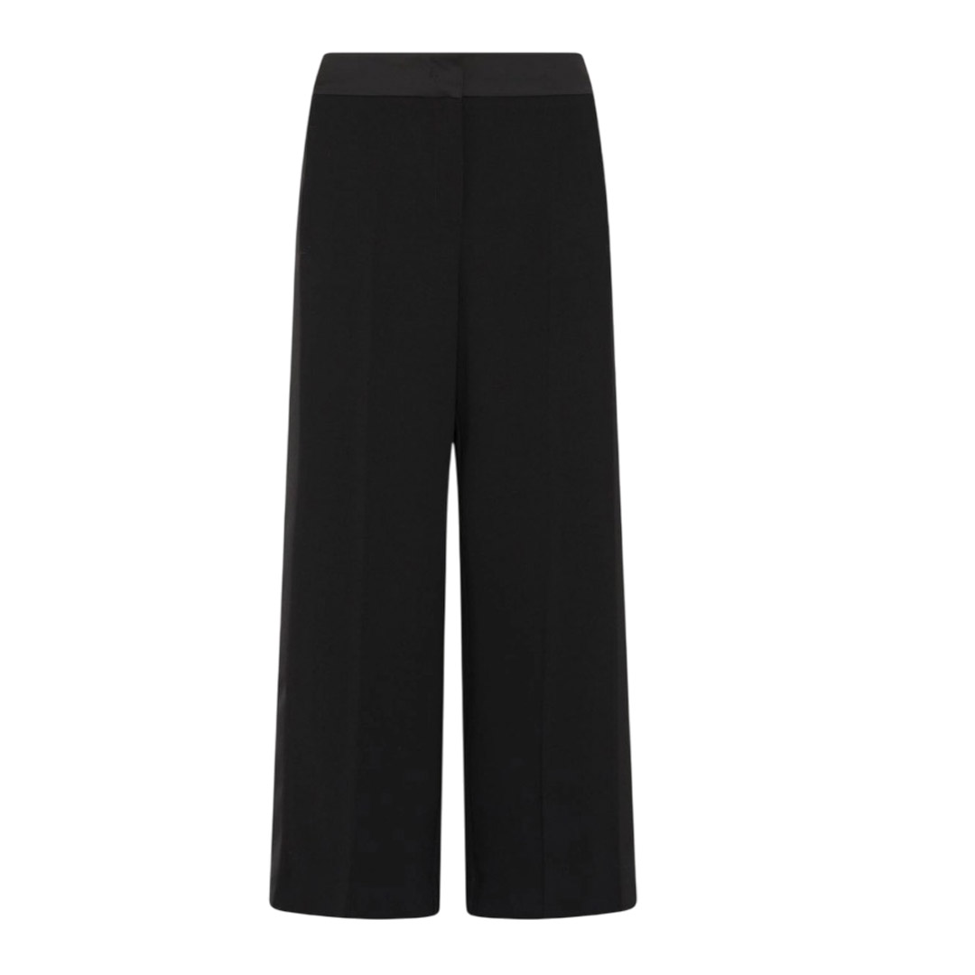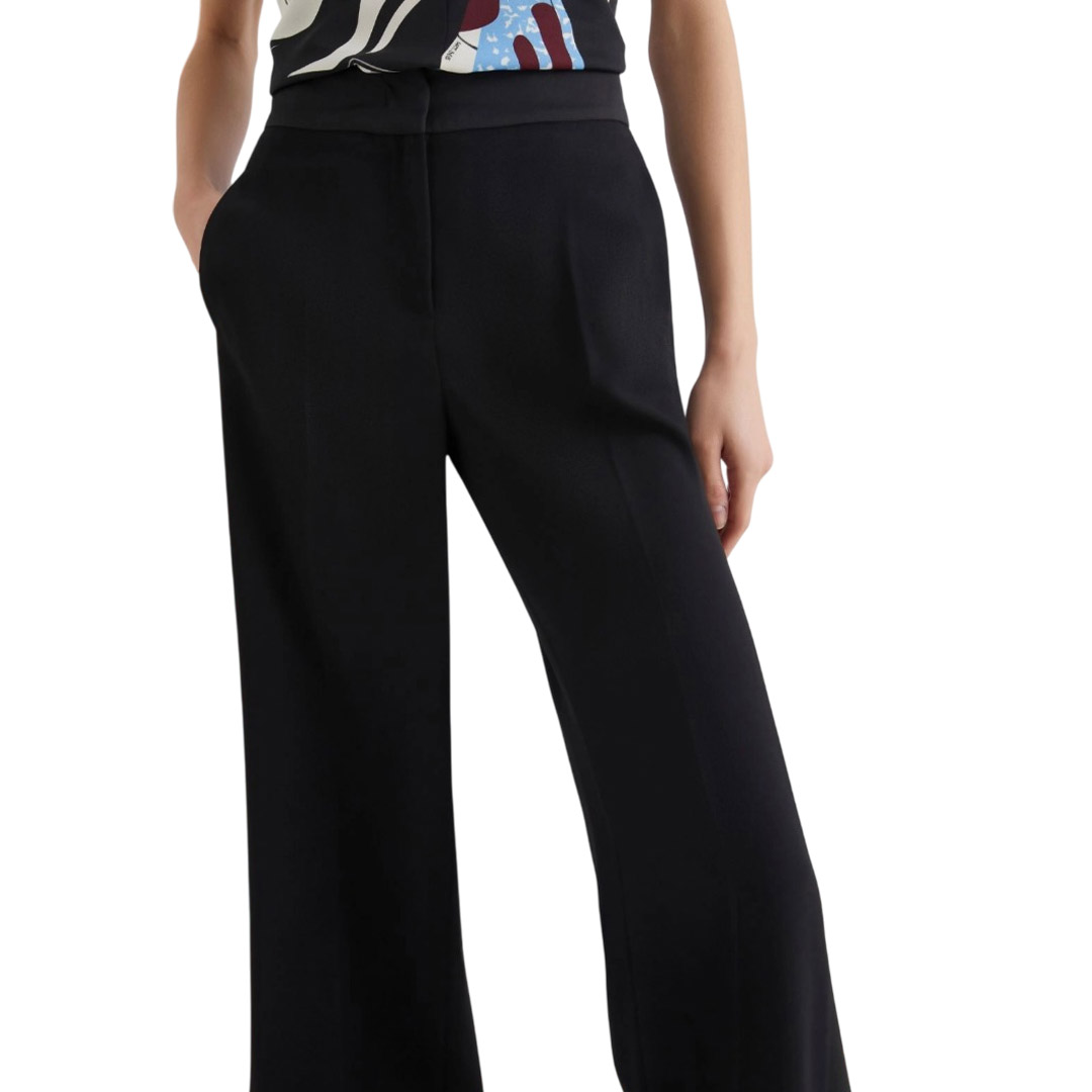 New men's-inspired trousers, softened by the fluidity of the satin overlay that slims the silhouette and sways softly with movement. The elastic insert at the back ensures an impeccable fit for every occasion. Main fabric containing over 50% recycled polyester. Trousers in satin overlay crepe. Straight fit. Men's hook-and-eye closure and zip. Elastic insert at the back of the waist and back welt pocket. Satin side bands and ironed pleat on the front and back.