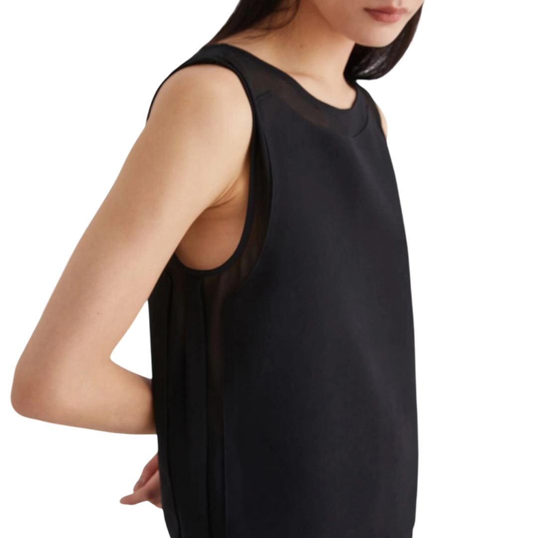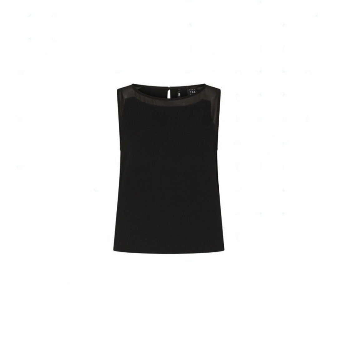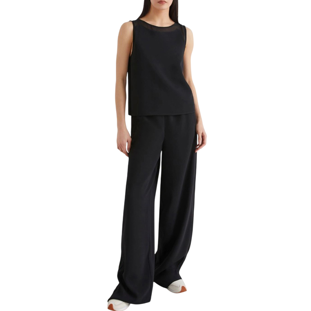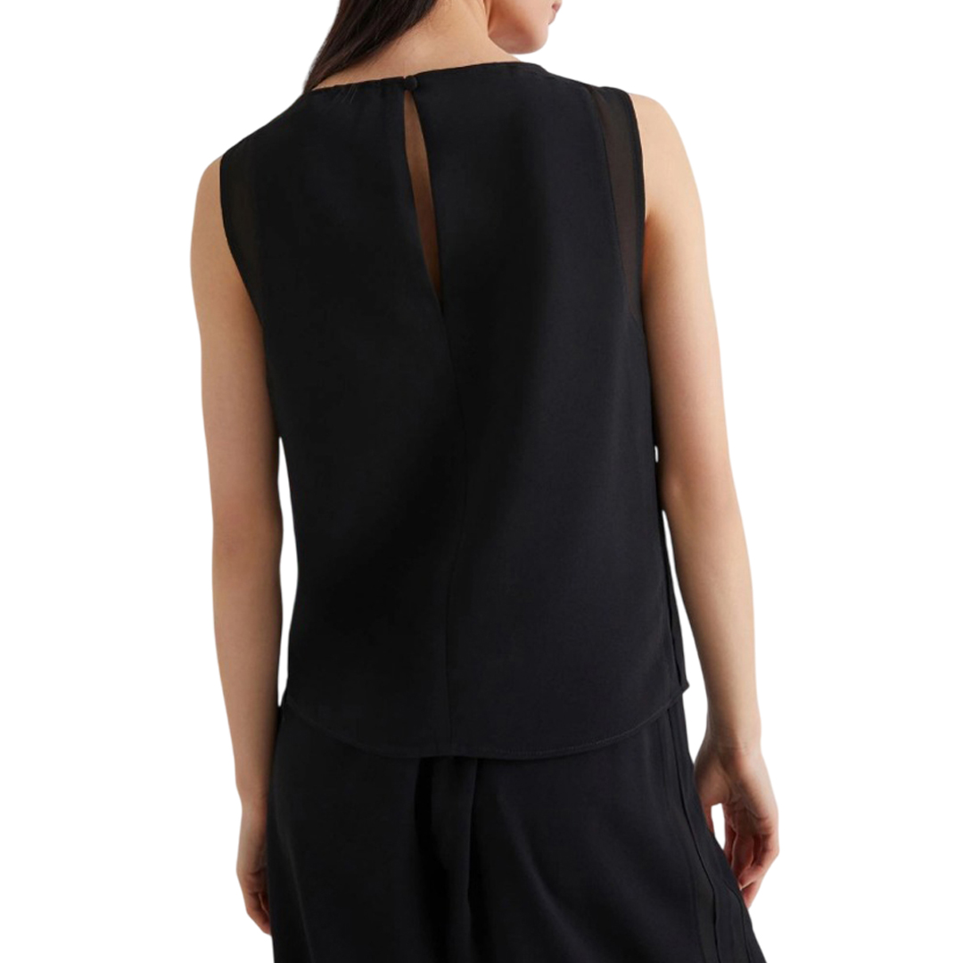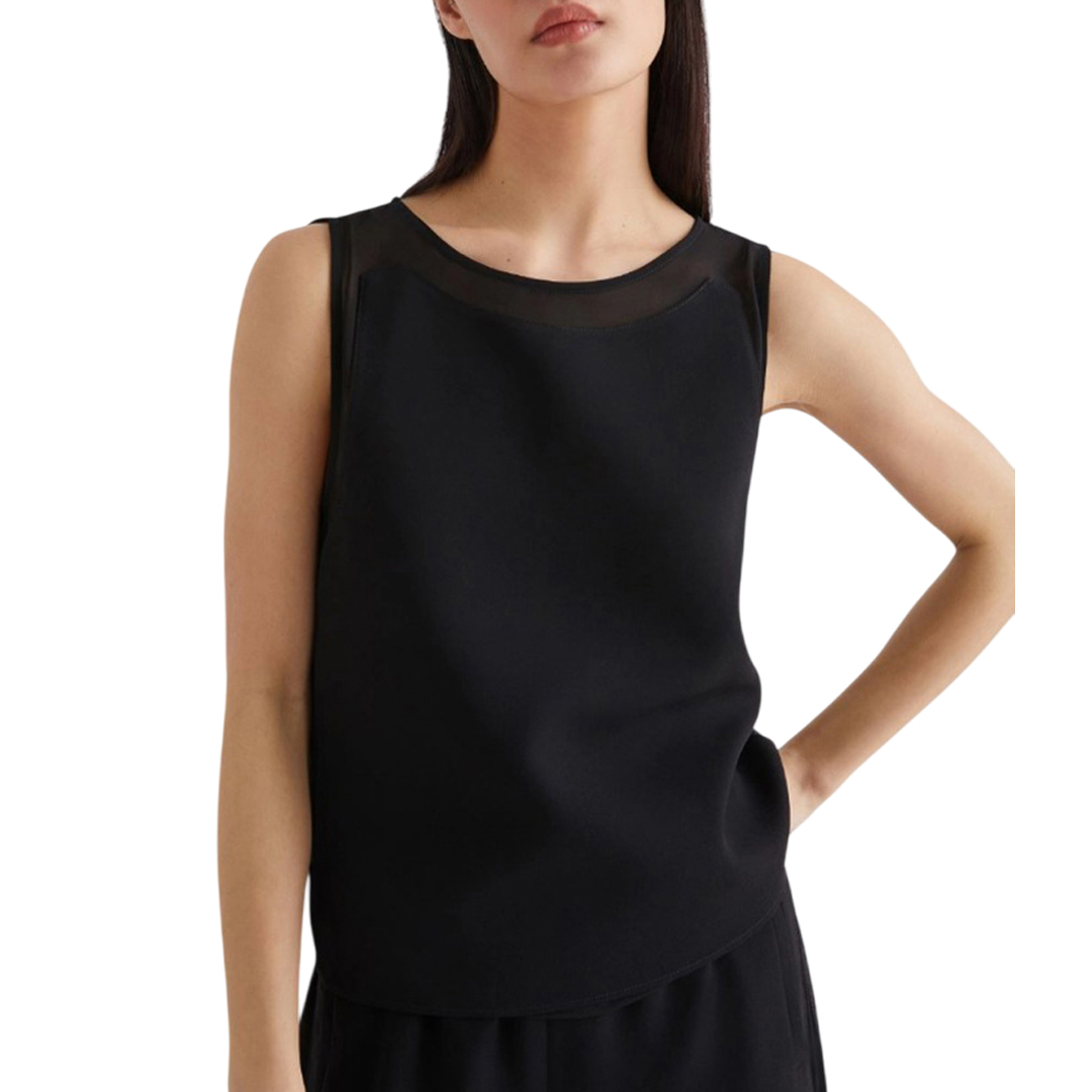 Sleeveless top with a feminine silhouette, enhanced by the sensuality of georgette applied on the neckline and armholes. A sophisticated mix of materials, to be worn with flowing pants or your favorite denim. Main fabric containing over 50% recycled polyester. Top in crepe envers satin and georgette. Regular fit. Rounded neckline with teardrop on the back. Sleeveless model. Georgette inlays on the neckline and armholes.