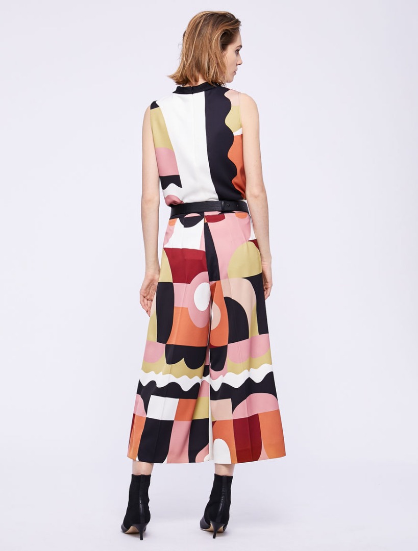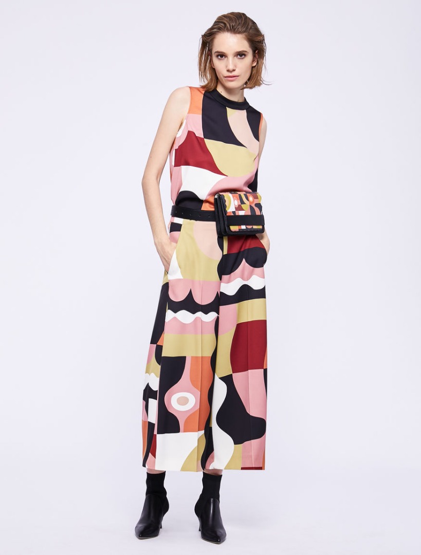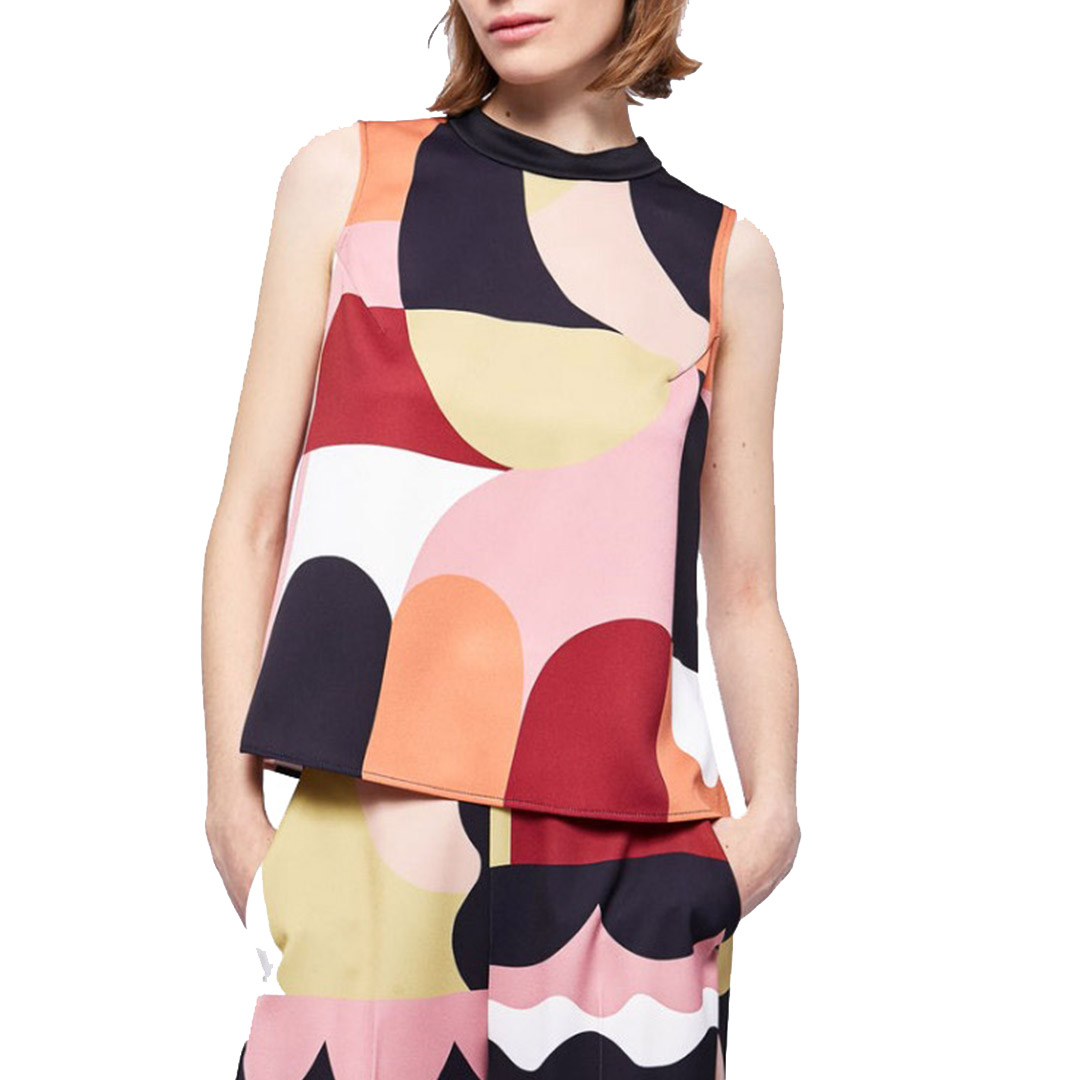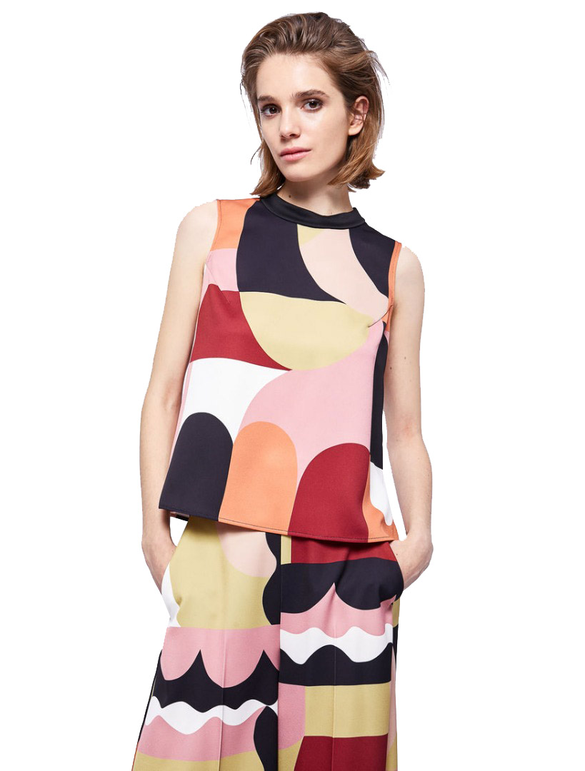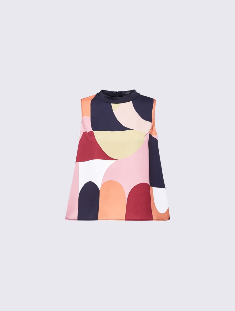 Top crêpe envers satin patterned, flared. Mandarin collar, sleeveless. Closure with concealed zip at the back. Side slits on the bottom. The head is part of the capsule collection Liselotte Watkins for Marella ART.365, composed of leaders and personalized accessories from the graphic artist in a sophisticated mix of patterns and colors.