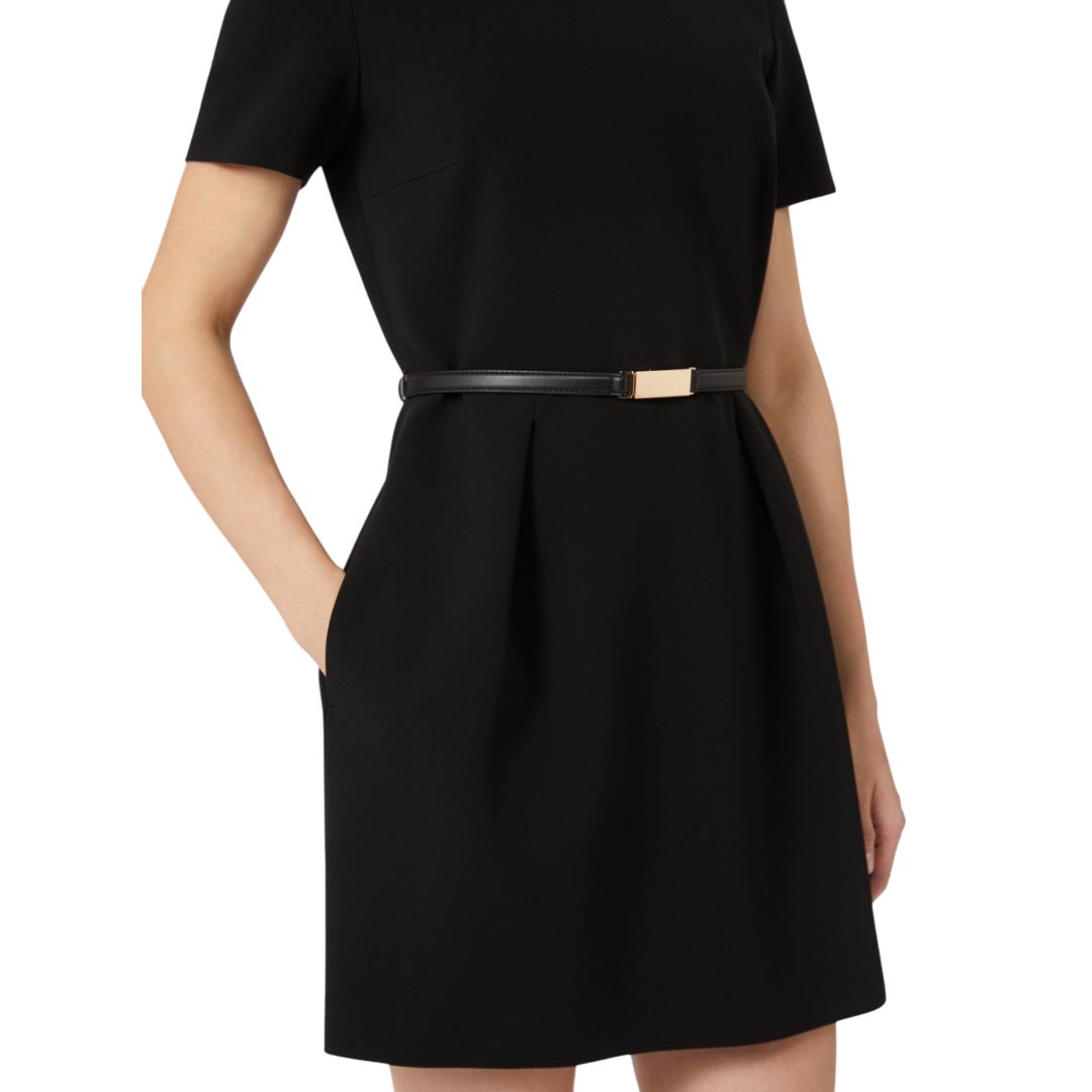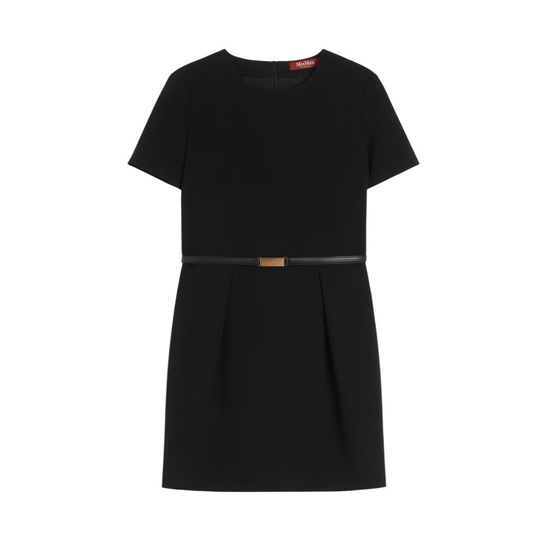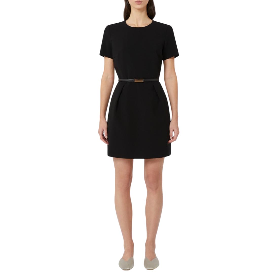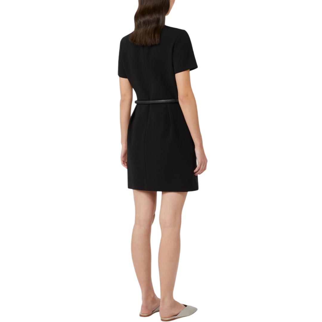 Short dress with tulip skirt, high waist and shaded pleats that add volume. Cady dress. Crew neck. Short set-in sleeves. Zip fastening on the back. Inset pockets on the sides. Matching belt in coated fabric. Lined.