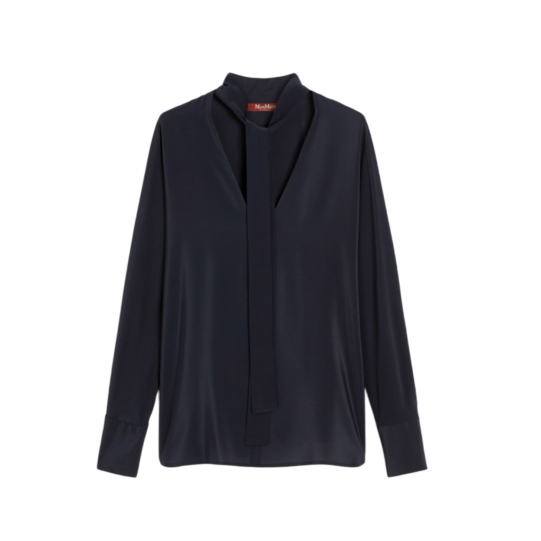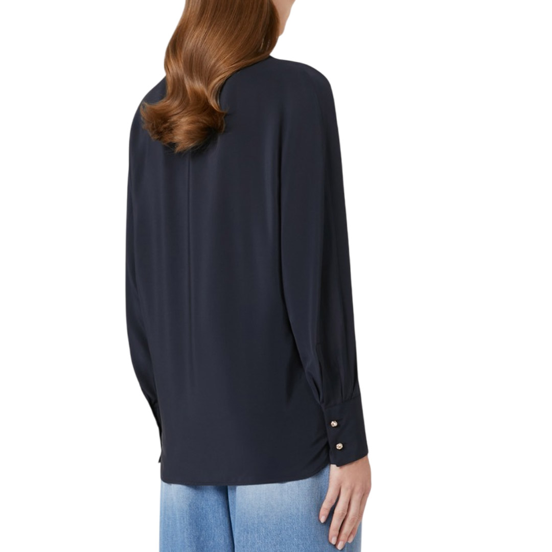 Blouse with a tie-style sash to tie at the neck. Pure silk crêpe de Chine blouse. Soft fit. V-neck. Wide, long kimono sleeves. High shirt cuffs with double jewel buttons. Rounded hem with side slits.