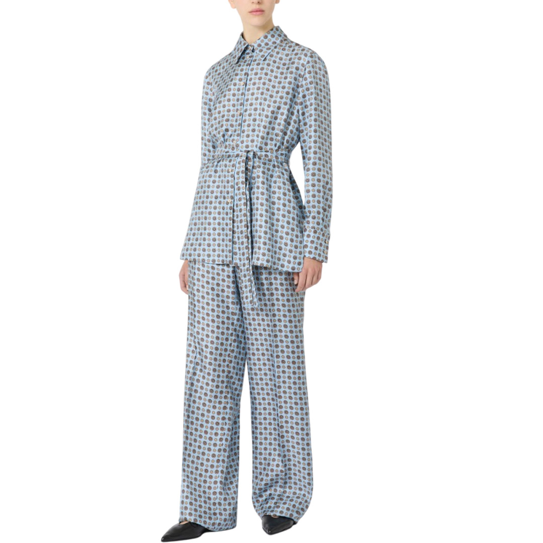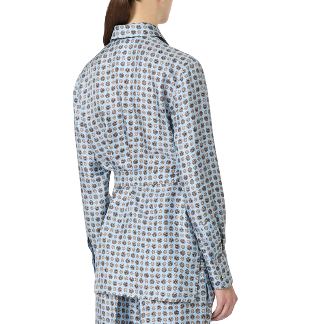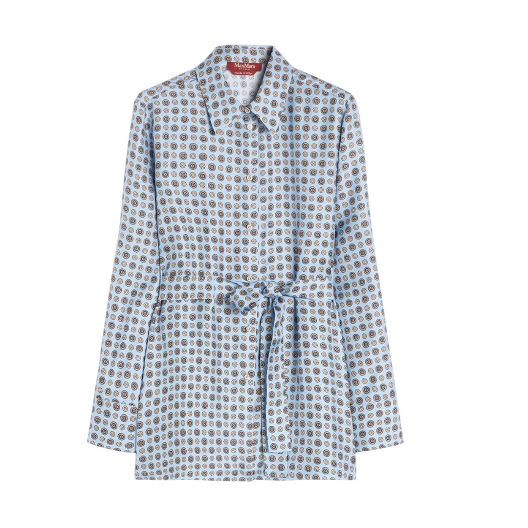 Shirt with a belt tied at the waist to highlight the silhouette. Printed pure silk twill shirt. Straight fit. Pointed collar. Long set-in sleeves with cuffs and side button. Front closure with jewel buttons. Small square side slits.