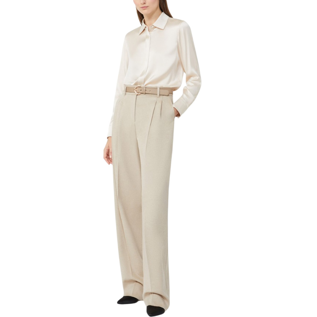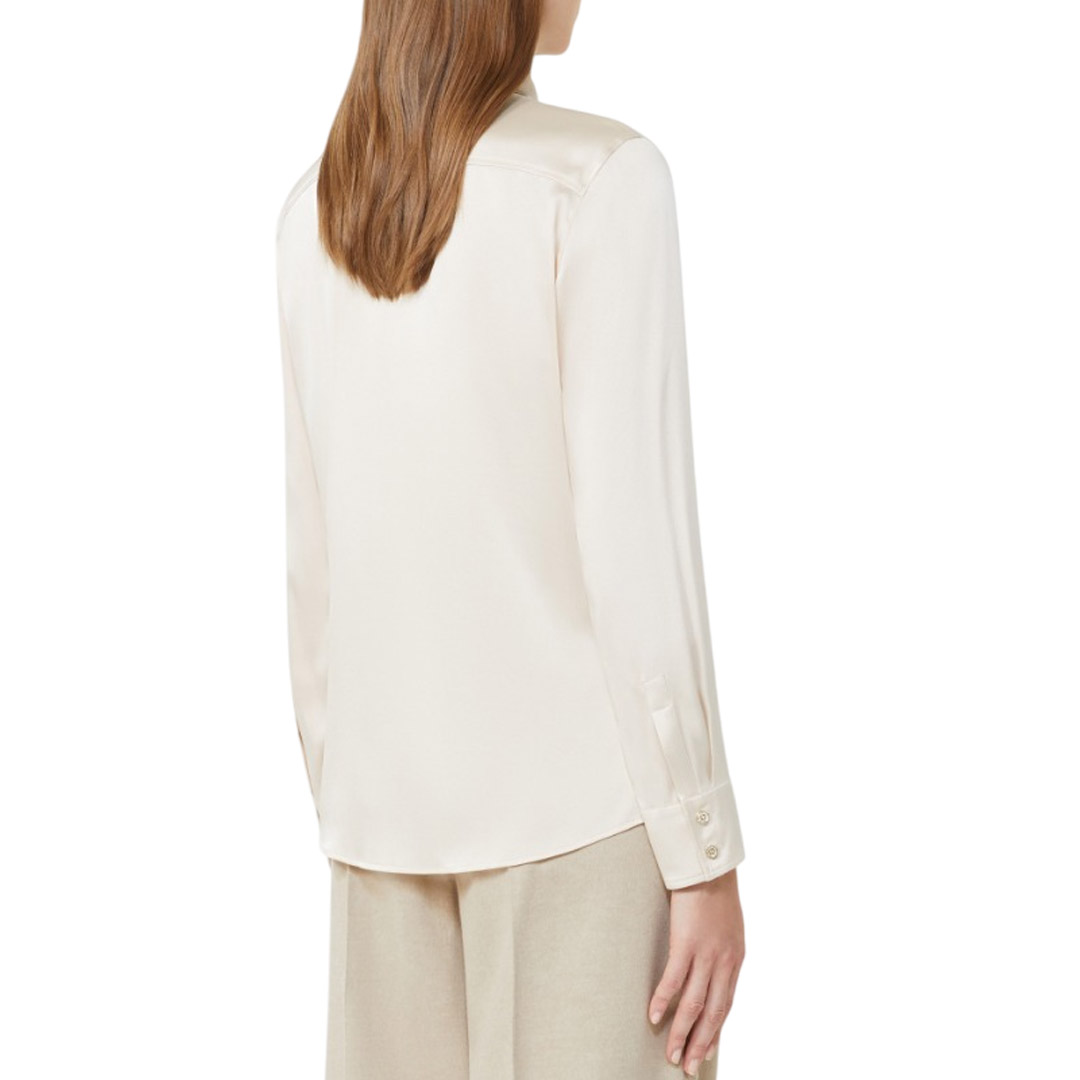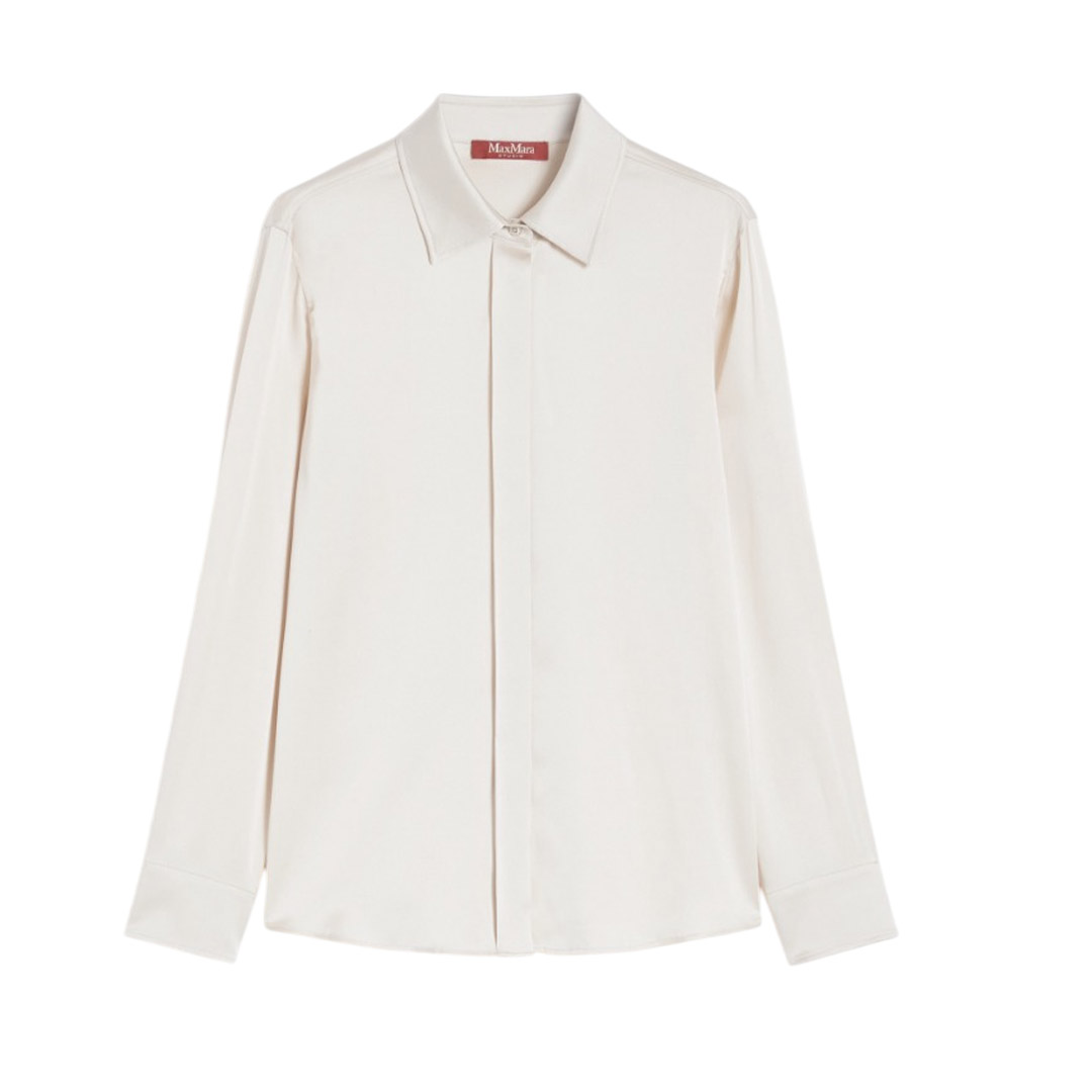 Men's silk satin shirt with a classic silhouette, featuring clean, essential lines. Technical details and jeweled buttons complete the style perfectly. Women's pure silk satin shirt. Straight and flowing fit. Traditional point collar. Long set-in sleeves. Concealed front closure with jeweled buttons. High cuffs with double buttons.