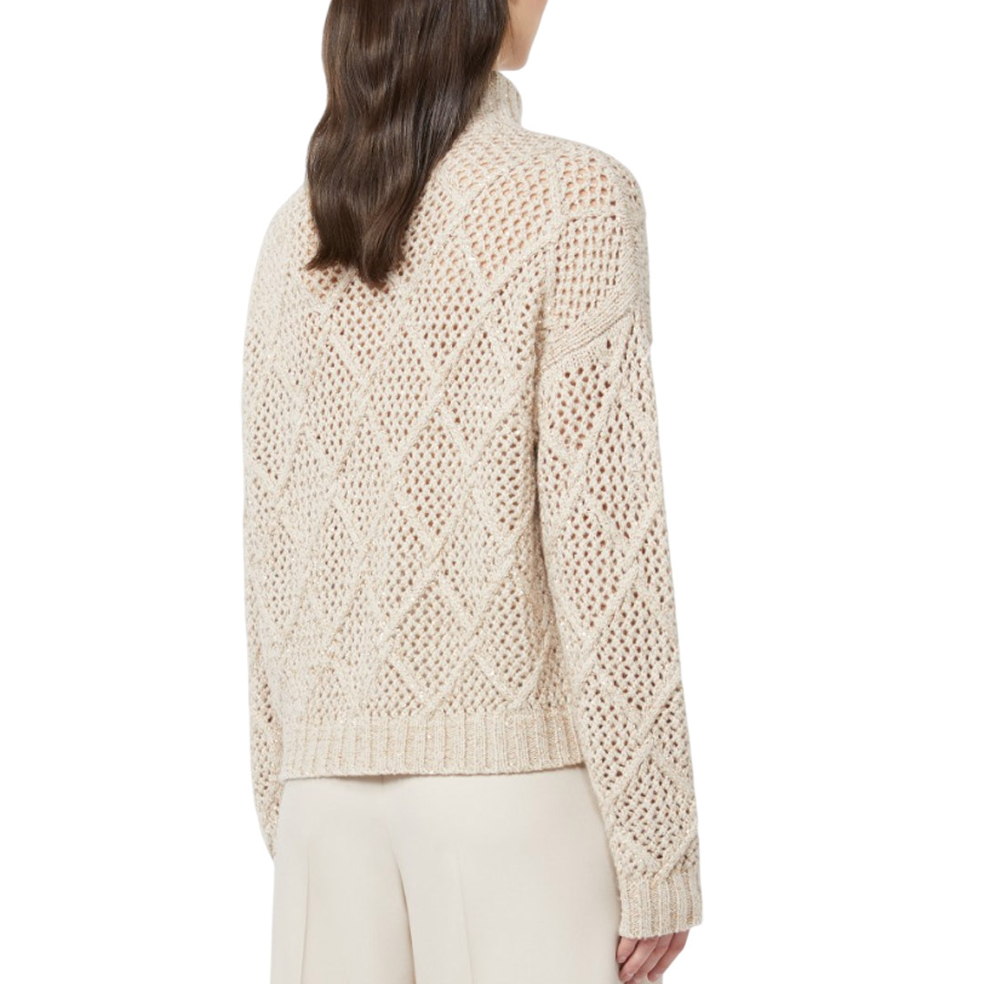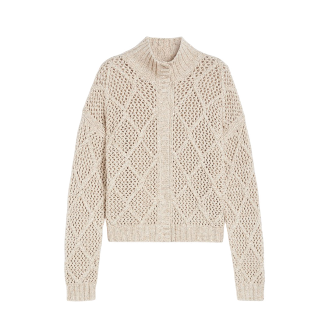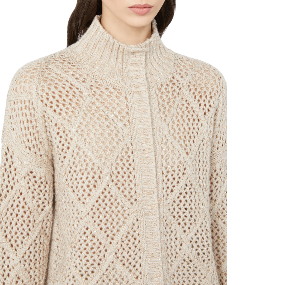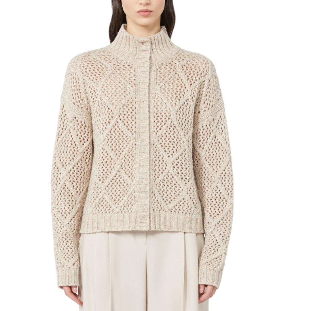 Wool and cashmere cardigan enriched with an all-over sequin embroidery that gives the garment brightness. The ribbed knit defines the collar, cuffs and edges. Wool and cashmere yarn cardigan. Comfort fit with a relaxed silhouette. Ribbed turtleneck. Long set-in sleeves. Front closure with hidden buttons, ribbed cuffs and hem. Diamond and mesh pattern inside.
