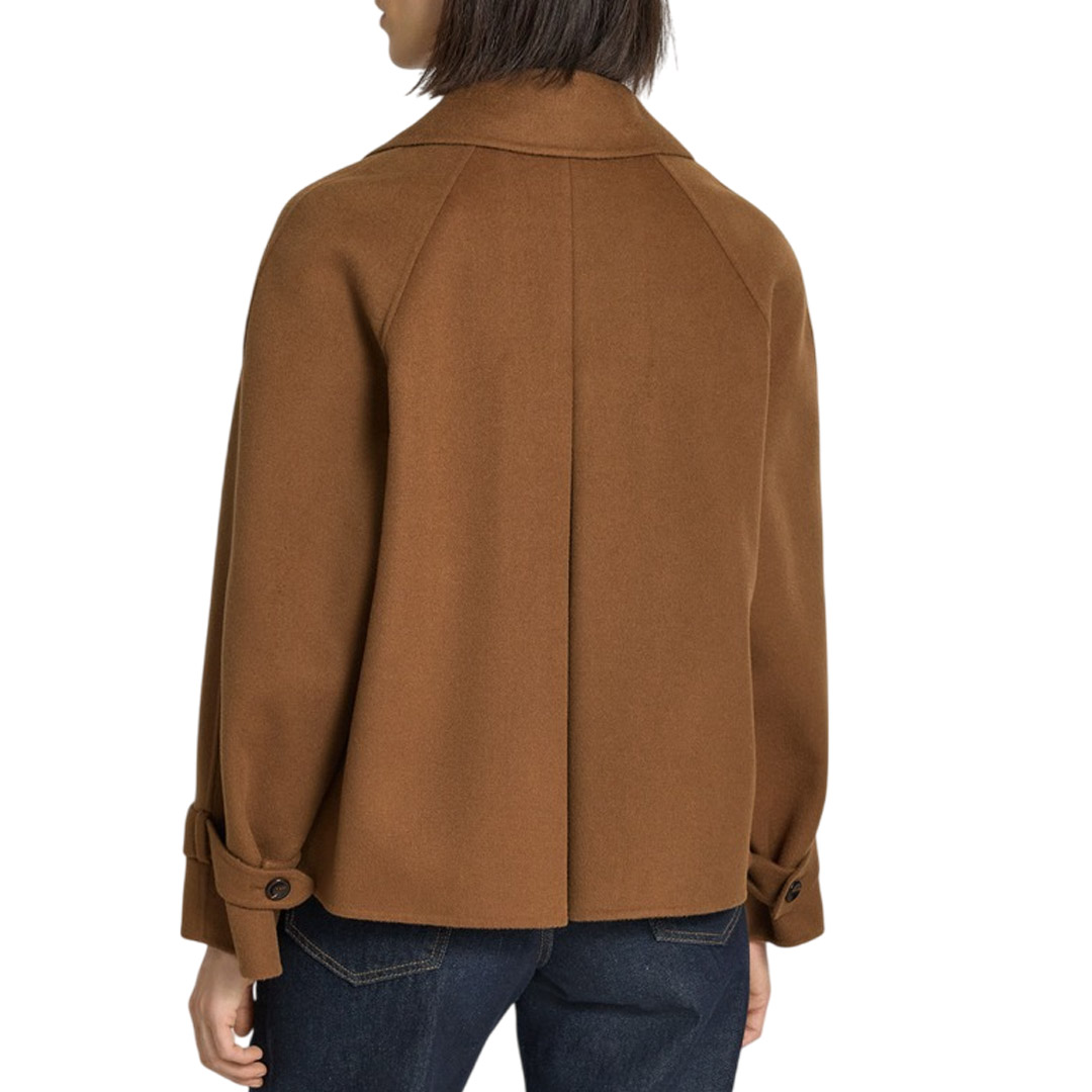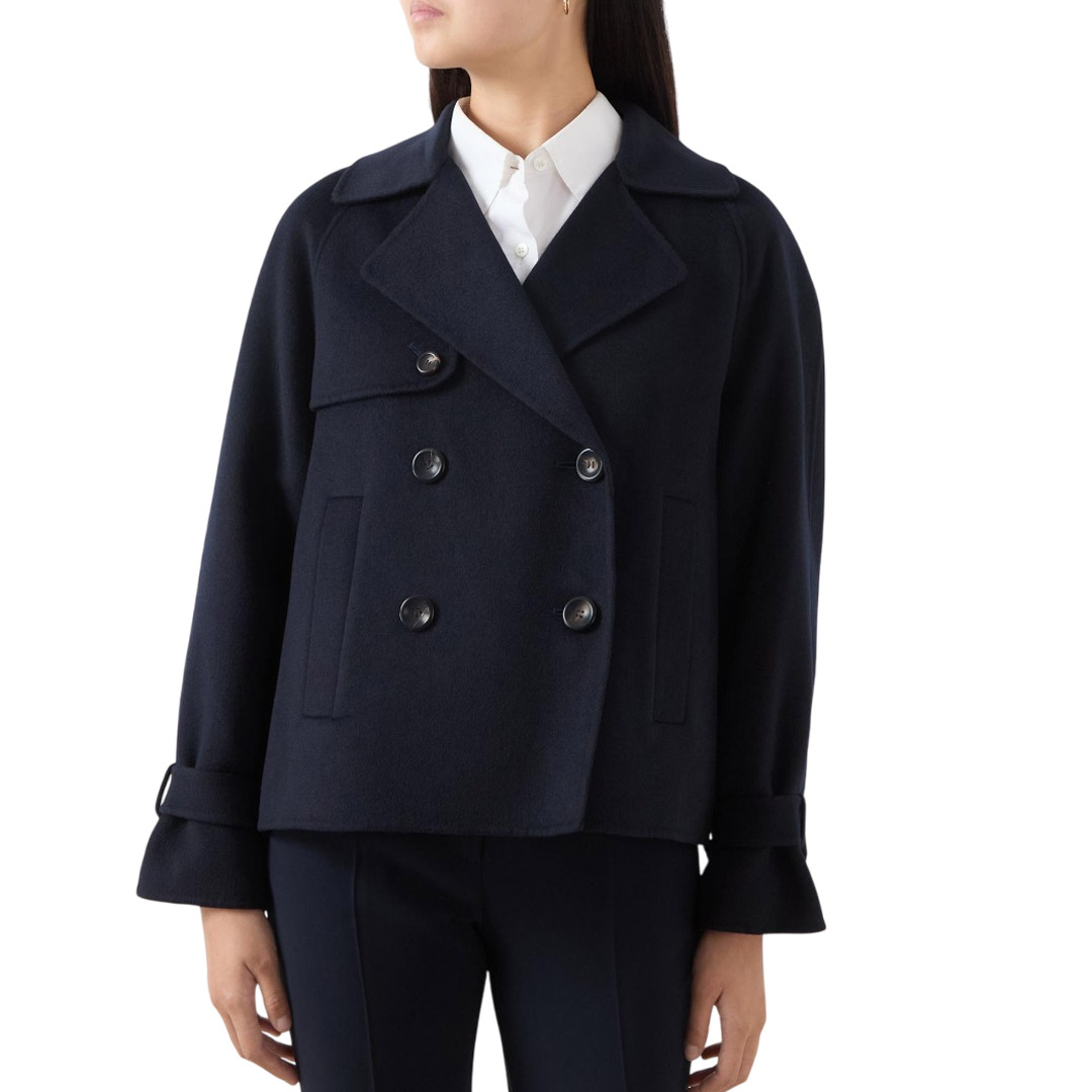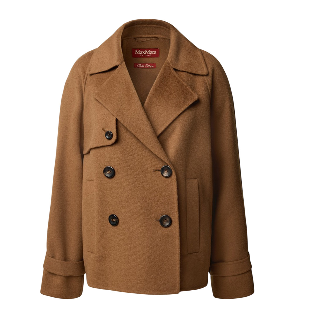 Double-breasted pea coat with iconic trench-style details. Double-drap pea coat in wool, cashmere and silk. Boxy fit. Lapel collar. Raglan sleeves with toggles on the cuffs. Closure with matching buttons. Welt pockets on the sides. Bavolet on the front and counter-pleat on the back.