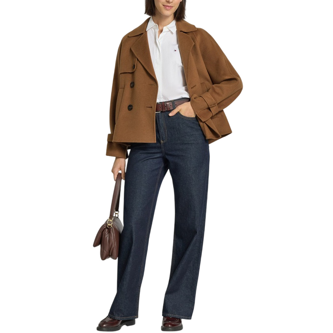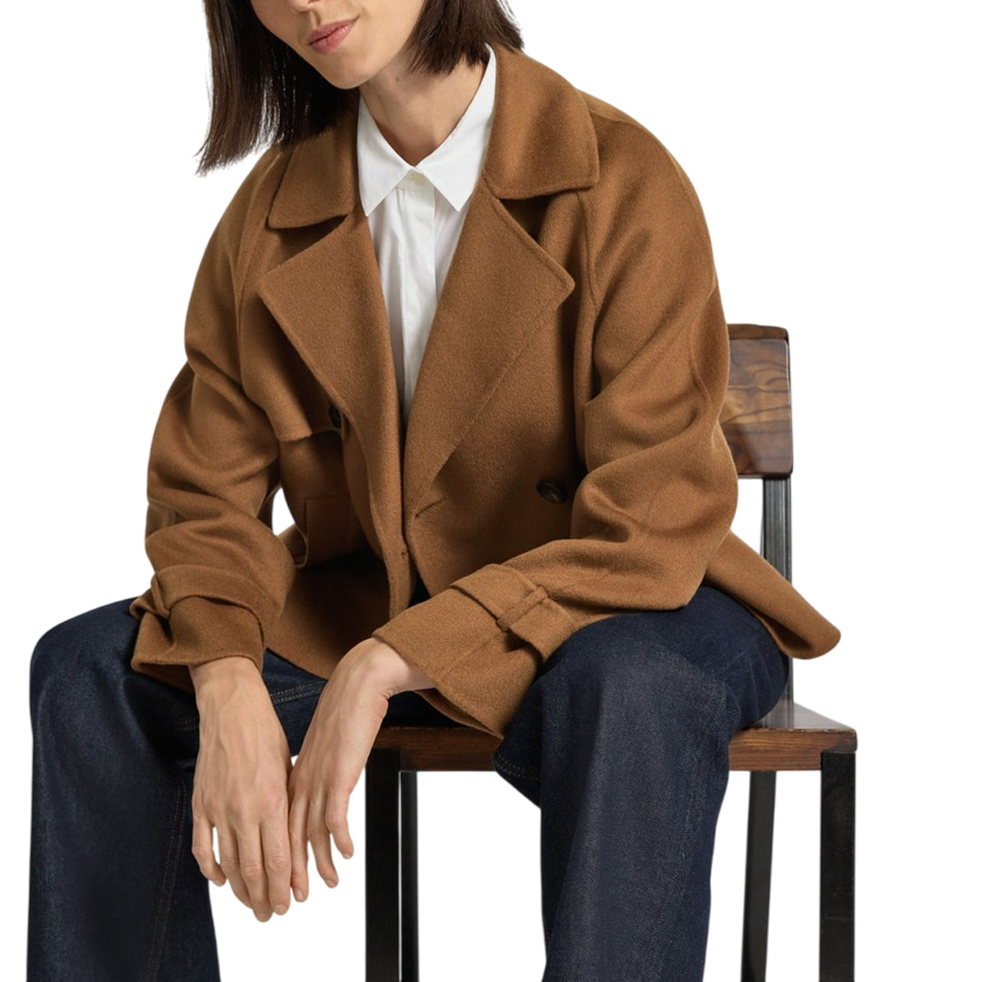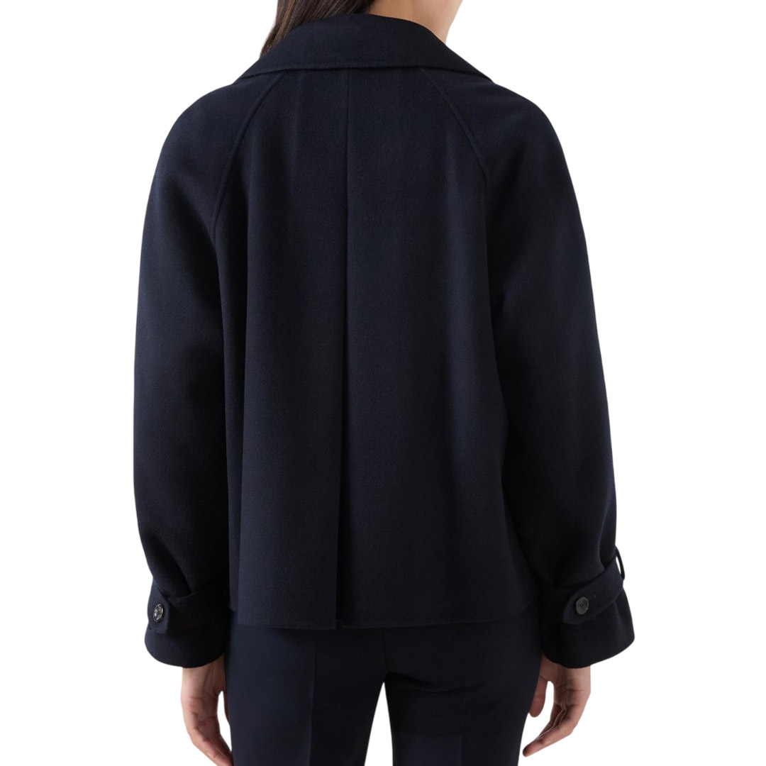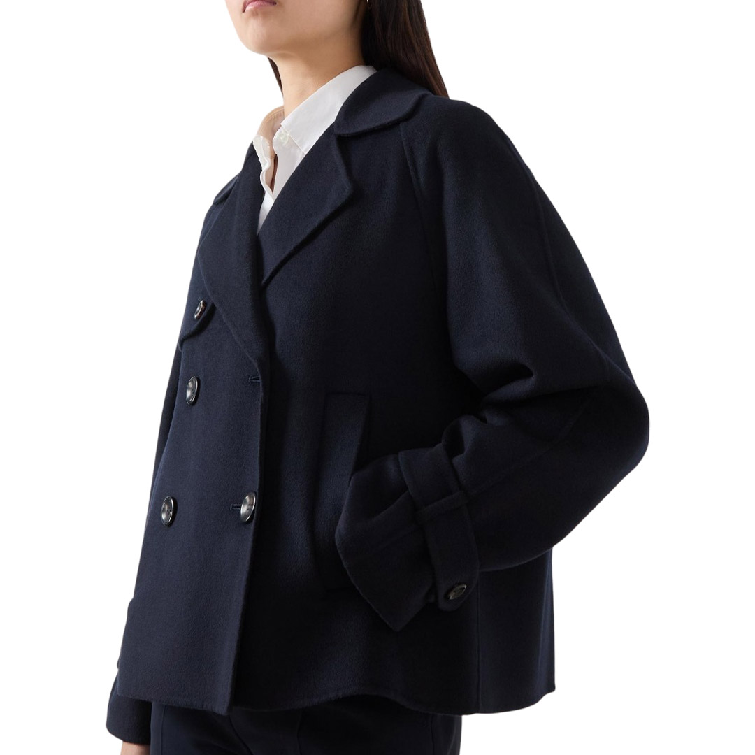 Double-breasted pea coat with iconic trench-style details. Double-drap pea coat in wool, cashmere and silk. Boxy fit. Lapel collar. Raglan sleeves with toggles on the cuffs. Closure with matching buttons. Welt pockets on the sides. Bavolet on the front and counter-pleat on the back.