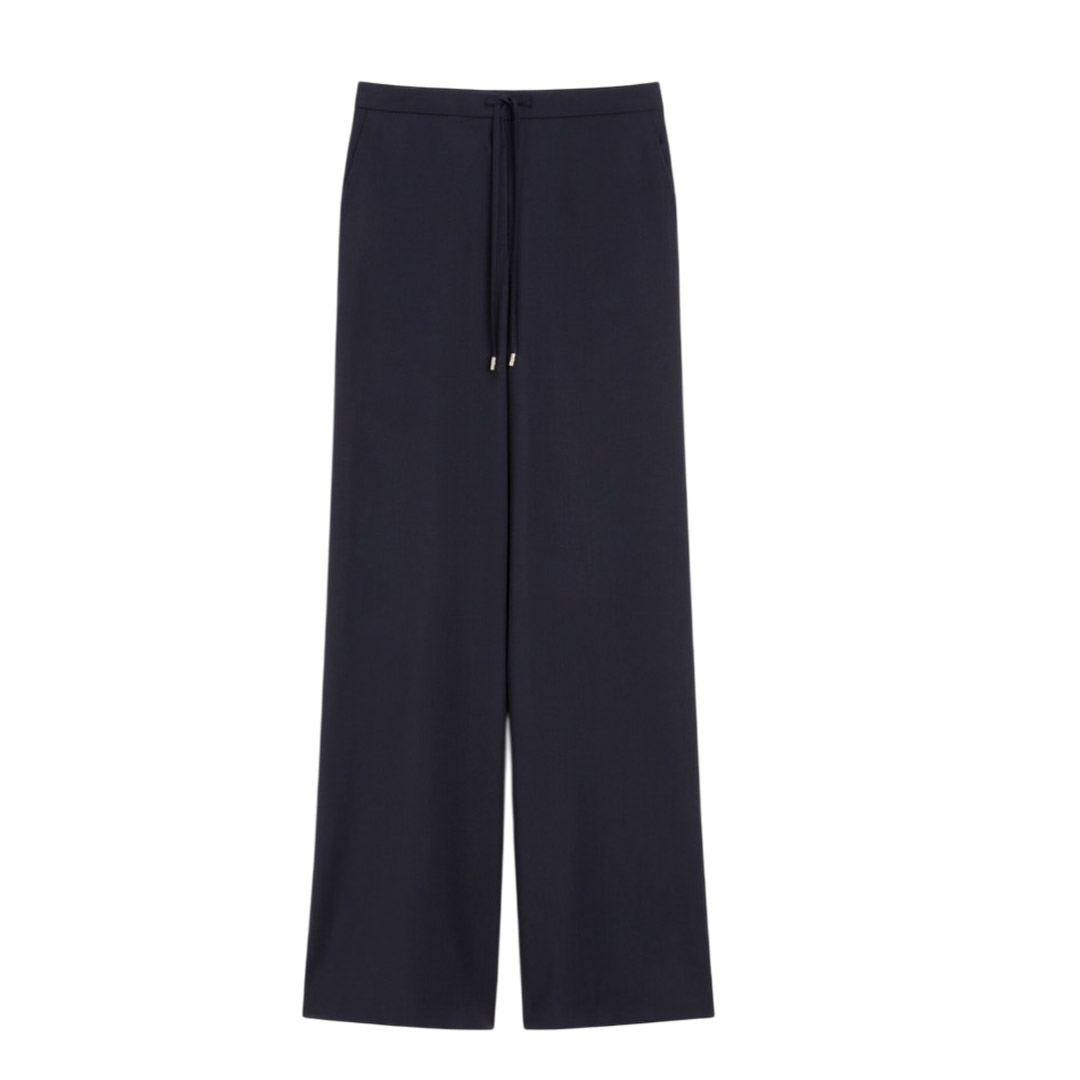 High-waisted trousers with drawstring and wide leg. Lightweight pure wool canvas trousers. High waistband closure, zip with flap and hook. French pockets on the sides. Elasticated insert at the waist on the back.