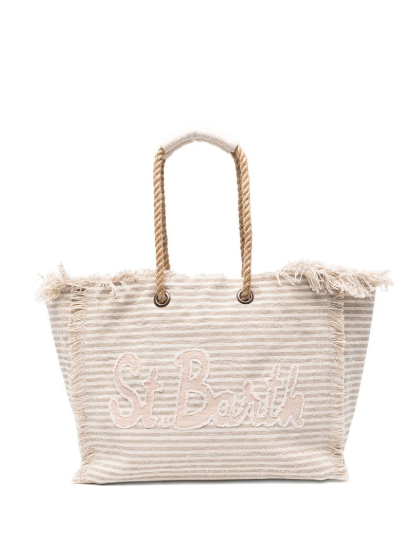 MC2 Saint Barth Beach Bag beige with horizontal striped pattern Dimensions: 20x32x40 cm Beige Frayed edges Horizontal striped pattern Two top handles Zip closure