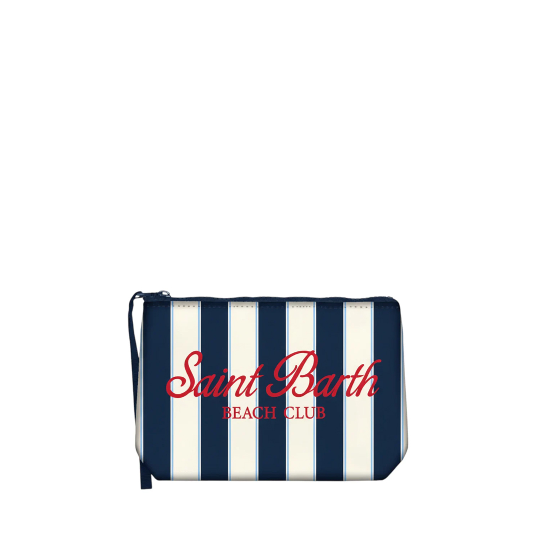 Saint Barth "Aline Beach Stripes 6131" clutch bag, white and blue, striped pattern, top zip closure, side wrist strap, "Saint Barth Beach Club" lettering logo print on the front. Dimensions: 20 x 14.5 x 7 cm.