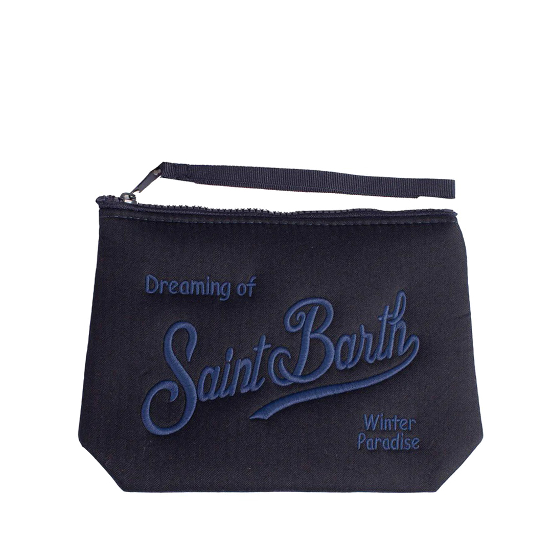 The Aline clutch bag by MC2 Saint Barth is the ideal accessory for adding a touch of elegance and practicality to your winter looks. Crafted from soft herringbone fabric in midnight blue, it stands out for its tone-on-tone embroidered "Dreaming of Saint Barth - Winter Paradise" lettering, lending it a refined and distinctive style. Perfect as a beauty case, travel bag, or everyday clutch, it combines minimal design and classy details to accompany you on any occasion. A practical and sophisticated accessory by MC2 Saint Barth, perfect for those who love to travel or want a touch of glamour in their everyday life. Dimensions: 20 x 14.5 x 7 cm