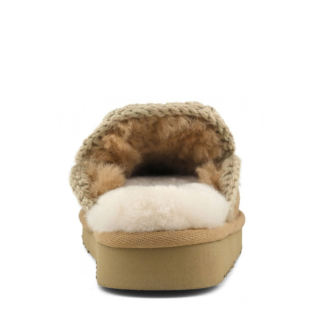 A winter must-have: the Mou Eskimo slipper with EVA sole, handmade from authentic double-faced sheepskin and embellished with Mou's signature crocheted wool stitching. Ideal for relaxing, this shoe offers extraordinary comfort thanks to its lightweight EVA and rubber sole.