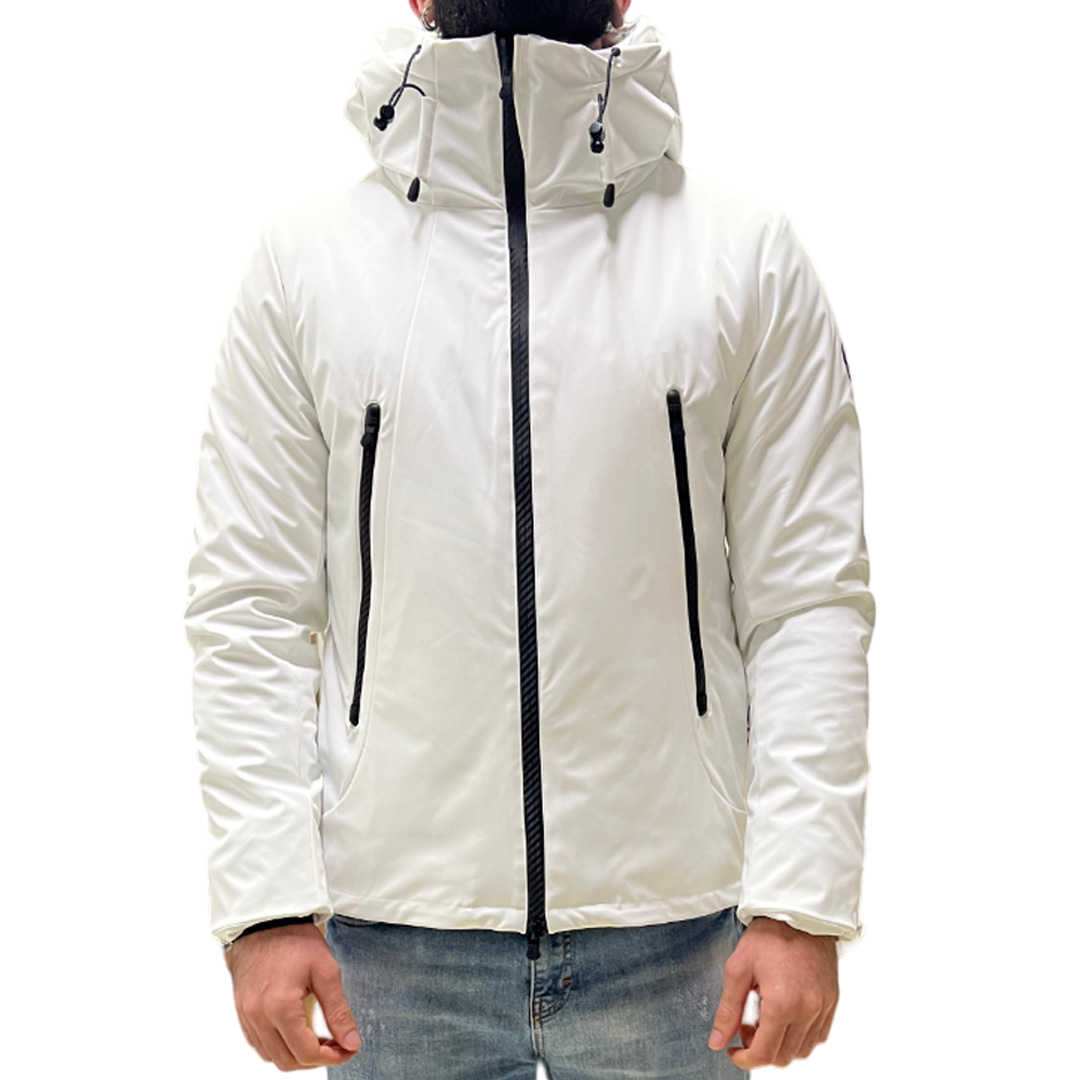 Jacket with hood in water-repellent and breathable technical fabric with quilted interior with 100% recycled “FELLEX” thermal insulation. Water repellent and windproof zip with personalized easy close double slider rubber, zip guard with laser cut customisation. Internal and external reflective hood edge. Personalized tricolor reflective internal neck tape. Internal cuffs in technical lycra for greater protection from external atmospheric agents and thermal performance. Rubberized logo on left sleeve. Zip slider garage with personalized rubber on external pockets. Internal heat-taped document pockets. Contrast internal zip pockets. High visibility reflective details.