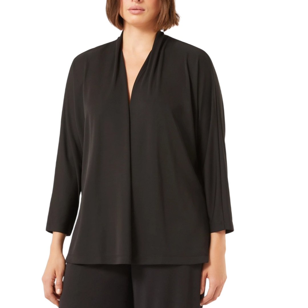 Coat georgette, from the straight line, with V-shaped neckline, sleeves in transparency with ruffles, side slits at the bottom.