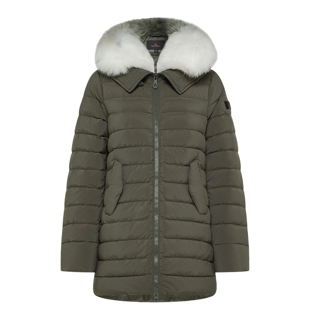 Quilted down jacket in natural feather, in light nylon and polyester microfiber which, thanks to the dyeing temperature of 130 ° C, changes, acquiring a structured hand and a dusty touch. The final treatment with silicone makes the fabric extremely soft. Full central zip with double slider, large side pockets and fox fur collar in color tone with the garment. The versatile model allows multiple combinations and accompanies various occasions of use with impeccable style. Water repellent. Regular fit Central closure with double-slider zip Length: long Natural feather padding Fixed hood and fur collar In light nylon and polyester microfiber