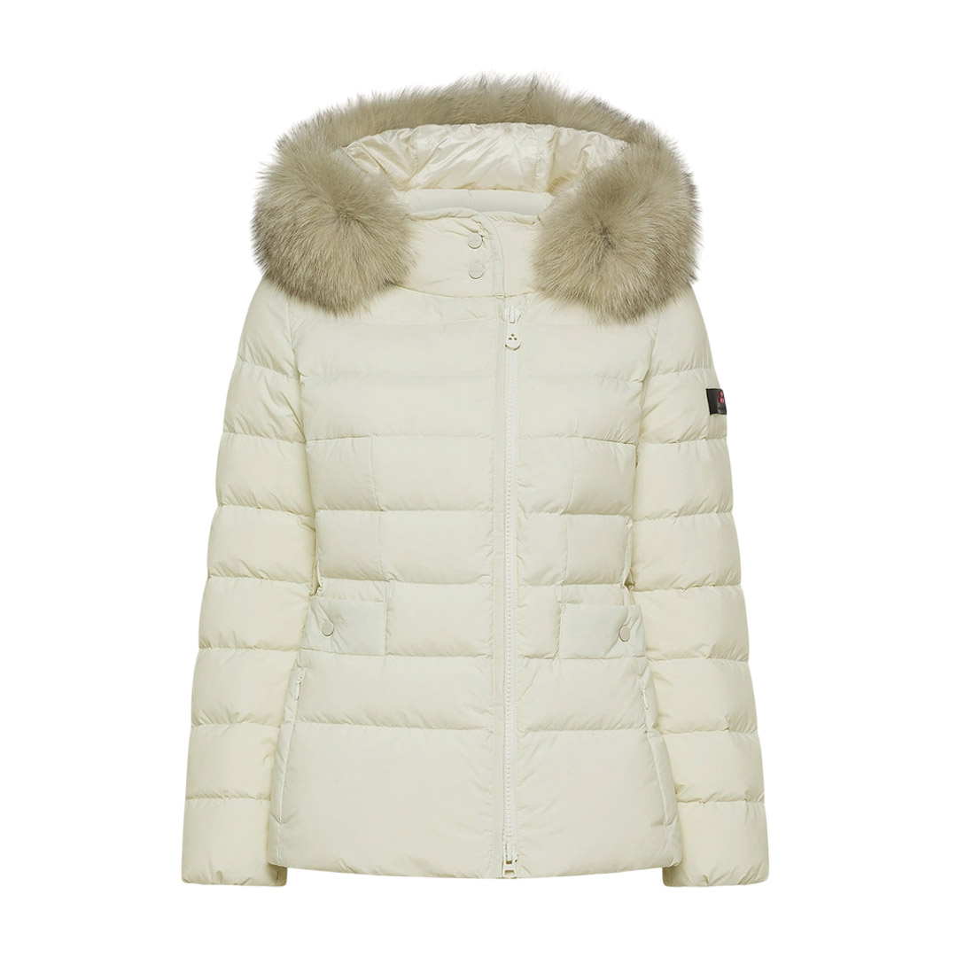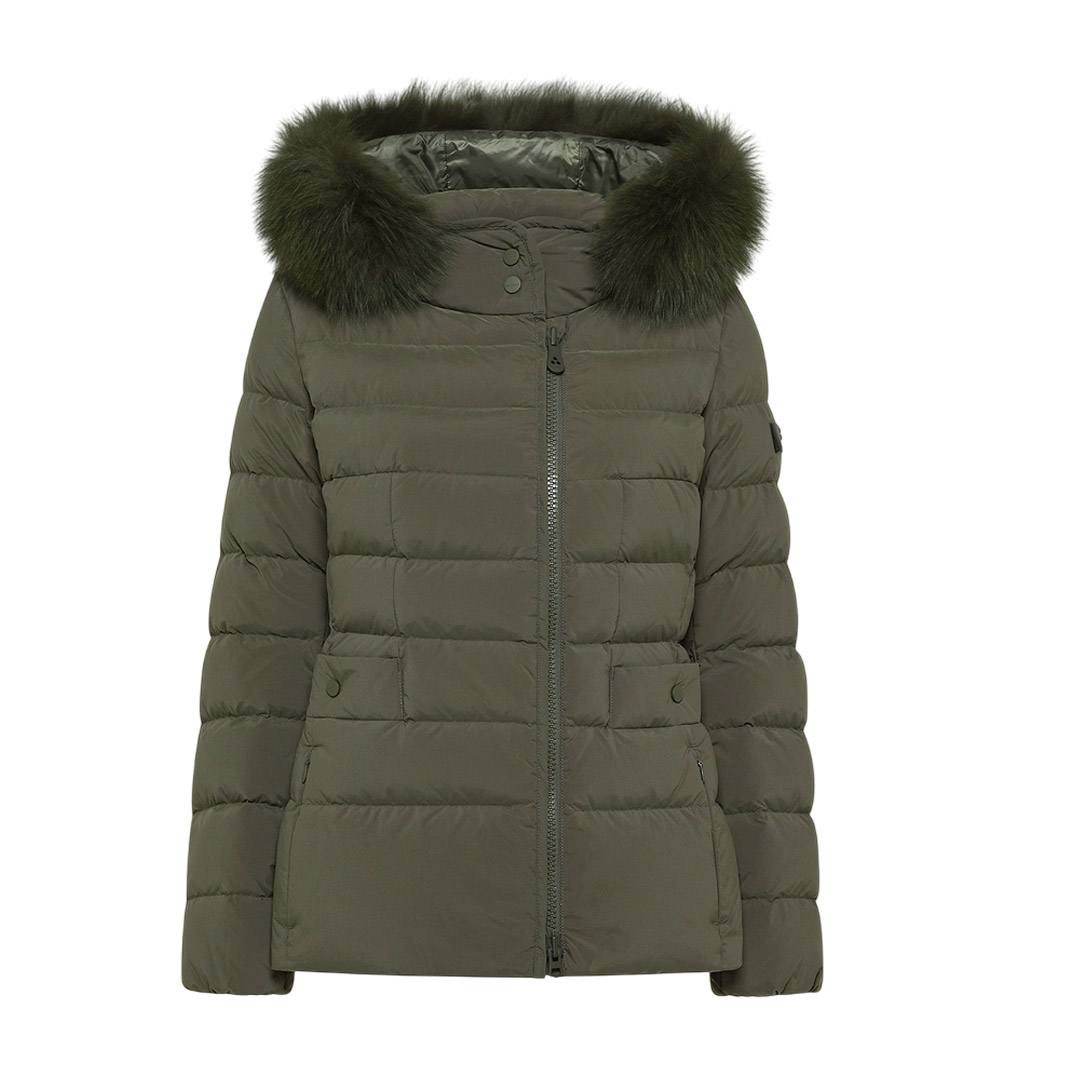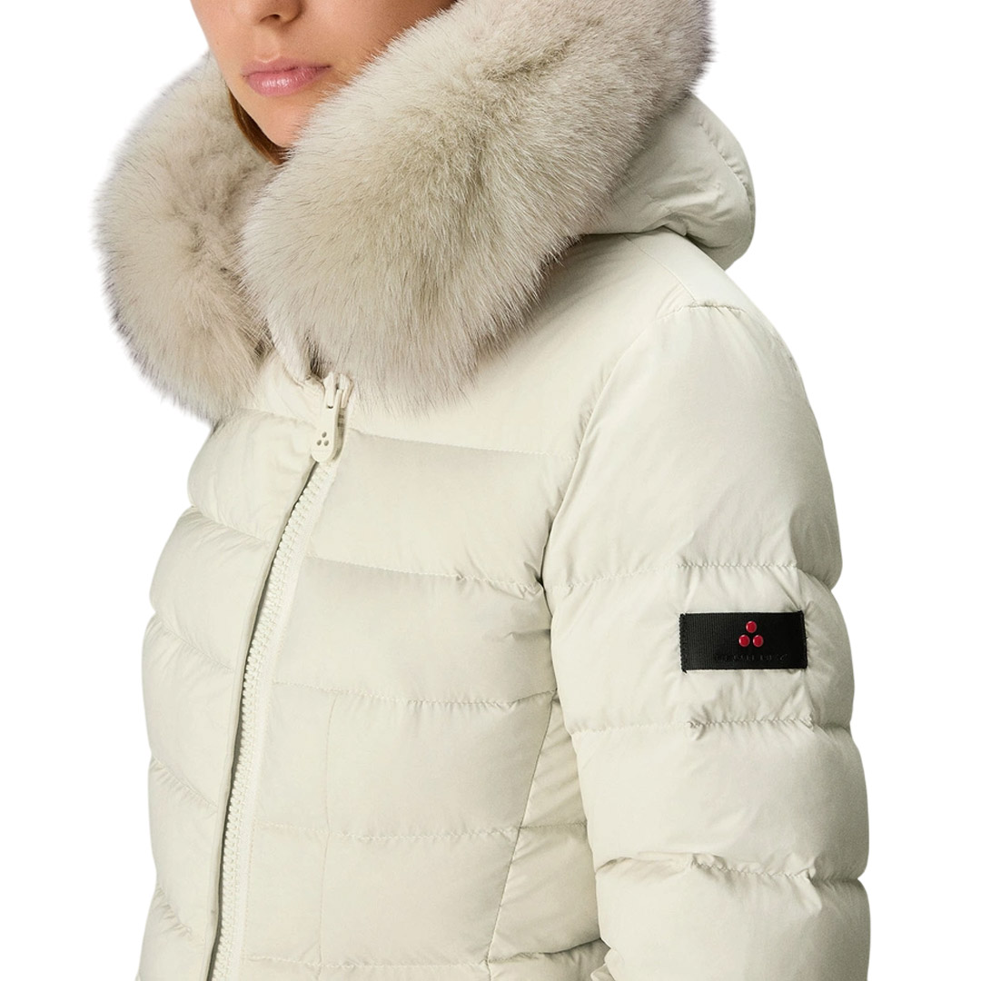 Short and soft down jacket, made of lightweight nylon poplin and polyester microfiber, processed at high temperatures to achieve a firm hand and a powdery feel, further softened by a final silicone treatment. The channeled padding in certified natural down ensures warmth and lightness, while the removable hood with fox fur trim adds a sophisticated touch. The asymmetrical central zip adds movement to the essential and feminine shape of the garment, completed by a collar with a double snap button in the same color and side pockets with hidden snap closures. Water repellent, designed to follow your movements, ensuring maximum protection on the coldest days. Hood with fox fur trim Made of nylon poplin and polyester microfiber Full asymmetrical central zip Natural down padding Water repellent Length: short