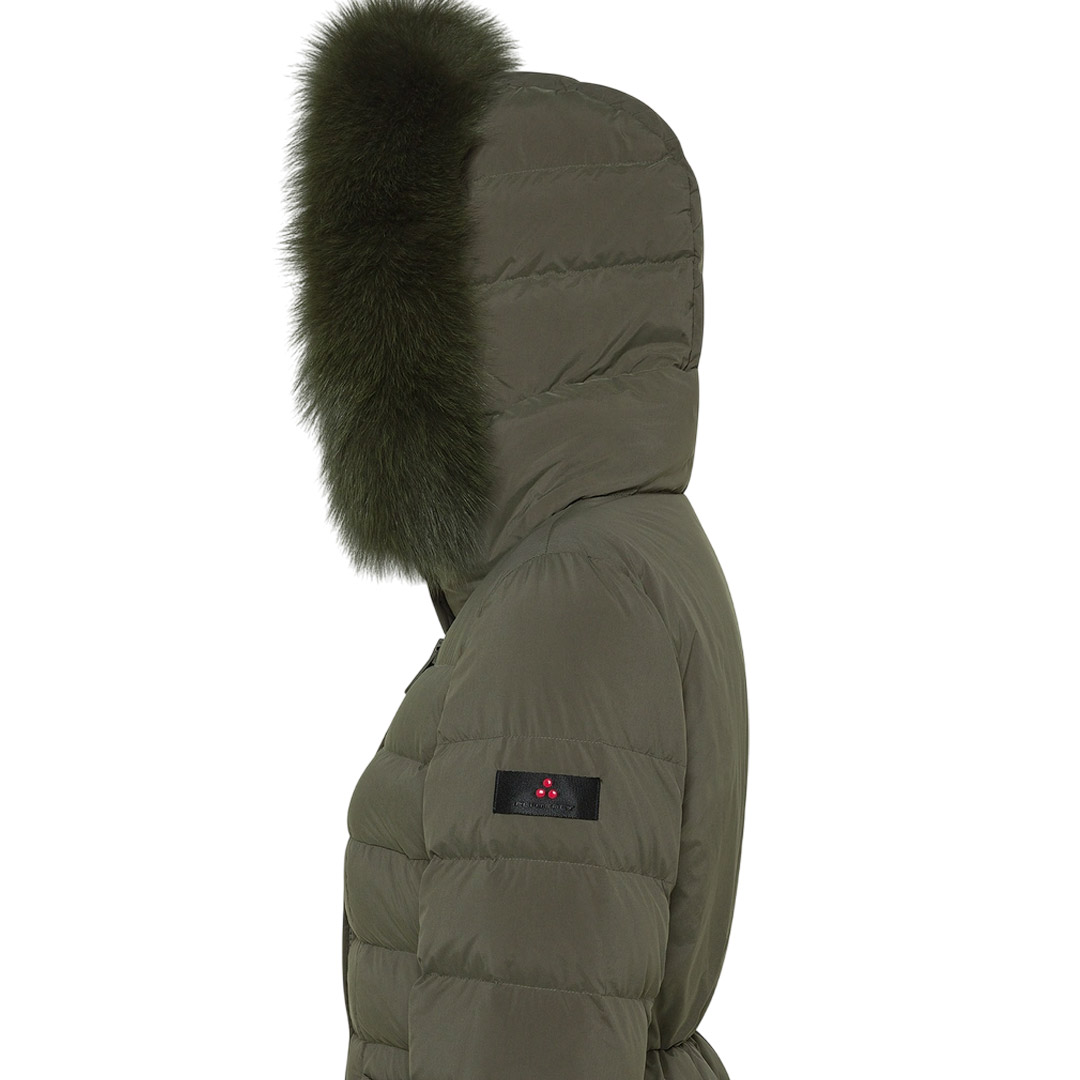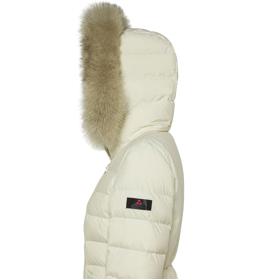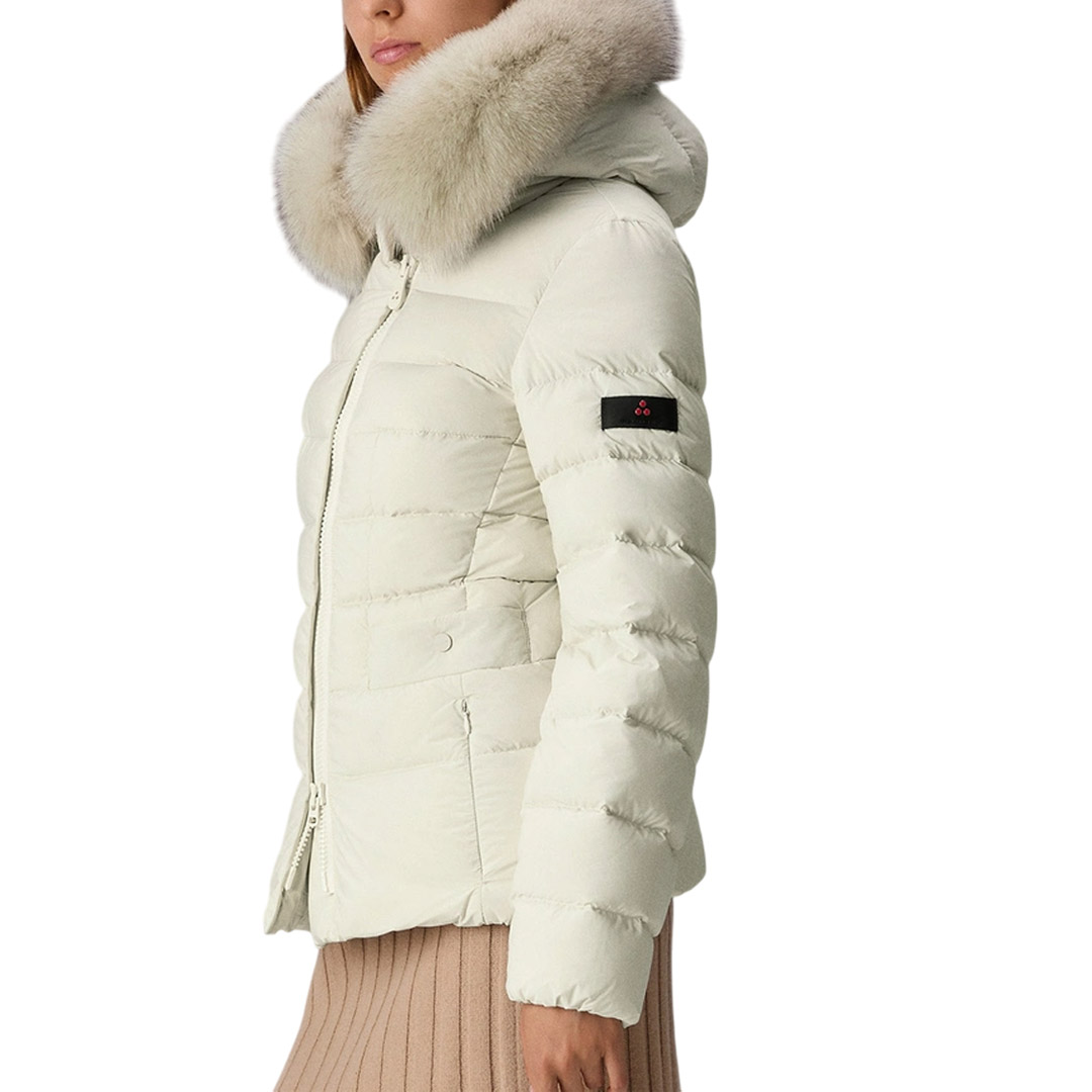 Short and soft down jacket, made of lightweight nylon poplin and polyester microfiber, processed at high temperatures to achieve a firm hand and a powdery feel, further softened by a final silicone treatment. The channeled padding in certified natural down ensures warmth and lightness, while the removable hood with fox fur trim adds a sophisticated touch. The asymmetrical central zip adds movement to the essential and feminine shape of the garment, completed by a collar with a double snap button in the same color and side pockets with hidden snap closures. Water repellent, designed to follow your movements, ensuring maximum protection on the coldest days. Hood with fox fur trim Made of nylon poplin and polyester microfiber Full asymmetrical central zip Natural down padding Water repellent Length: short