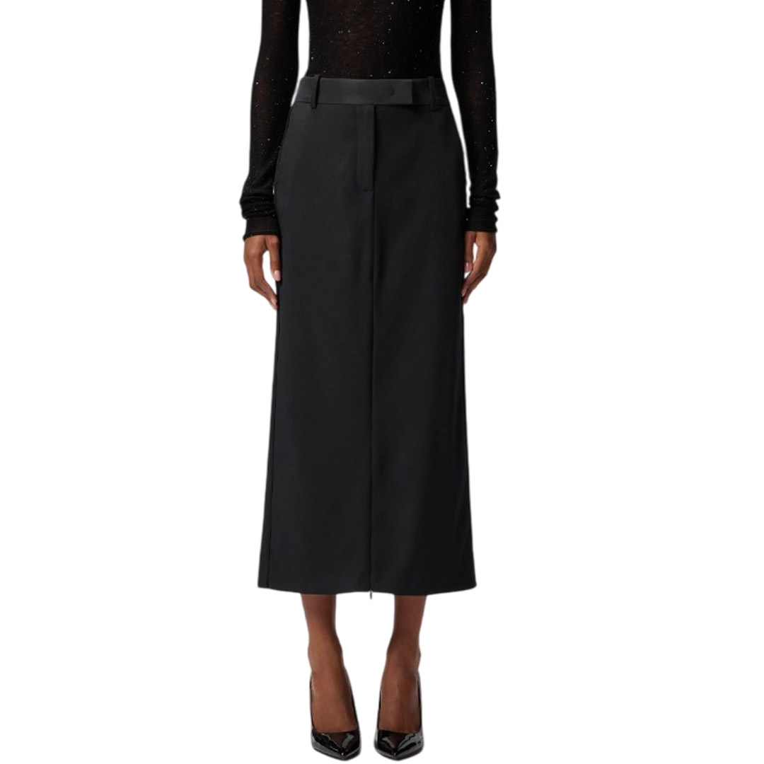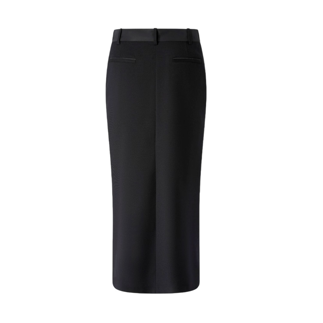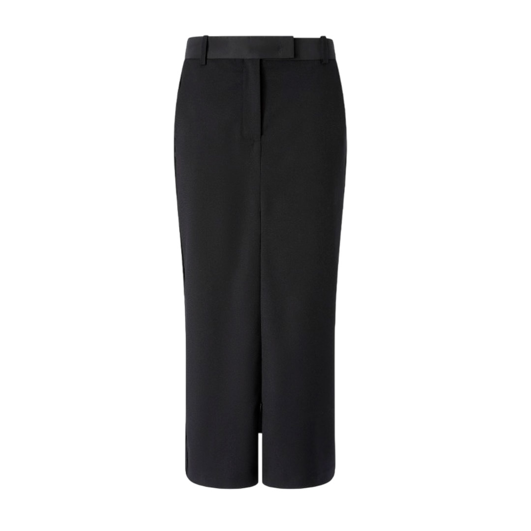 Fitted pencil skirt crafted from a wool blend with a diagonal weave and a frosted, flowing feel. The tailored design features belt loops, a concealed front closure, back welt pockets, and a sophisticated zip-adjustable front slit for a feminine touch. Thanks to its versatility, this style is perfect for even the most special occasions, perhaps paired with a sophisticated blazer.