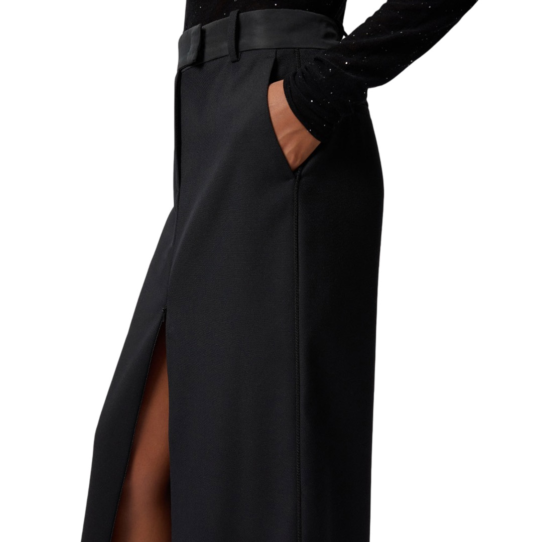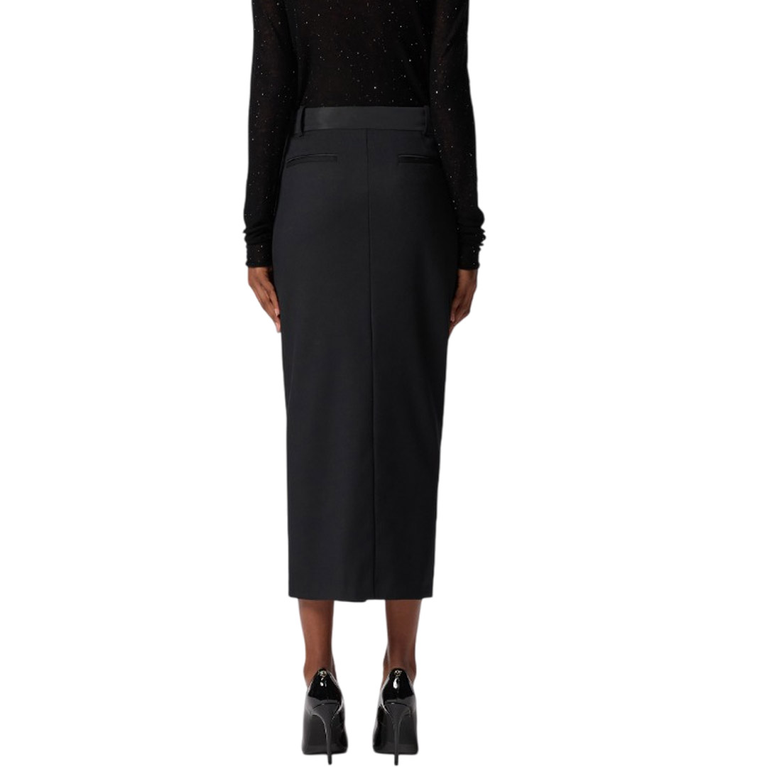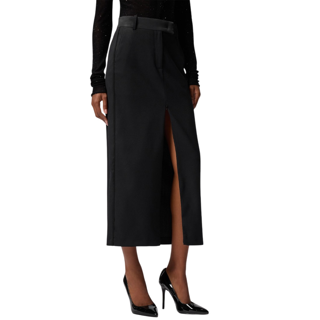 Fitted pencil skirt crafted from a wool blend with a diagonal weave and a frosted, flowing feel. The tailored design features belt loops, a concealed front closure, back welt pockets, and a sophisticated zip-adjustable front slit for a feminine touch. Thanks to its versatility, this style is perfect for even the most special occasions, perhaps paired with a sophisticated blazer.