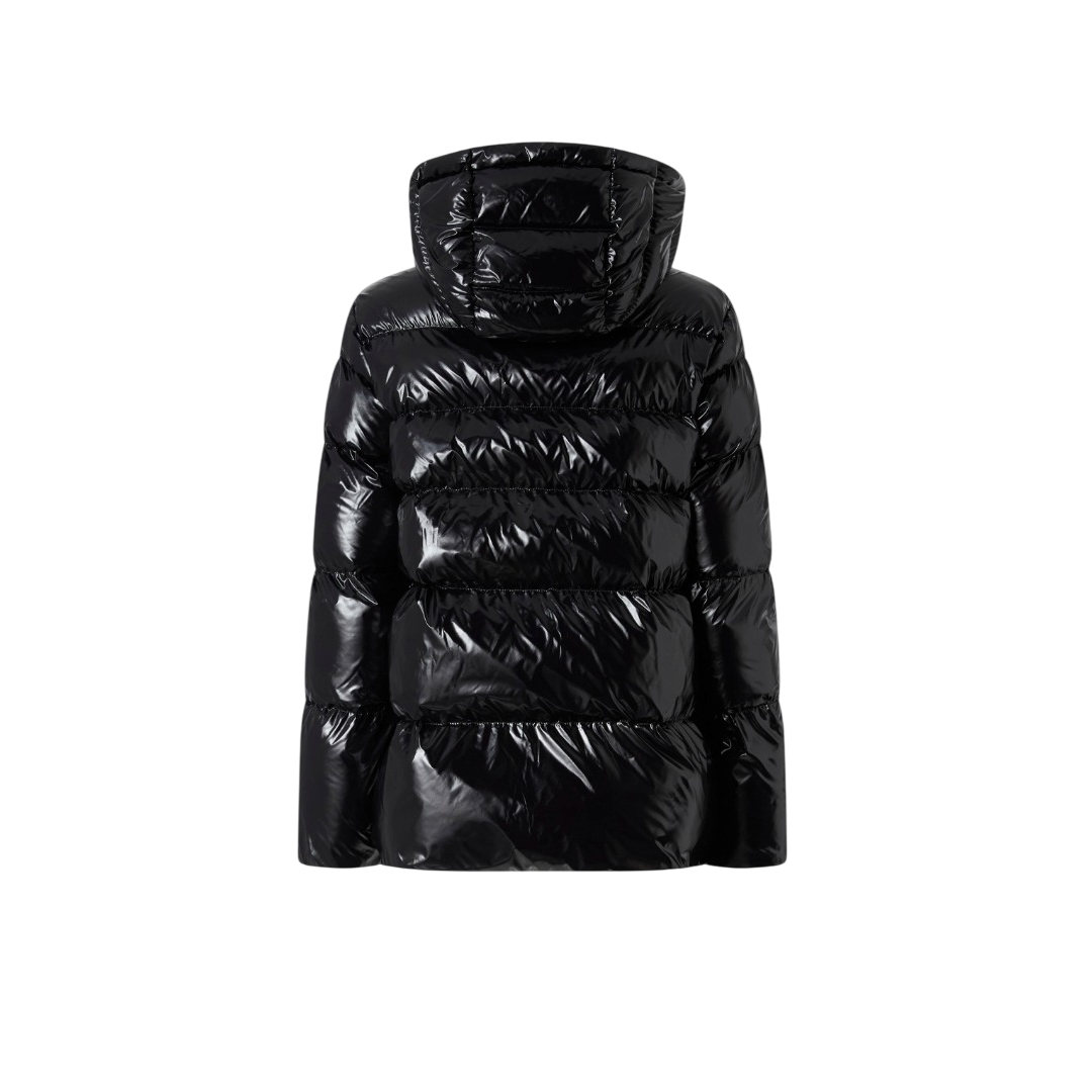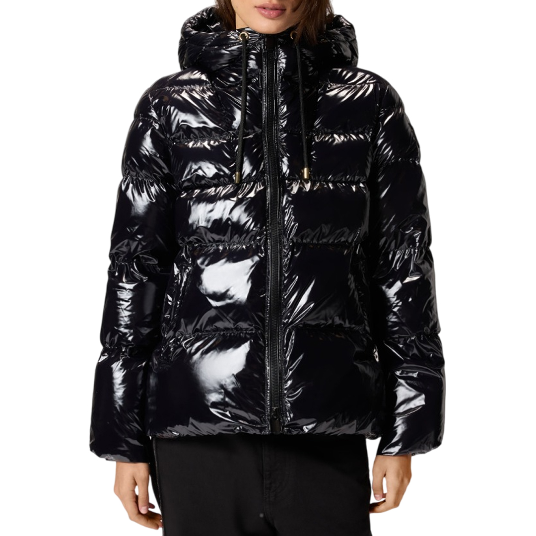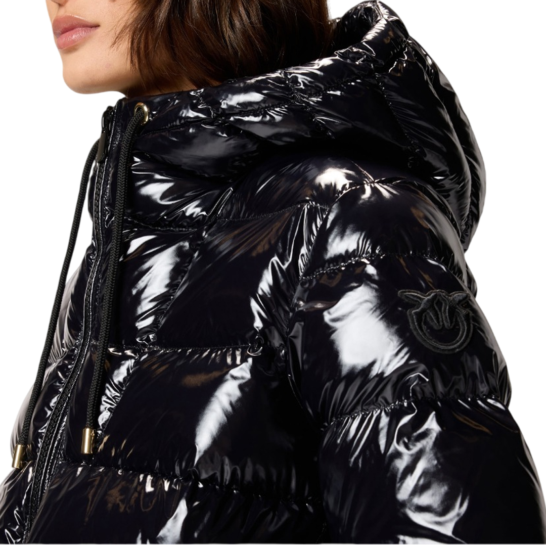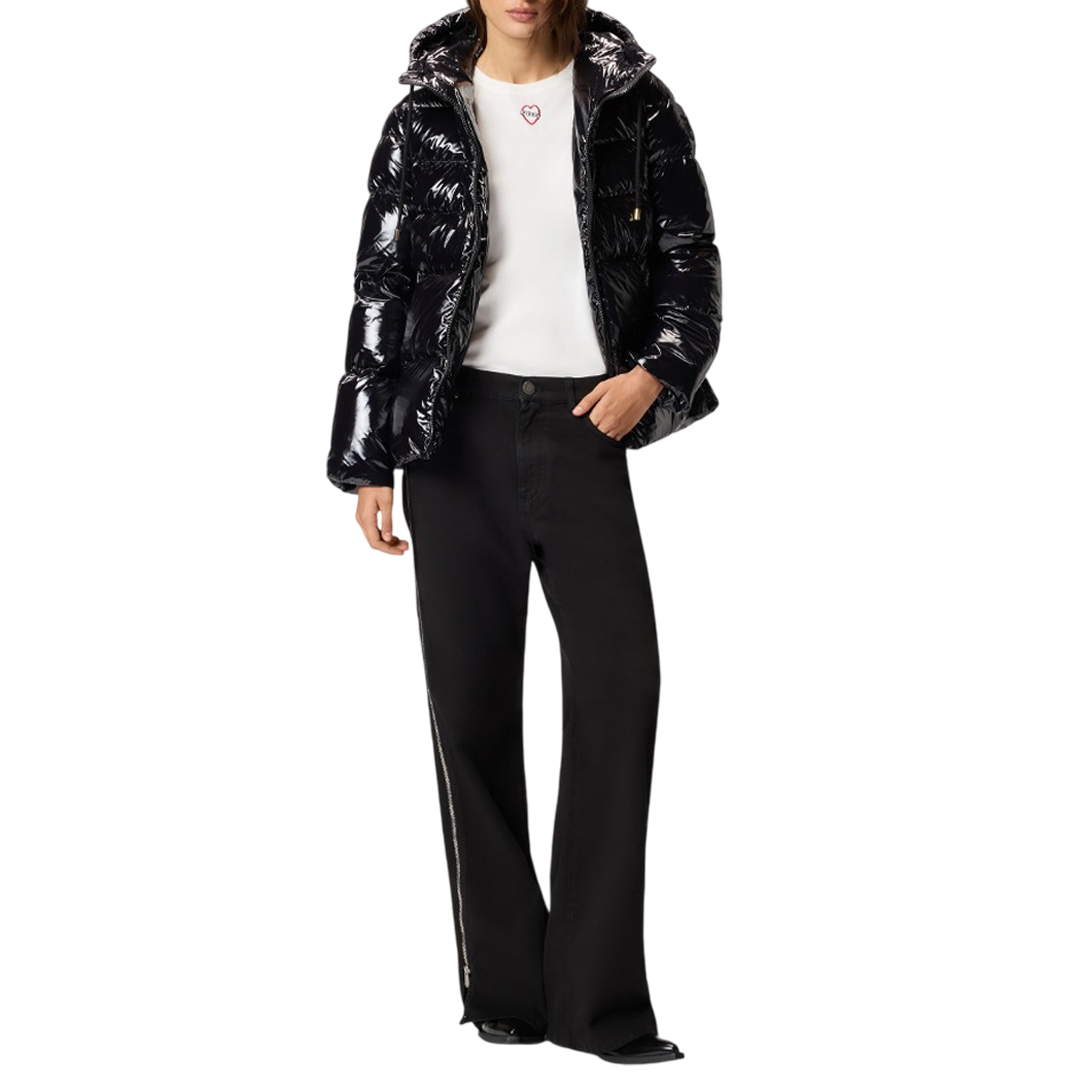 Padded down jacket with a peacoat silhouette in crystal nylon with a distinctive shiny finish, personalized with a Love Birds logo patch on one sleeve. Hooded collar with drawstring and metal trim, long sleeves, and vertical welt pockets at the sides. The outerwear is lined for added comfort. Two-way zip closure at the front.