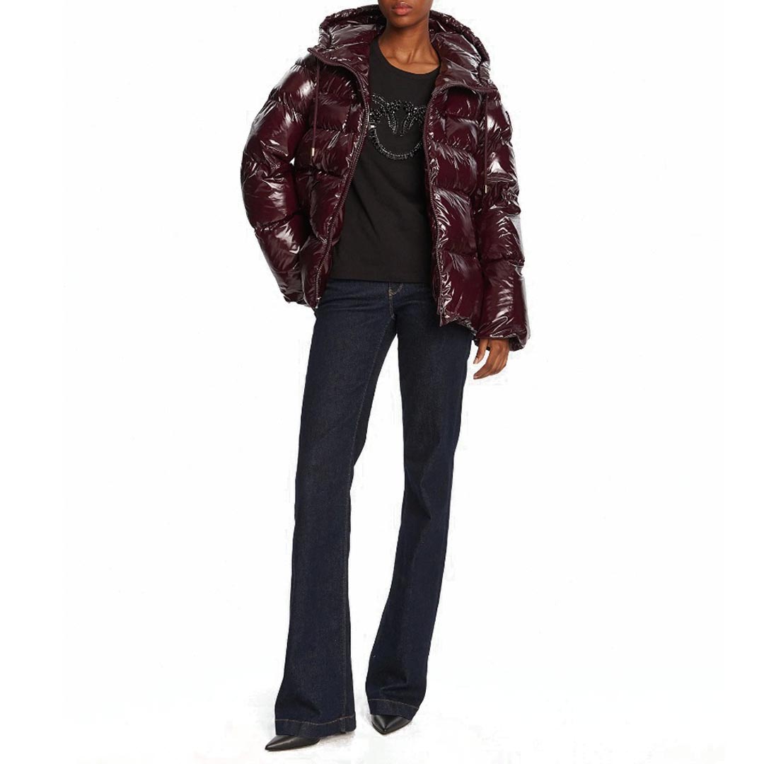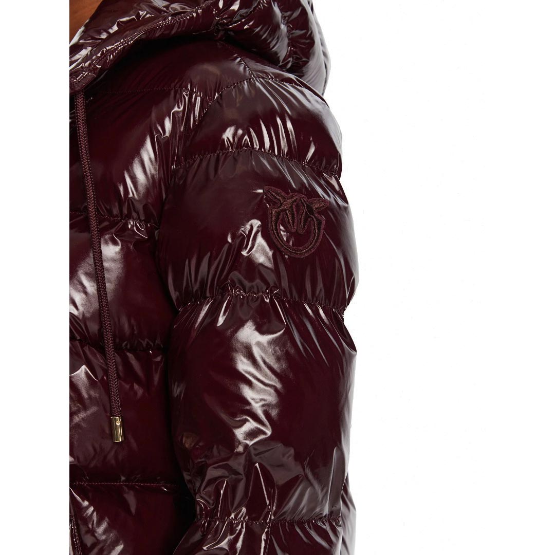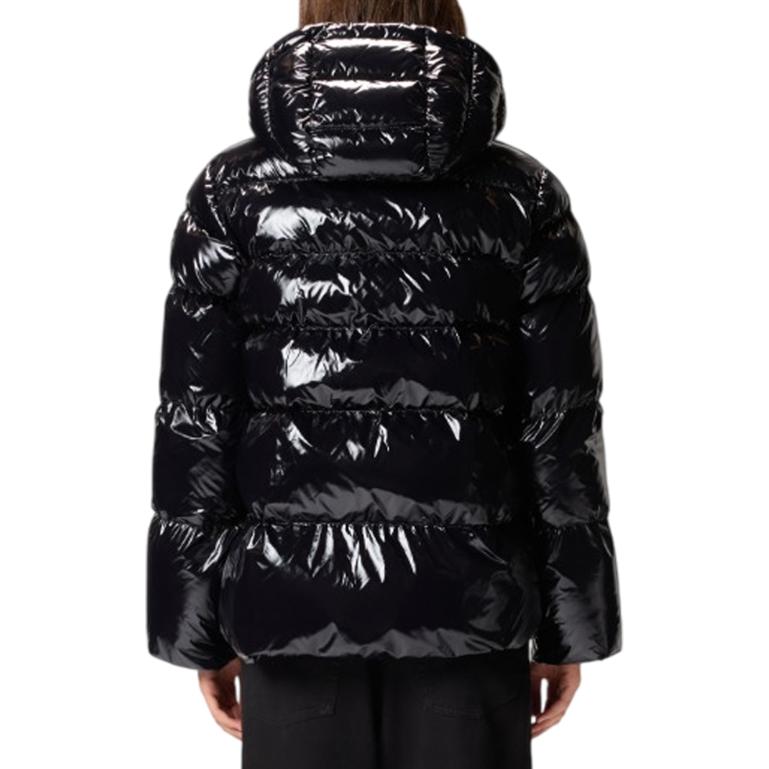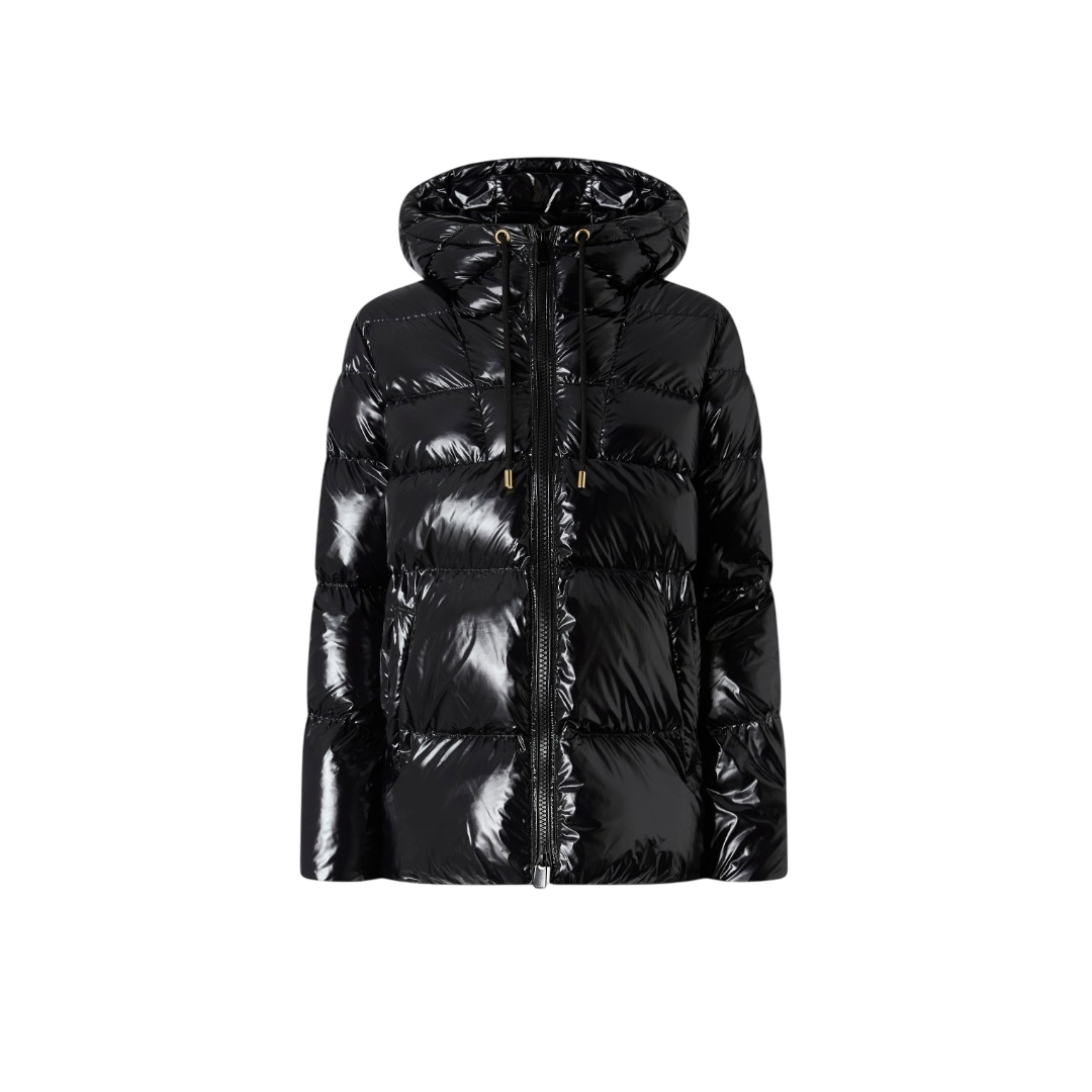 Padded down jacket with a peacoat silhouette in crystal nylon with a distinctive shiny finish, personalized with a Love Birds logo patch on one sleeve. Hooded collar with drawstring and metal trim, long sleeves, and vertical welt pockets at the sides. The outerwear is lined for added comfort. Two-way zip closure at the front.