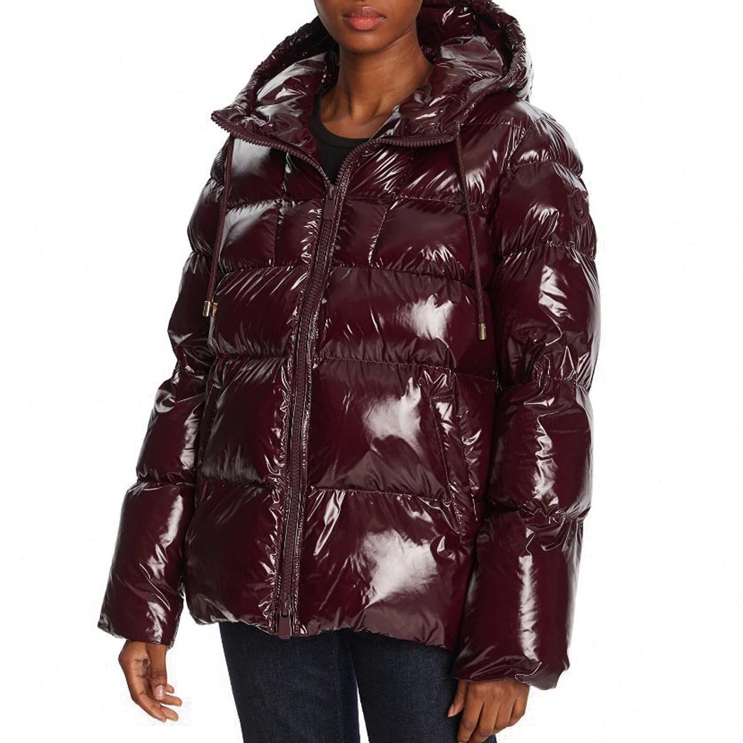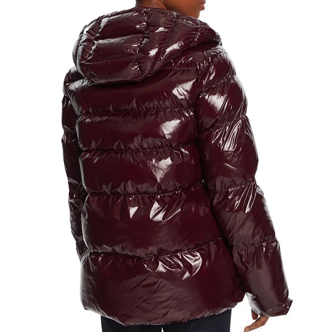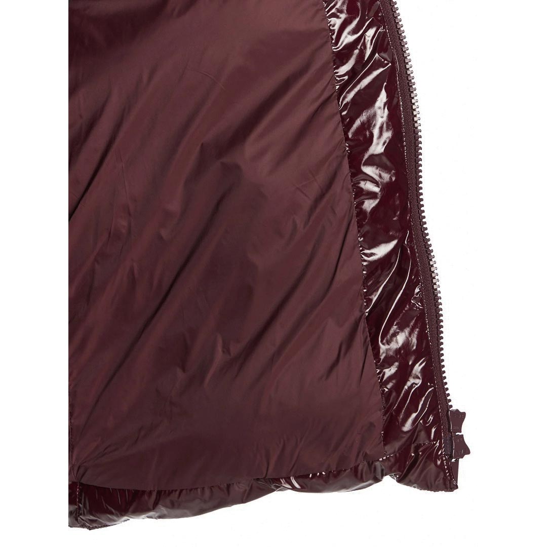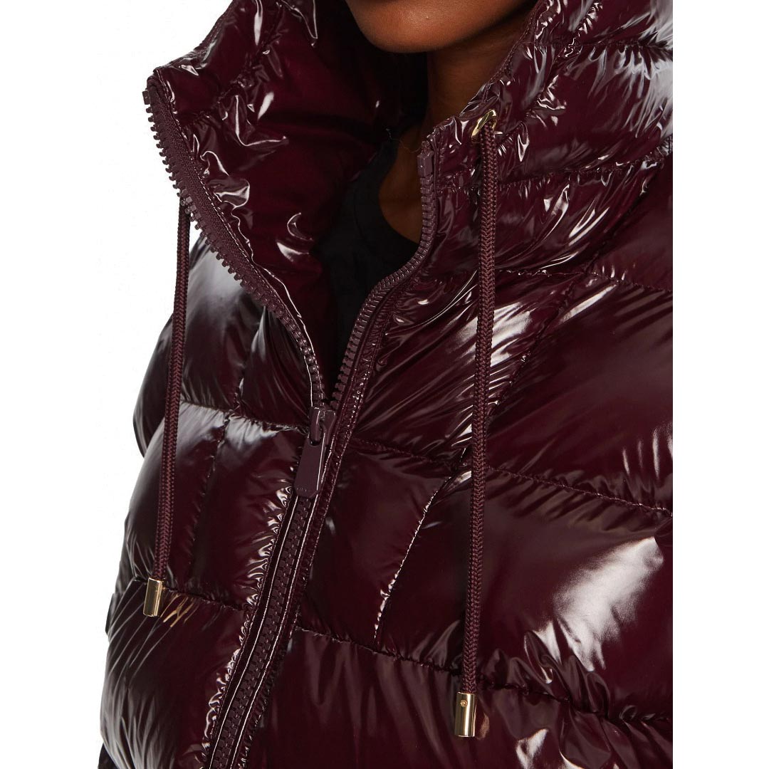 Padded down jacket with a peacoat silhouette in crystal nylon with a distinctive shiny finish, personalized with a Love Birds logo patch on one sleeve. Hooded collar with drawstring and metal trim, long sleeves, and vertical welt pockets at the sides. The outerwear is lined for added comfort. Two-way zip closure at the front.