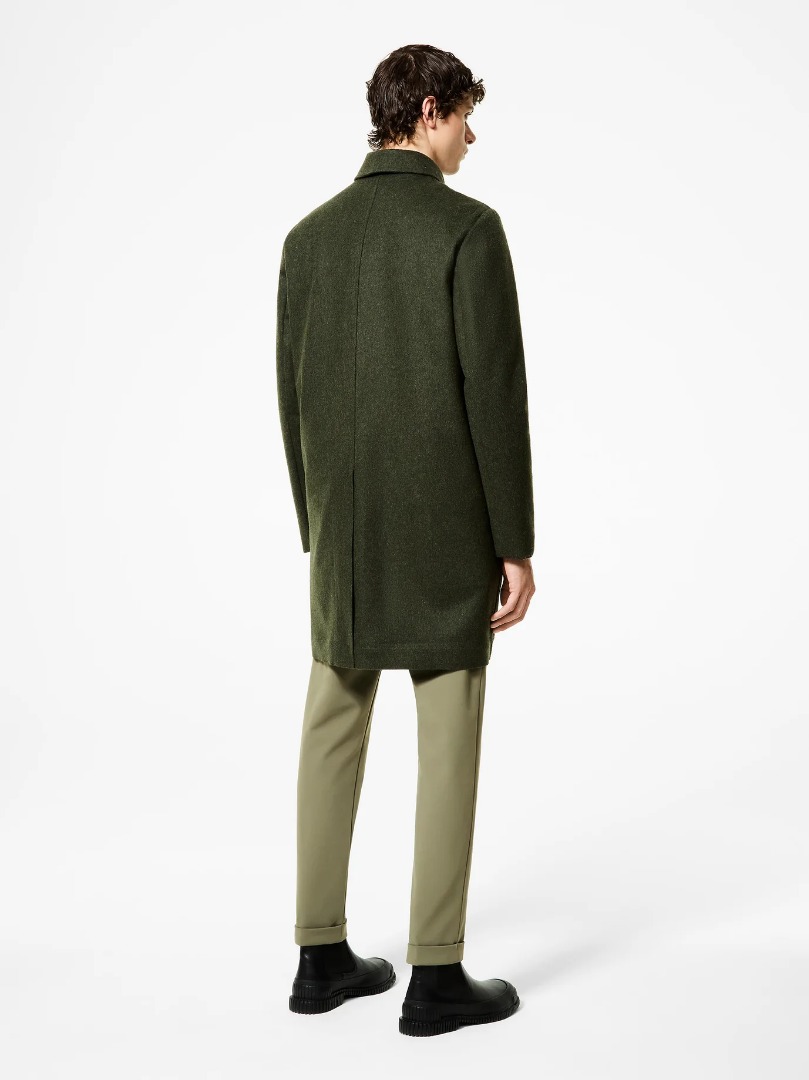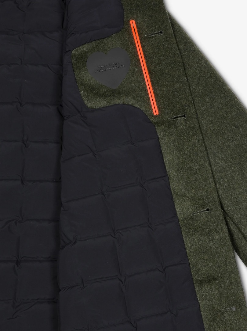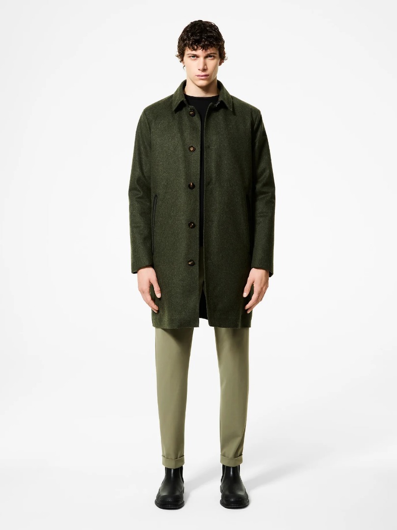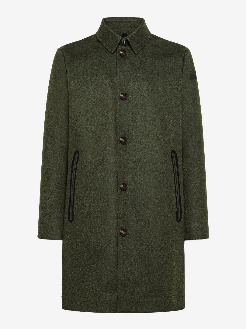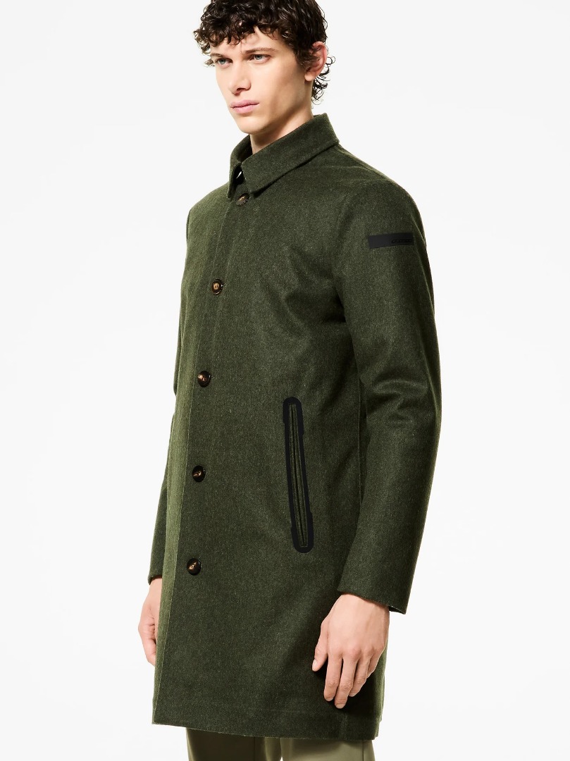 This regular-fit loden overcoat stands out for its sturdy, breathable membrane fabric, featuring a premium forest green Moessmer wool exterior, and its fully heat-sealed construction. Blending classic style with technological innovation, this coat is embellished with tailored details, such as the shirt collar with a metal hook and the luxurious horn button placket, which creates a modern contrast with the black heat-sealed seams that highlight the large side pockets. The soft and warm 90/10 duck down padding is contained within the "square" tube, which prevents the material from escaping. The innovative Floating Shield system ensures an impeccably straight and comfortable fit. The center back vent facilitates freedom of movement. The interior features a small pocket with an invisible zipper, accented by double fluorescent orange piping and a heart-shaped "Made with love, designed in Tuscany" tag. The black micro-injection logo on the left sleeve gives an additional touch of style to a model that transcends time and trends with studied elegance.