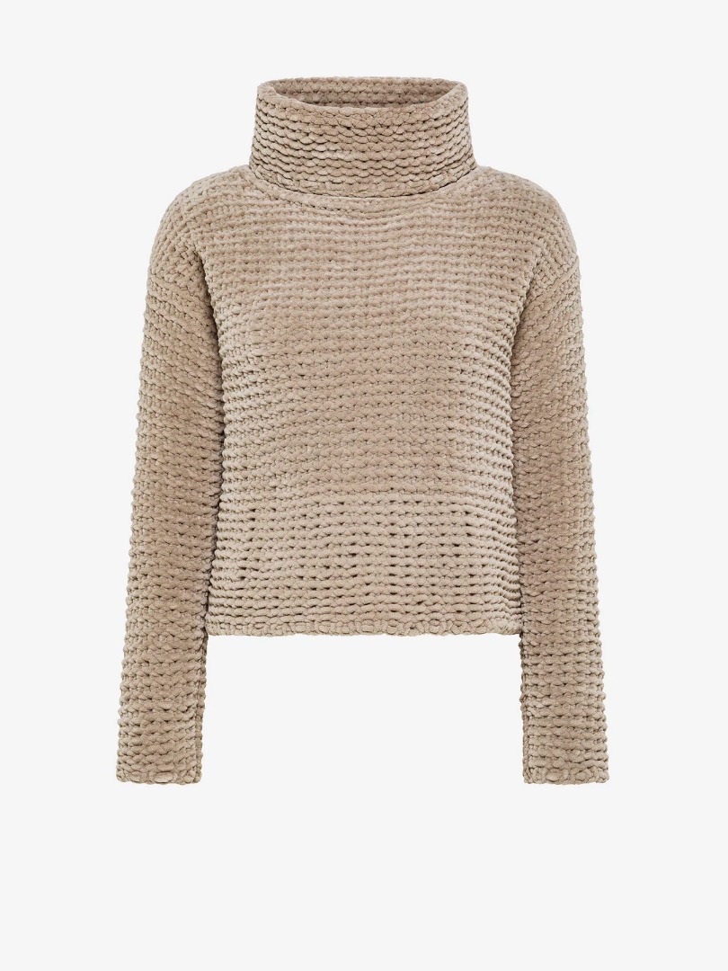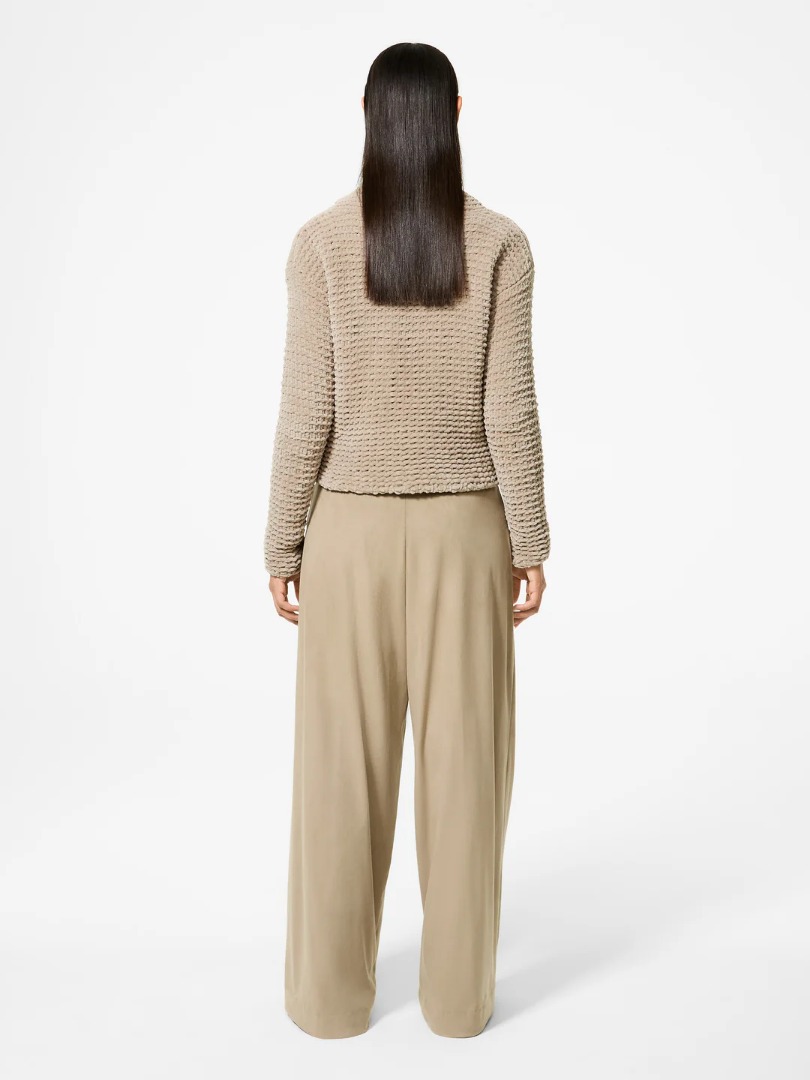 This sweater with a wide turtleneck stands out for its textured finish and jacquard weave, which gives the piece an authentic and understated sophistication. The cropped fit and boxy silhouette blend harmoniously to offer comfort and versatility, in a piece designed to face the cold season in style. The design delicately hugs the figure, suggesting contemporary pairings. Worn with a cropped oversized parka and carrot trousers from the Collection, it creates a contemporary and sophisticated look, perfect for everyday wear characterised by informal elegance.