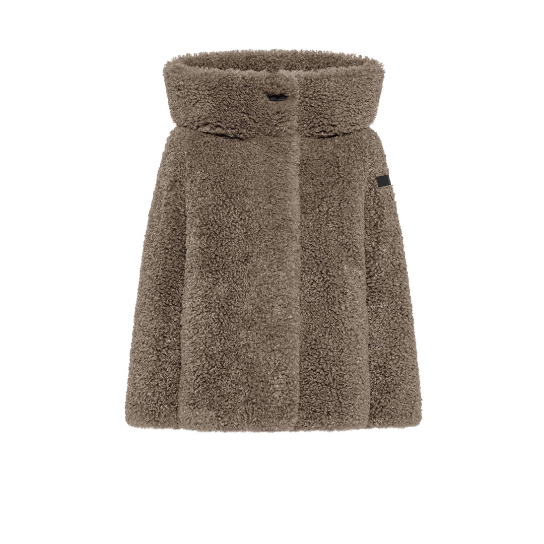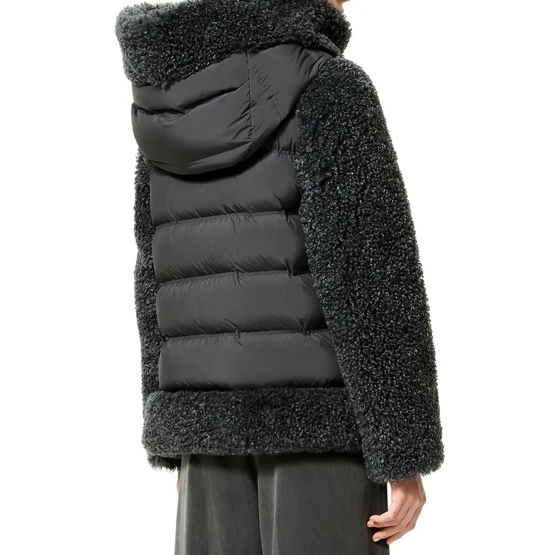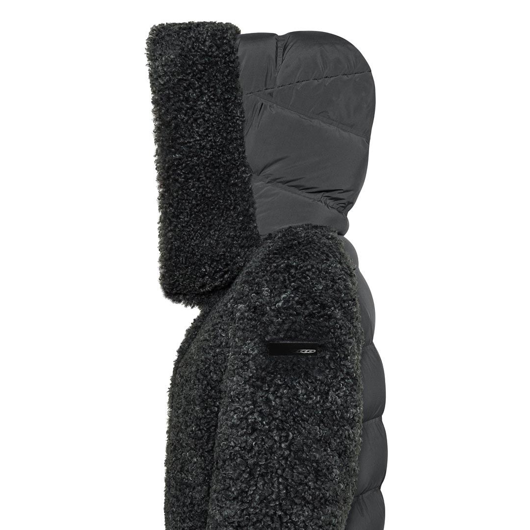 This versatile and distinctive outerwear piece stands out for its unique silhouette and construction of the front and sleeves, embellished with warm and enveloping faux teddy fur. The back features tubular channels containing the soft, warm duck down padding, offering exceptional comfort and lightness. The large, dramatic hood combines the two textures, enveloping the face and lending the design a unique and sophisticated allure. The hip-length design, invisible pockets, and concealed double-slider zip closure are the distinctive details that enhance its minimalist character and functionality. Perfect for a sporty-chic style, the Lamb Hybrid Hood Women's Jacket is the perfect way to elegantly face the coldest winter days.