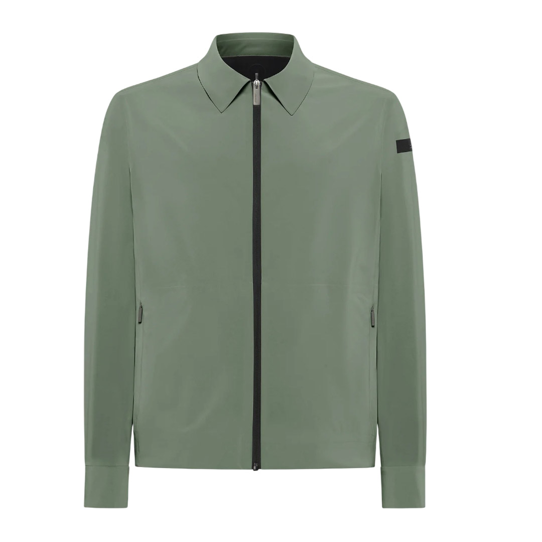 This summer jacket is made of a cool, lightweight, and wrinkle-resistant technical fabric, easily packable into a travel bag. The innovative silicone-coated finish gives the garment a surprisingly soft and tactile texture. The streamlined silhouette is enhanced by the heat-sealed front zipper and shirt collar, while the practical side pockets with invisible zippers maintain the clean lines. The cuffs close with satin-finish metallic snaps. The interior pocket with a hidden closure featuring a double fluorescent orange welt, the heart-shaped "Made with love, designed in Tuscany" tag, and the black micro-injected logo on the left sleeve complete the jacket with refined details. A versatile and contemporary piece, perfect for pairing with chinos for a distinctive, casual summer elegance.