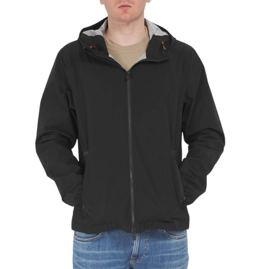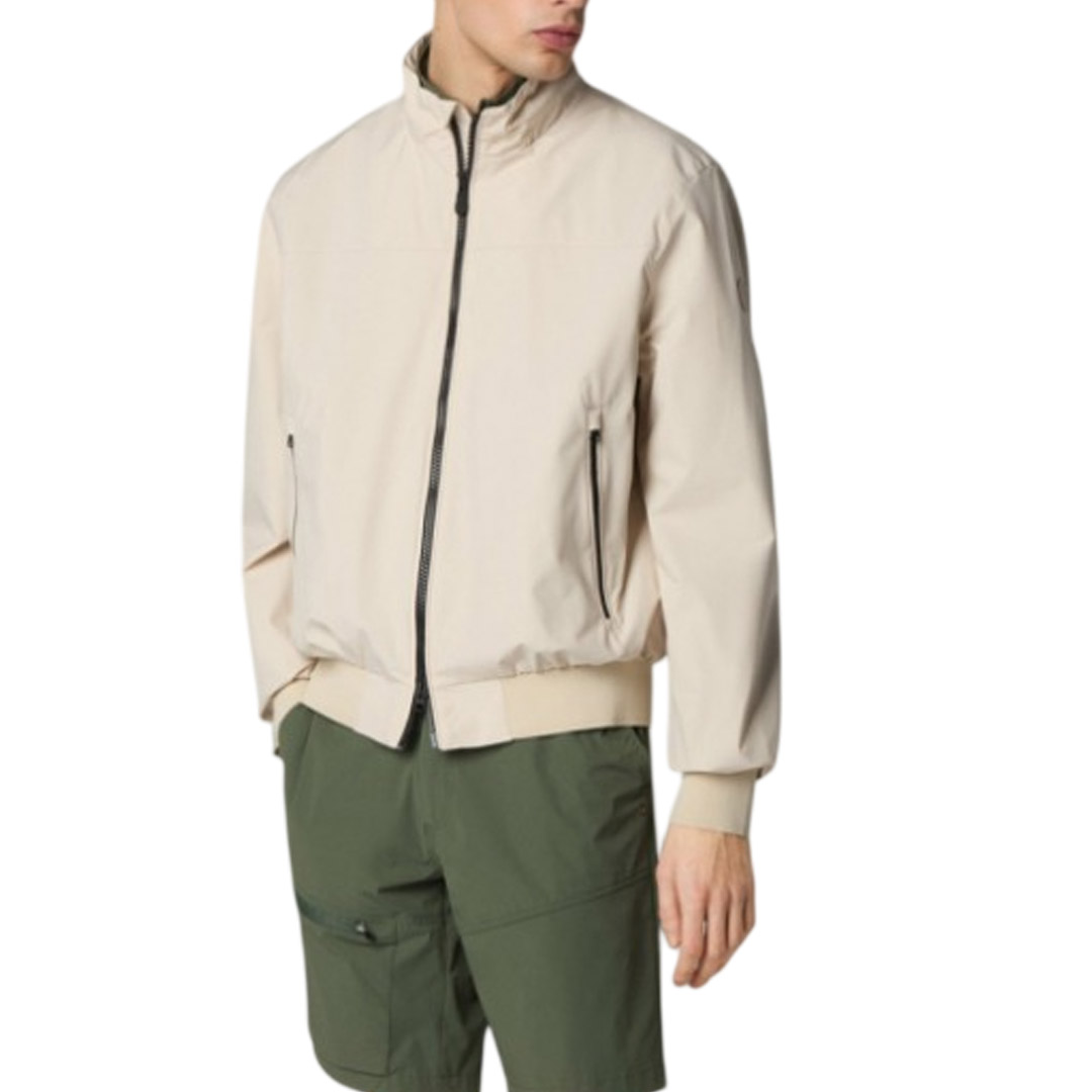 The men's Finlay waterproof jacket redefines the classic Harrington look with windproof and water-repellent fabric. Designed with a high collar, partially taped seams, and ribbed trims at the hem and cuffs, it features practical side pockets and an inside pocket. Personalized details like the custom zip puller and round logo on the sleeve add the unmistakable Save The Duck touch.