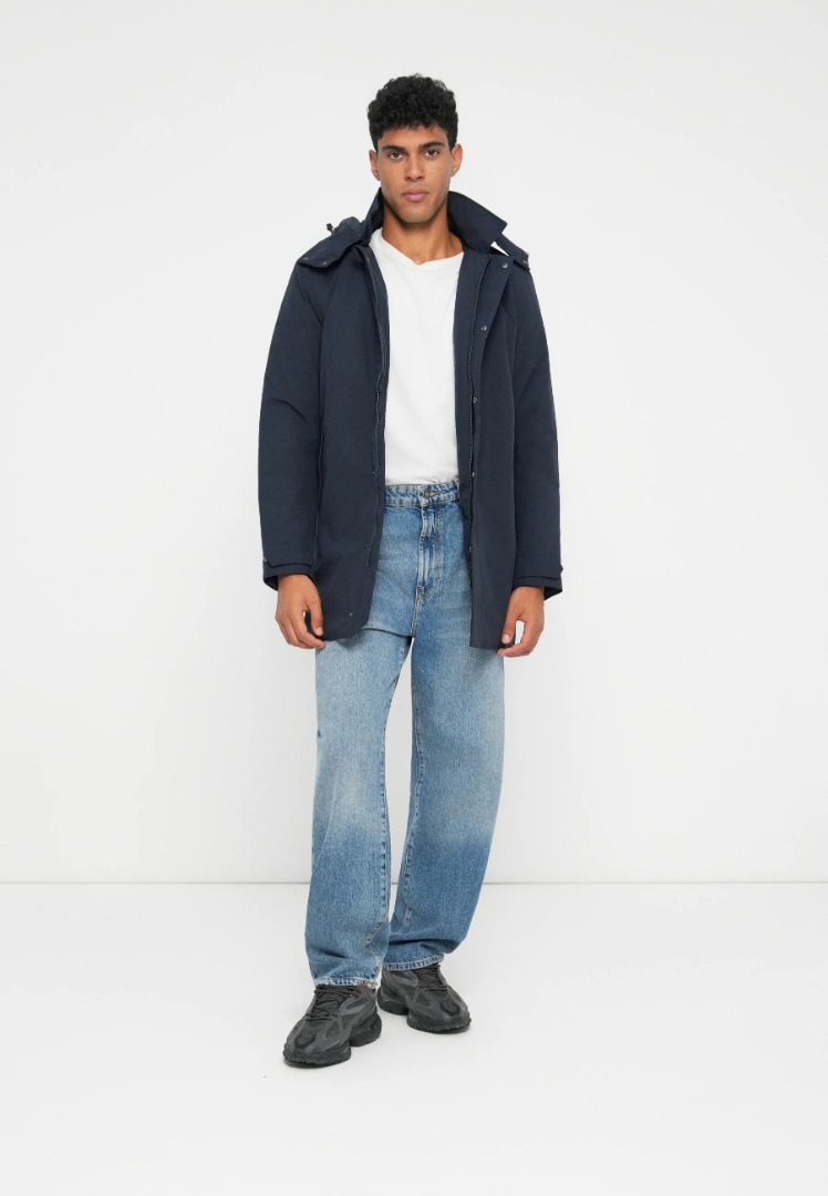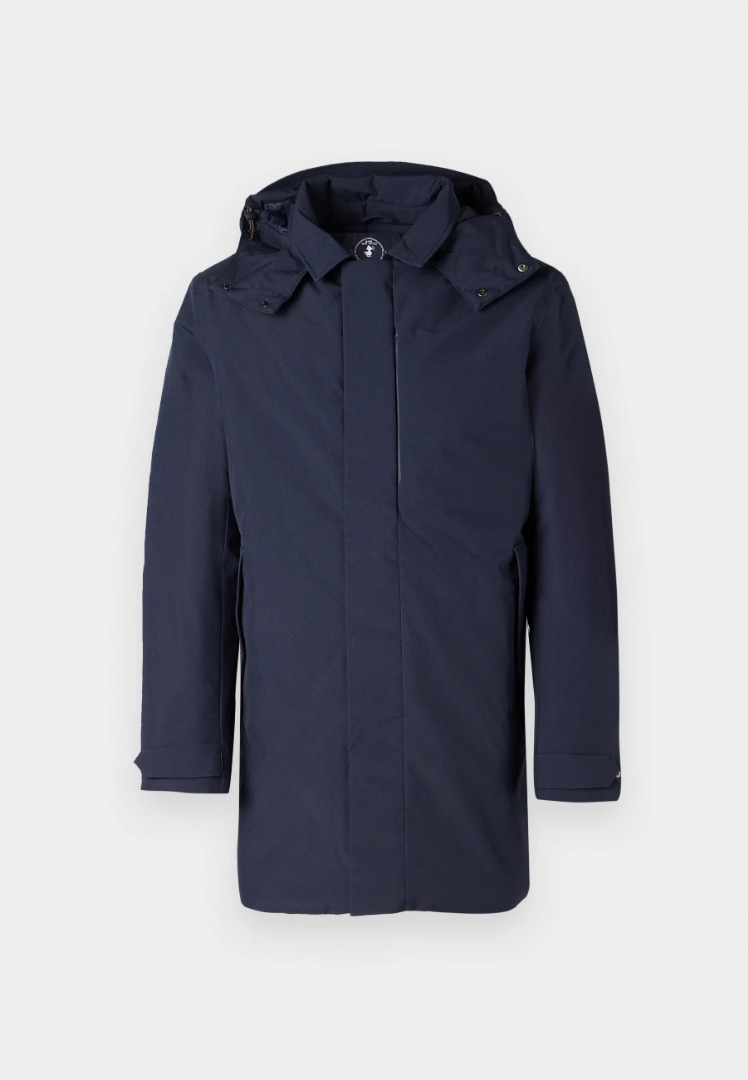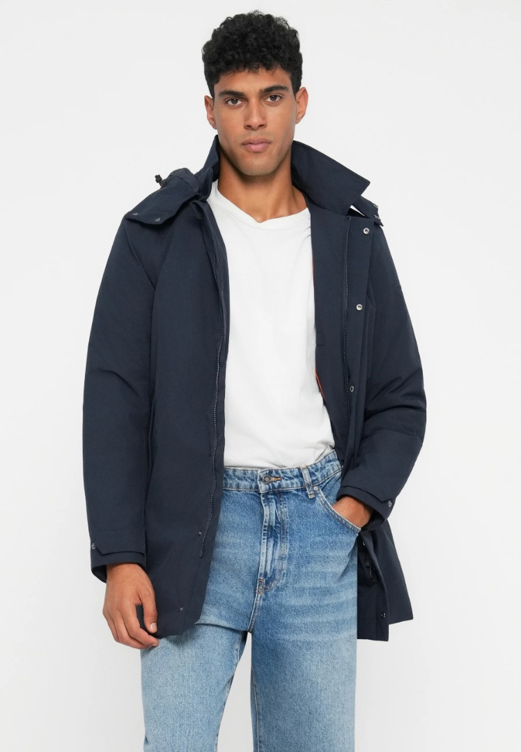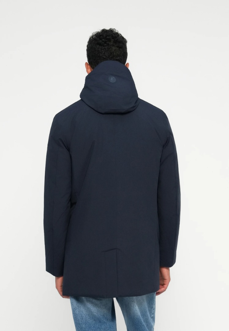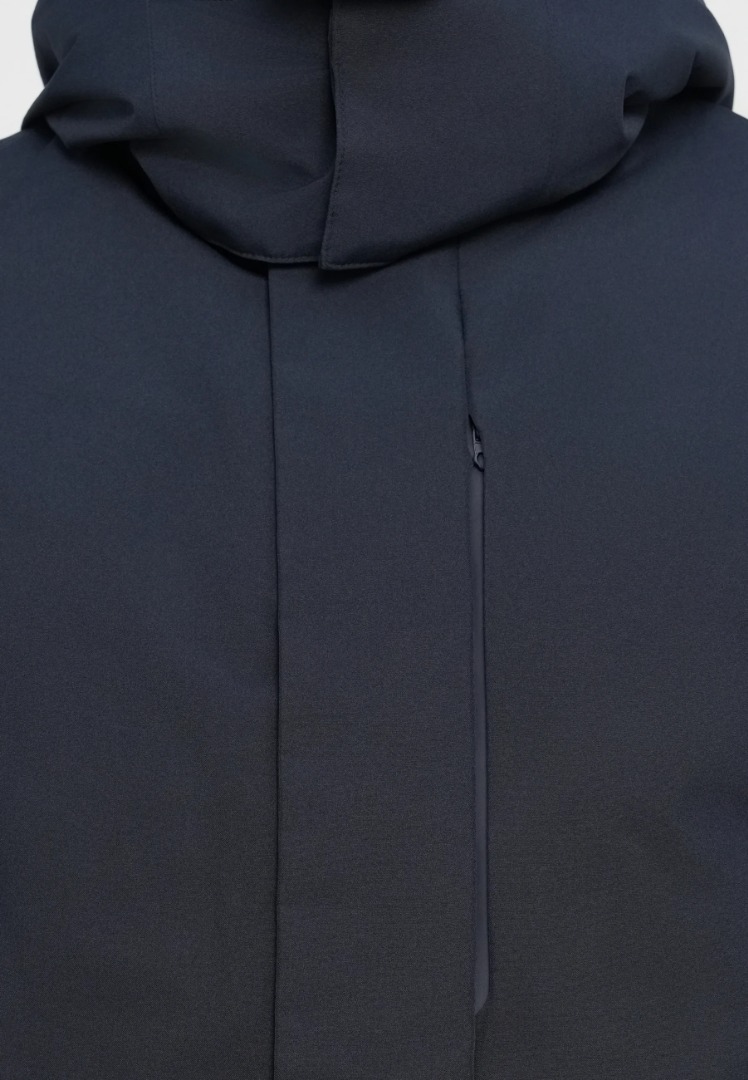 Made from three-layer recycled polyester. Padded with a removable hood. Two-way zip closure, concealed by a snap-button flap. Zip pockets, adjustable cuffs.