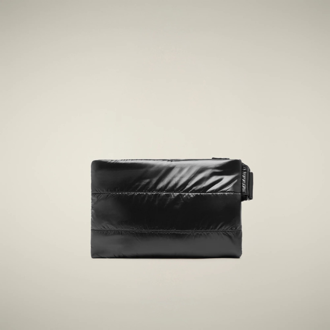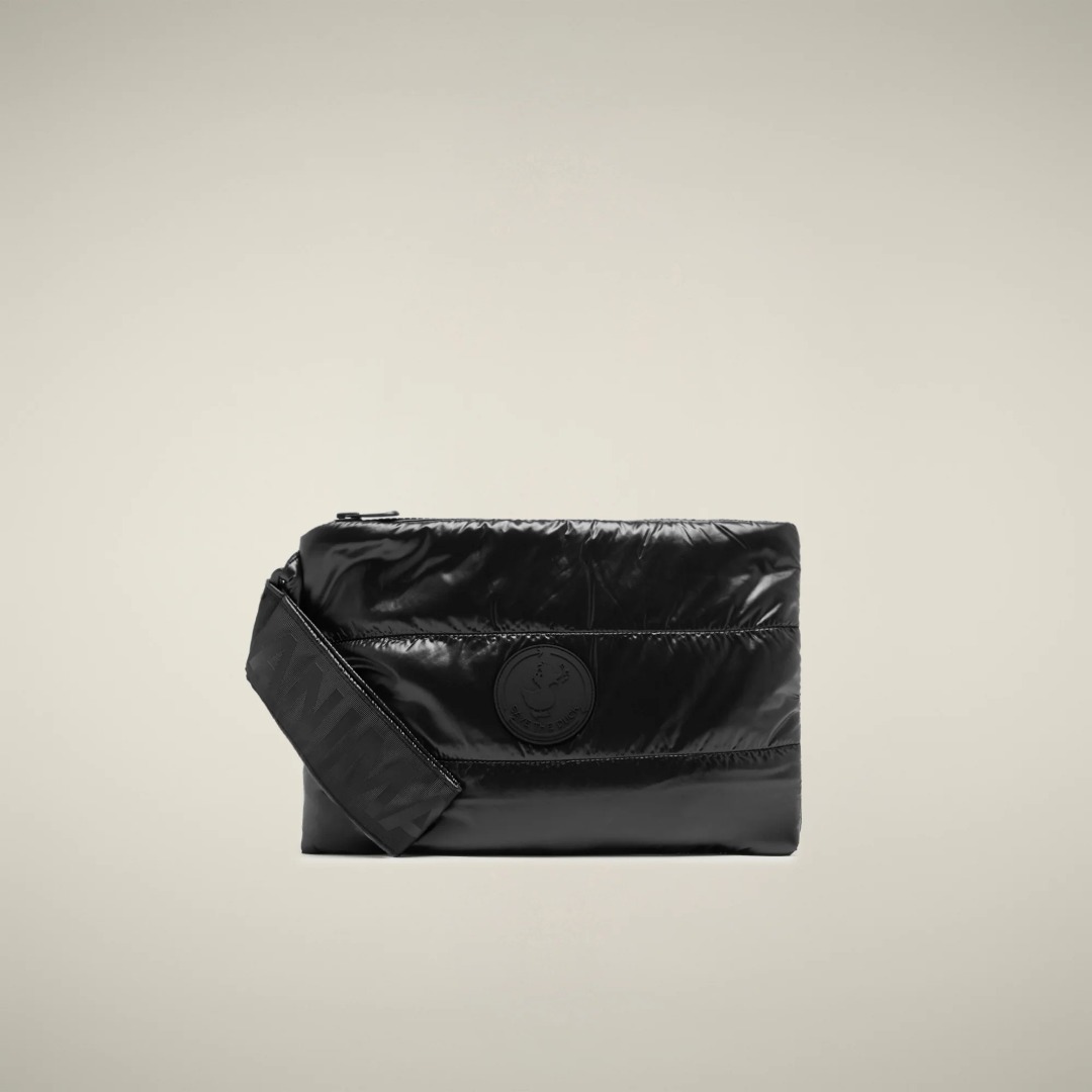 Keep your travel essentials safe with our Cocos clutch. Crafted from quilted fabric with a glossy finish, this wristlet features a convenient strap with an ANIMAL FREE print. Its rectangular shape and top zip opening ensure easy access, while interior pockets keep things organized.