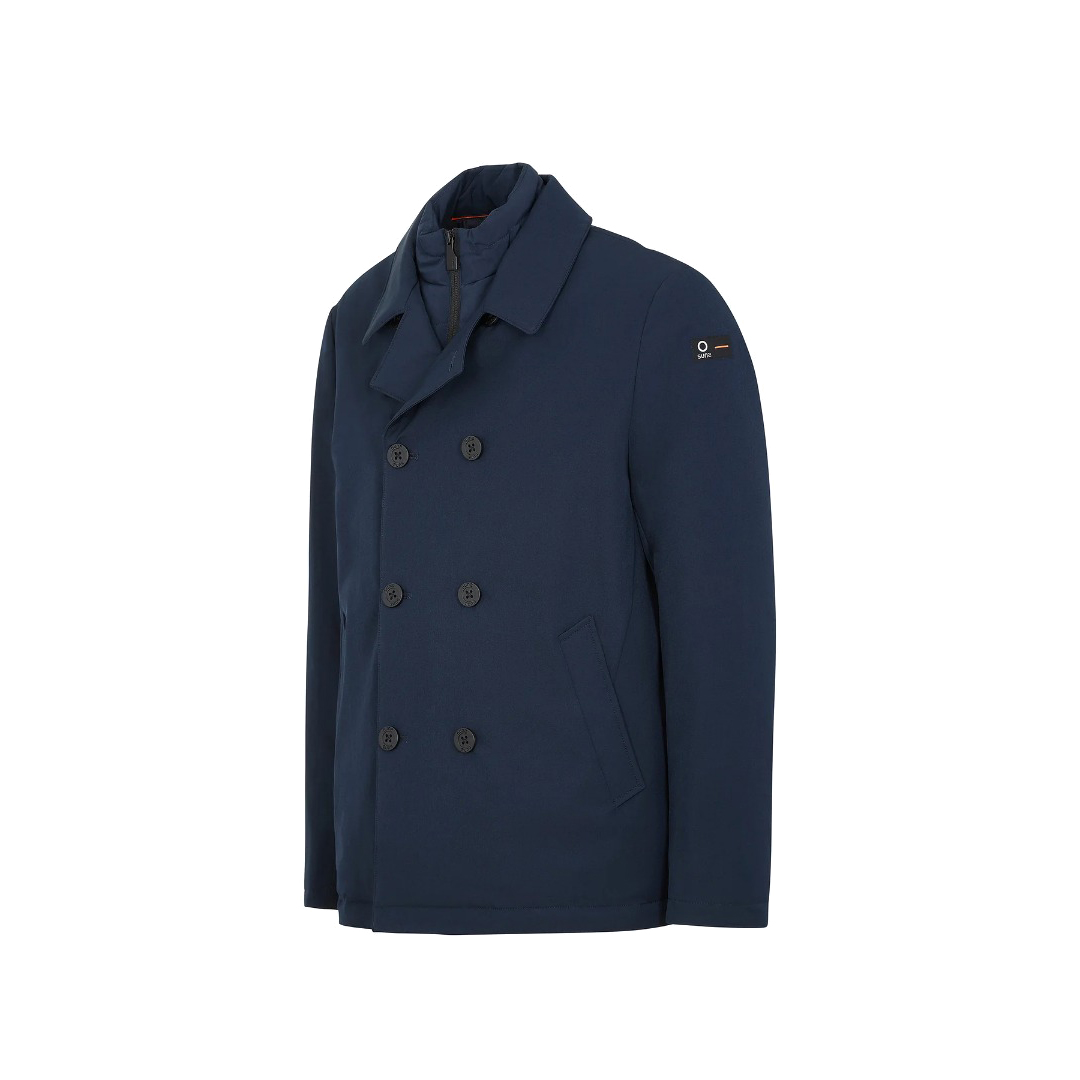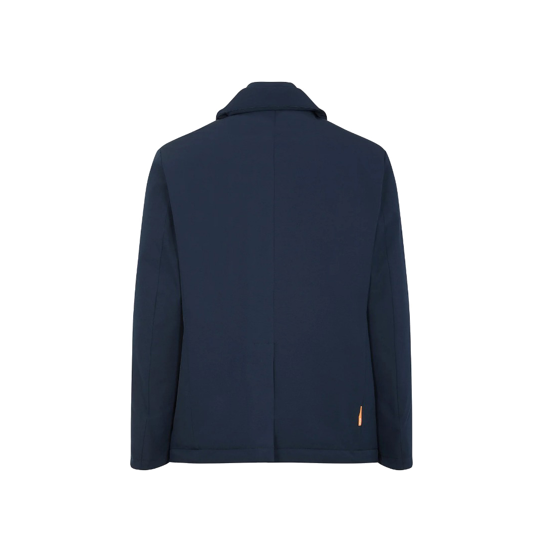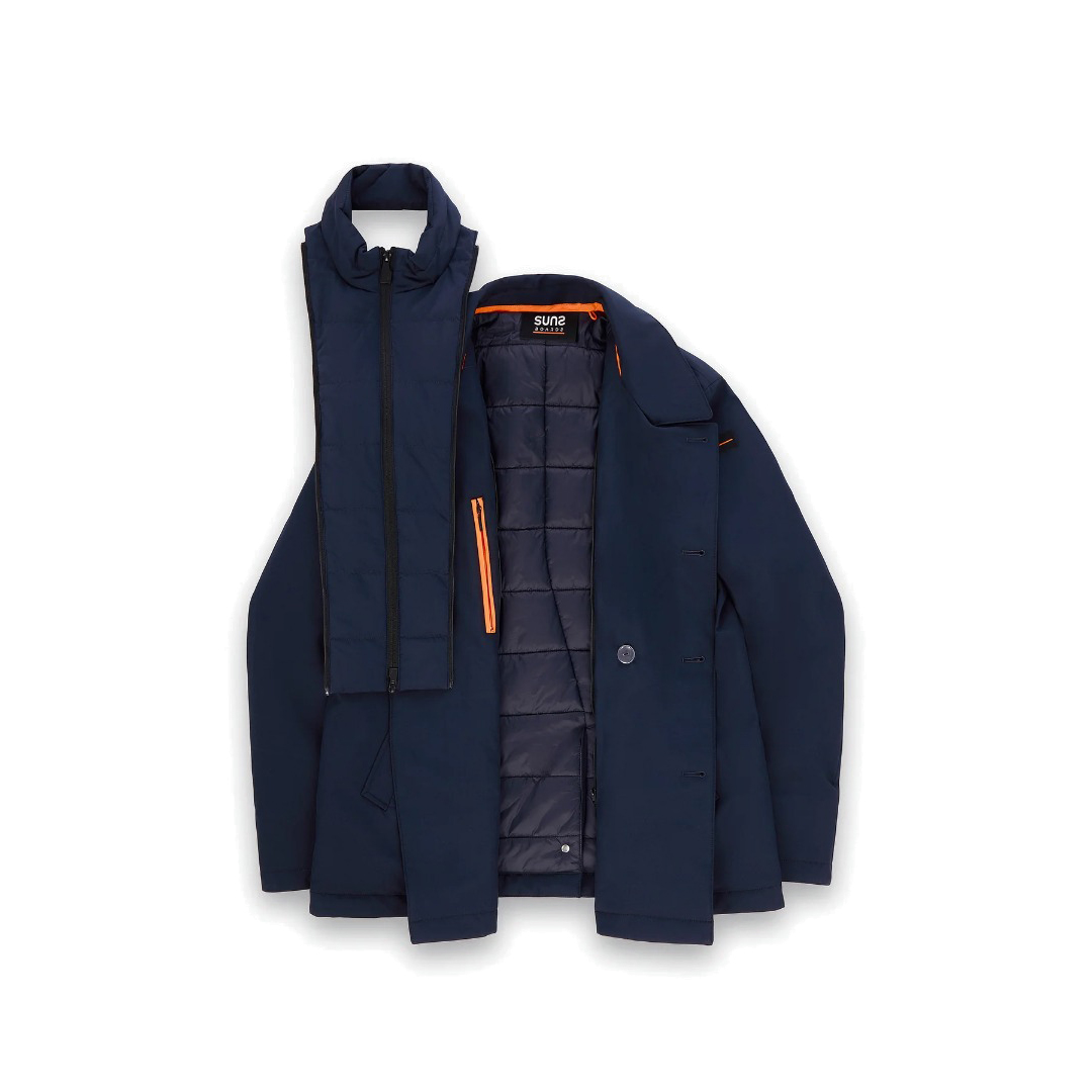 A classic-cut double-breasted men's jacket reinterpreted with a technical twist. The Coat Tech model stands out for its 4-way stretch fabric with a TPU membrane that guarantees protection and flexibility, while maintaining a clean and essential aesthetic. The lightweight polyfil padding ensures the right thermal comfort during the cold season. Inside, the quilted tone-on-tone nylon lining and the zipped inner collar add a functional and protective layer. Double-breasted with button closure: classic style with a modern line. Technical stretch fabric with TPU membrane: flexibility and protection against wind and cold. Lightweight polyfil padding: warmth without bulk (120 gsm body / 100 gsm sleeves). Quilted inner lining: tone-on-tone 380T nylon for comfort and thermal insulation. Black Lycra inner cuffs: for a comfortable and windproof fit. Zipped inner collar: practical detail for added protection. Unzipped welt pocket: clean and functional design. Orange trim: distinctive Suns detail.